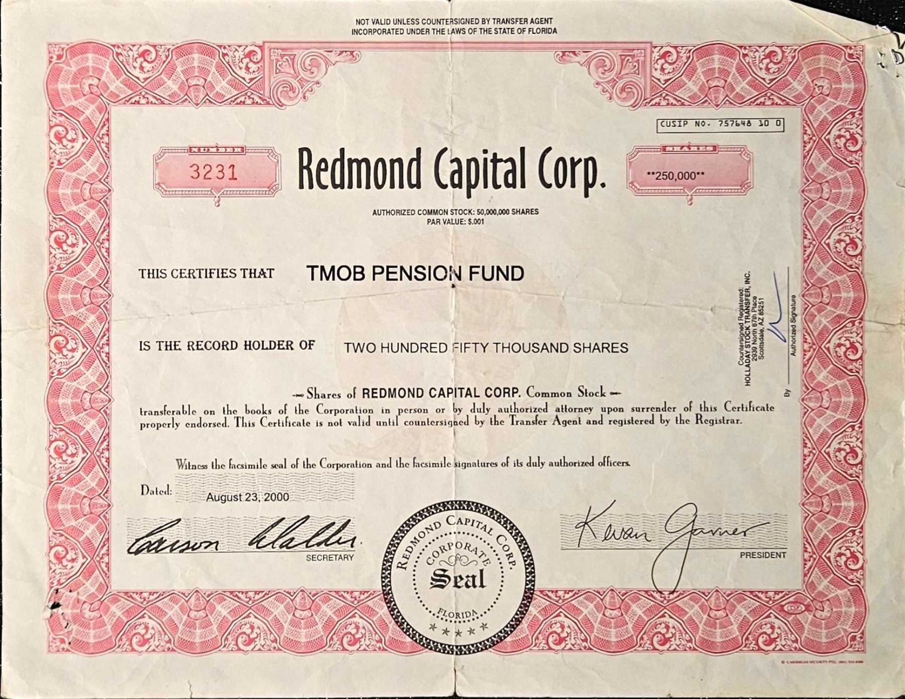 Lot 158 Vintage Stock Certificate (2000, Redmond Capital Corp.)