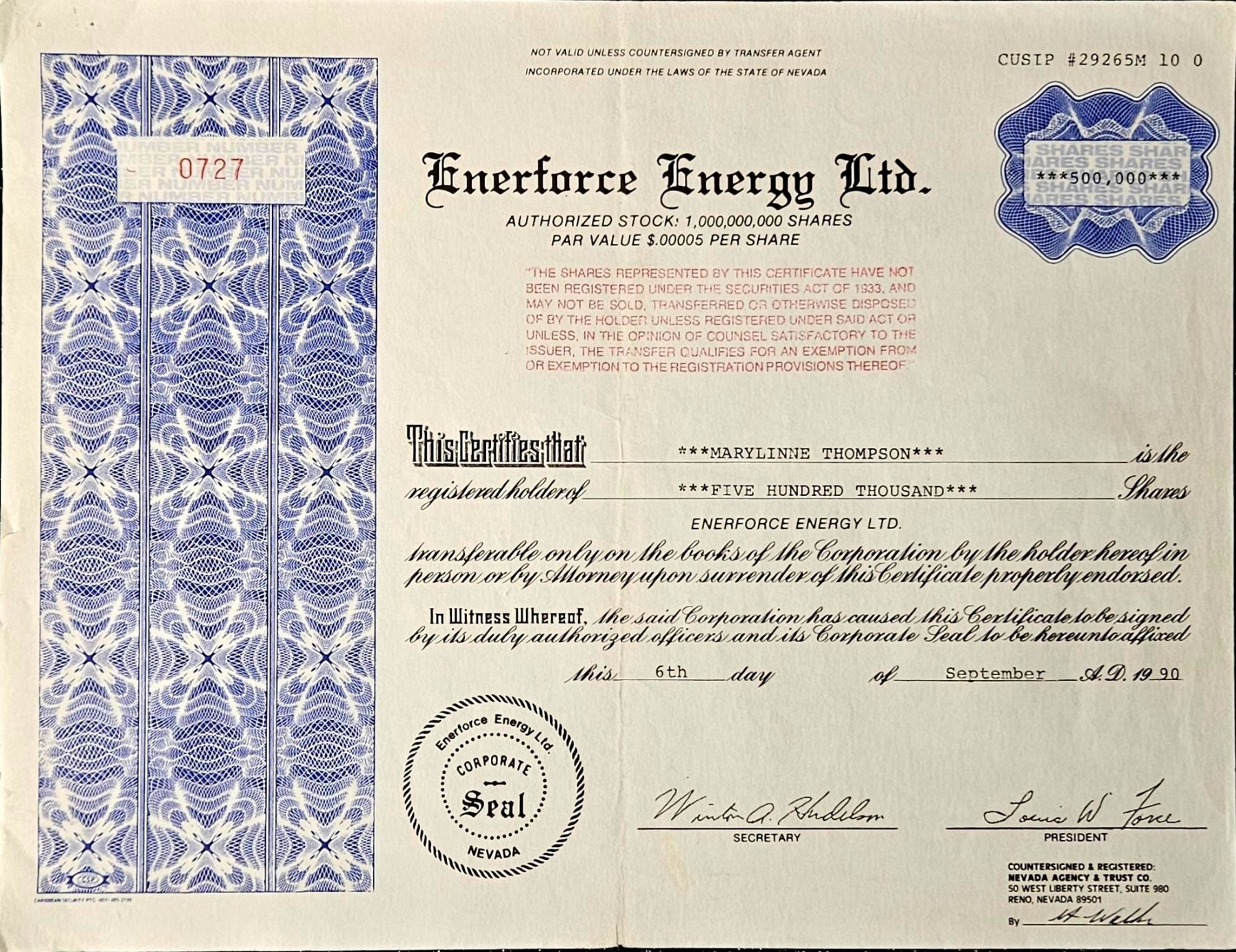 Lot 159 Vintage Stock Certificate (1990, Enerforce Energy Ltd.)