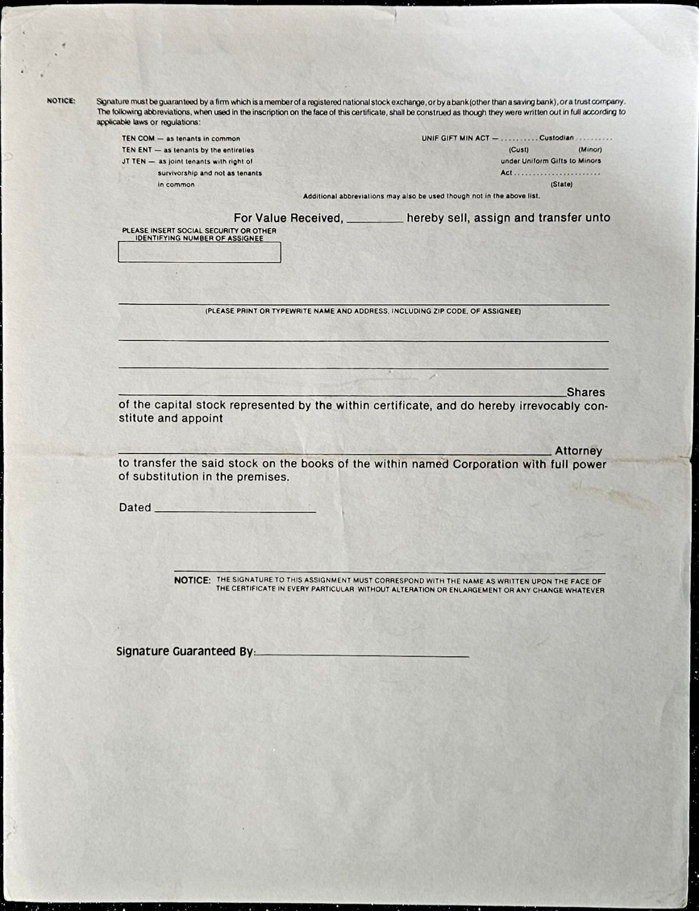 Vintage stock certificate with its authenticity papers.