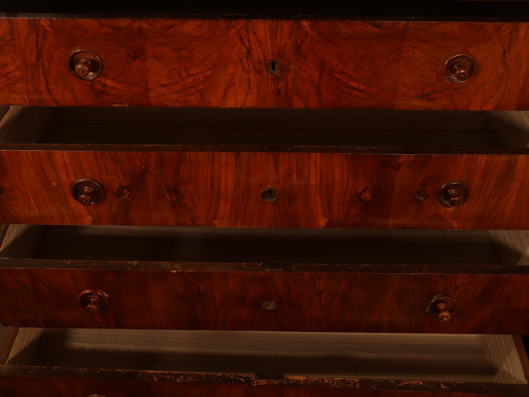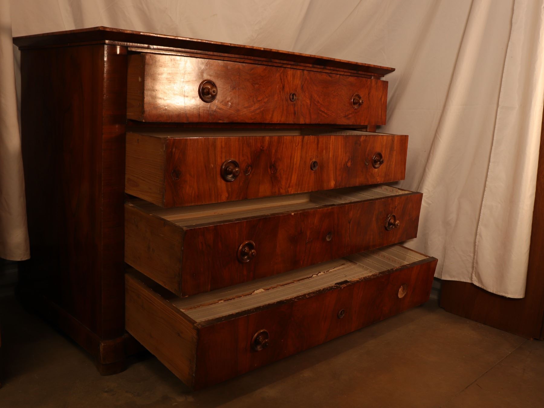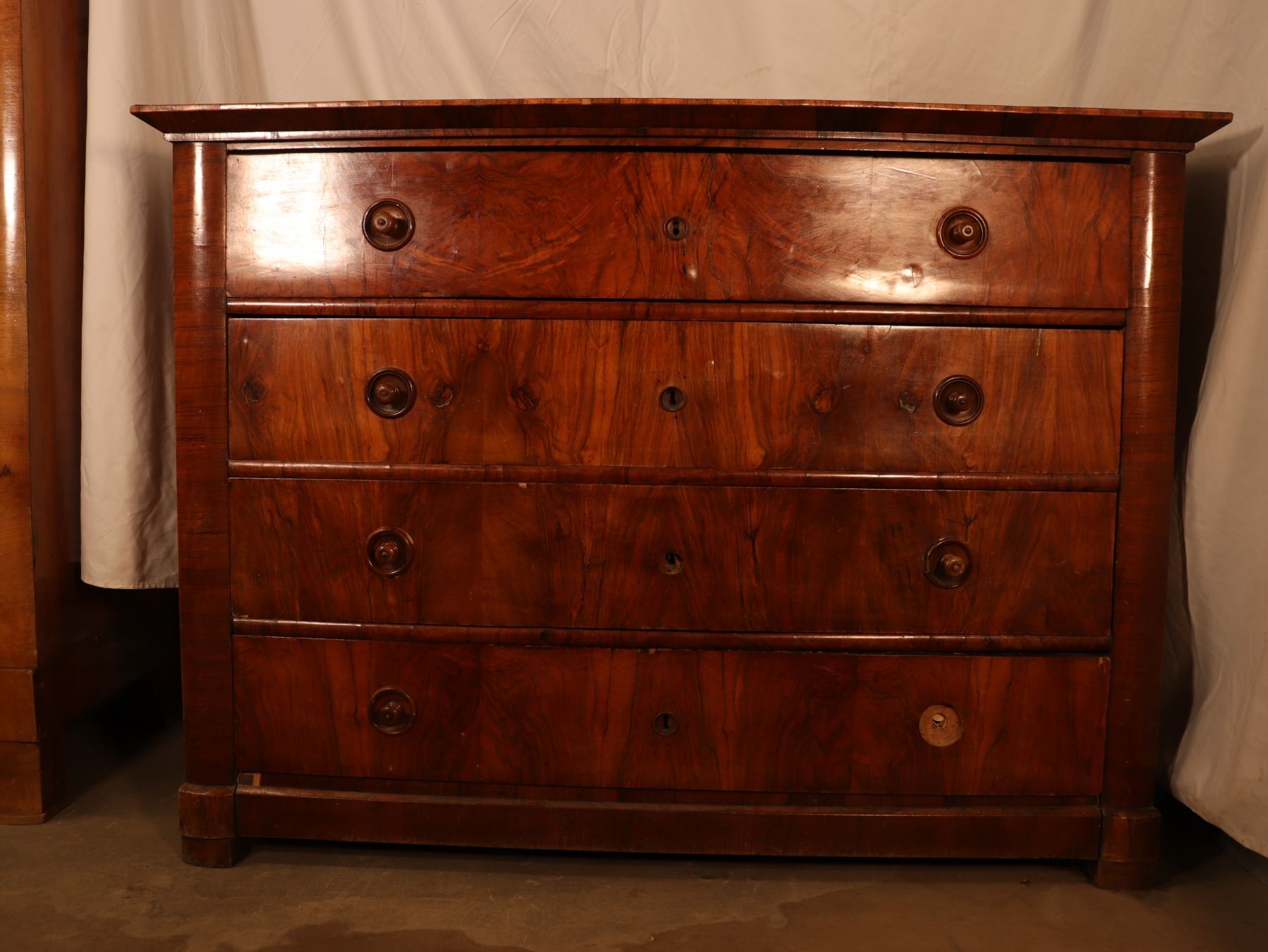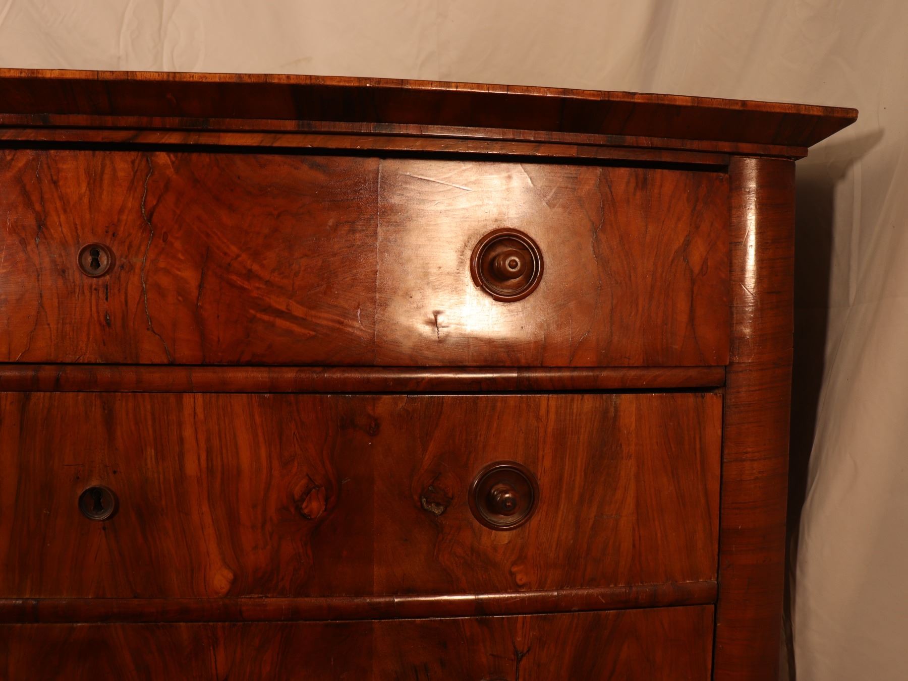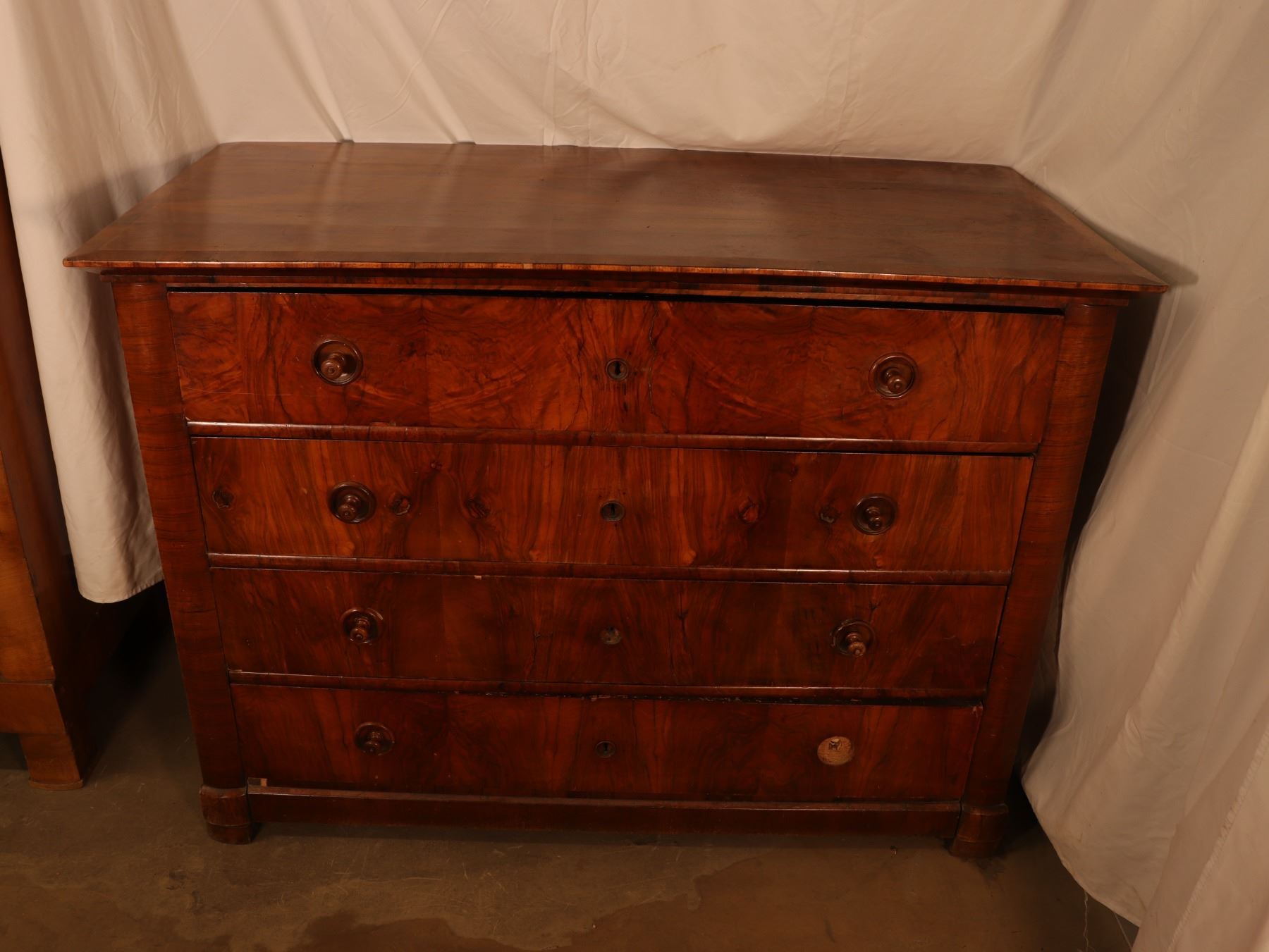 Four-drawer Biedermeier chest in figured walnut veneer with matched drawer fronts and turned pulls. Surface wear, scattered veneer losses, and age-related handling marks visible. 25x51x37