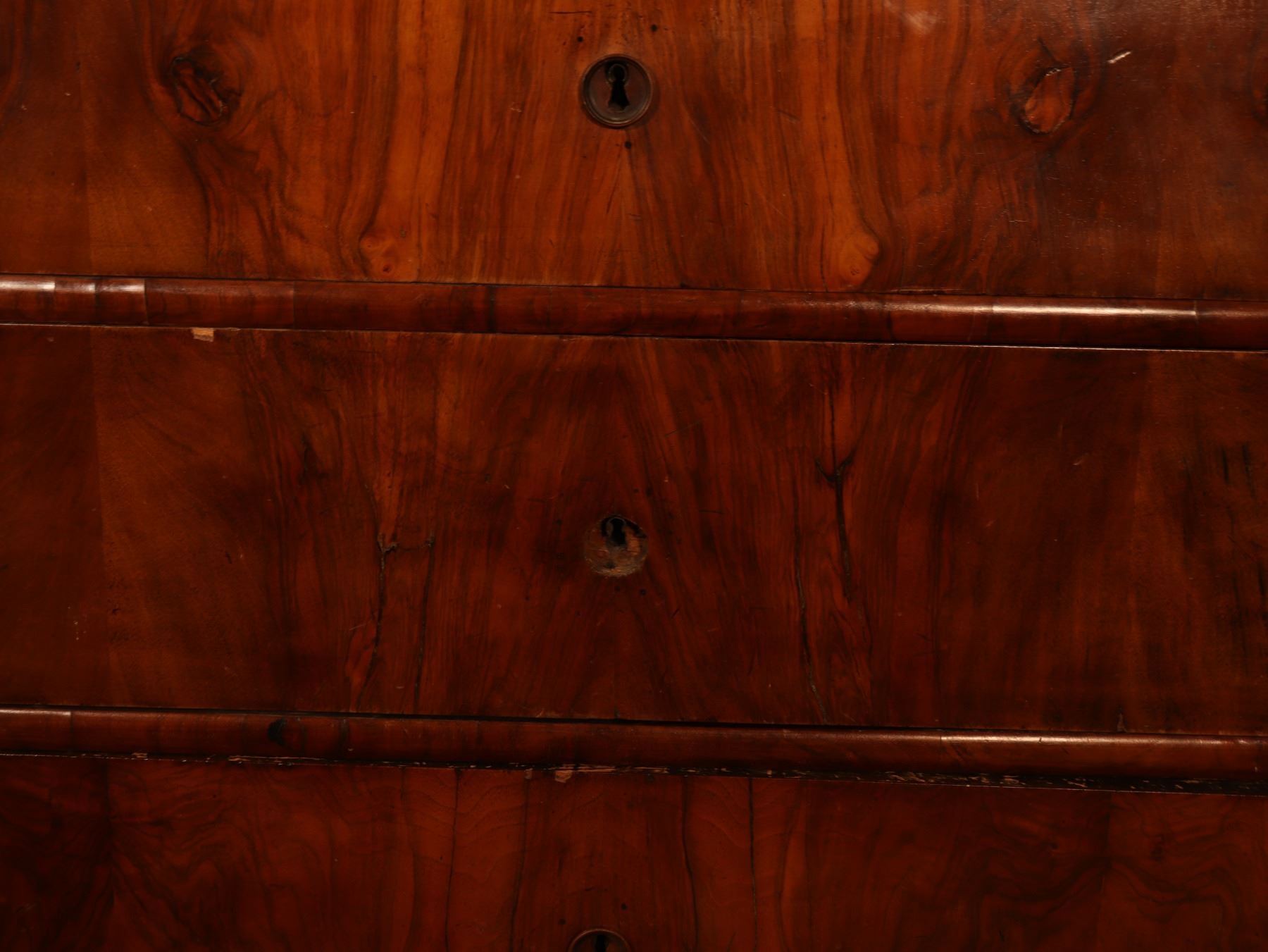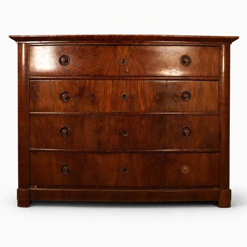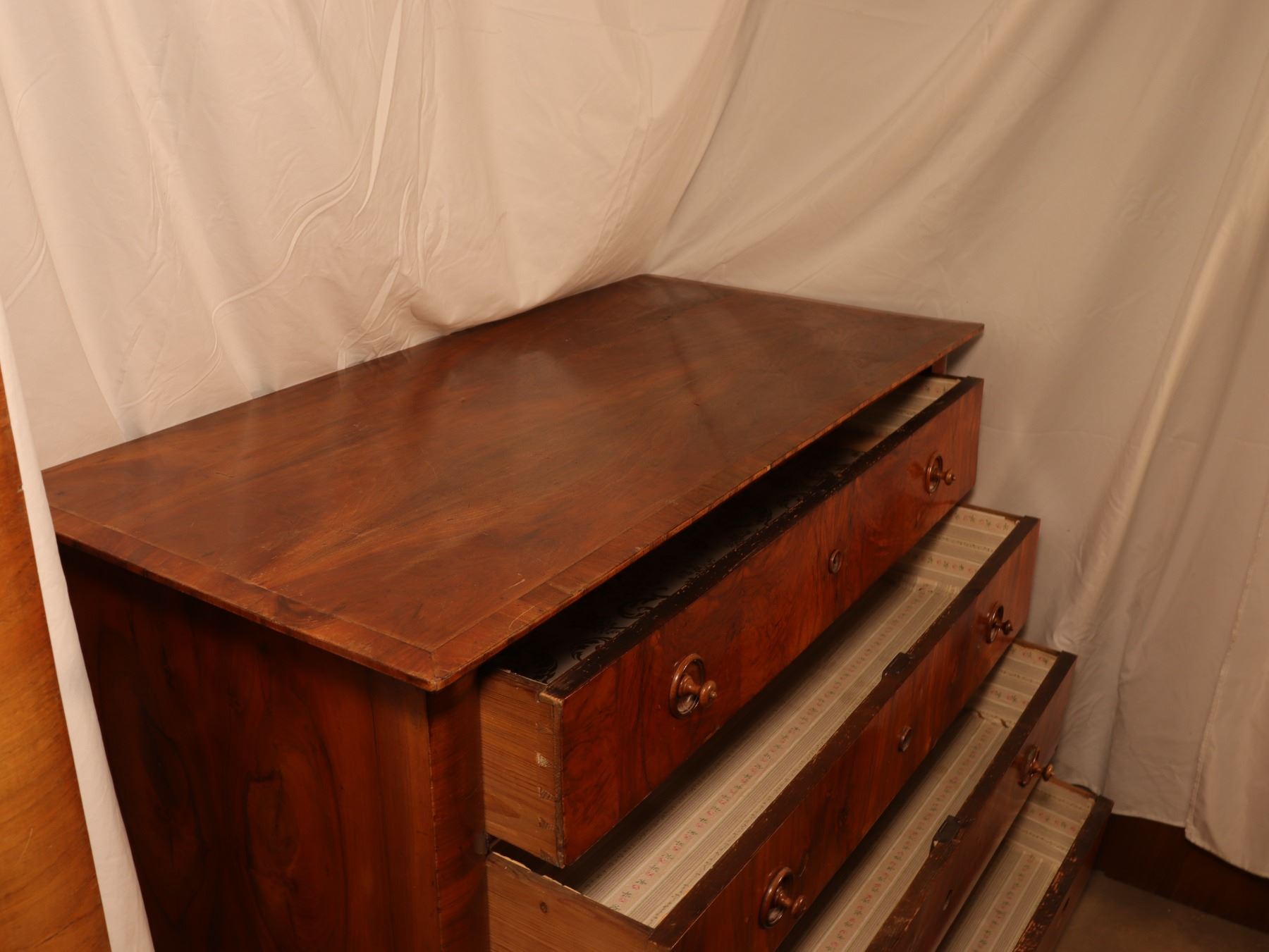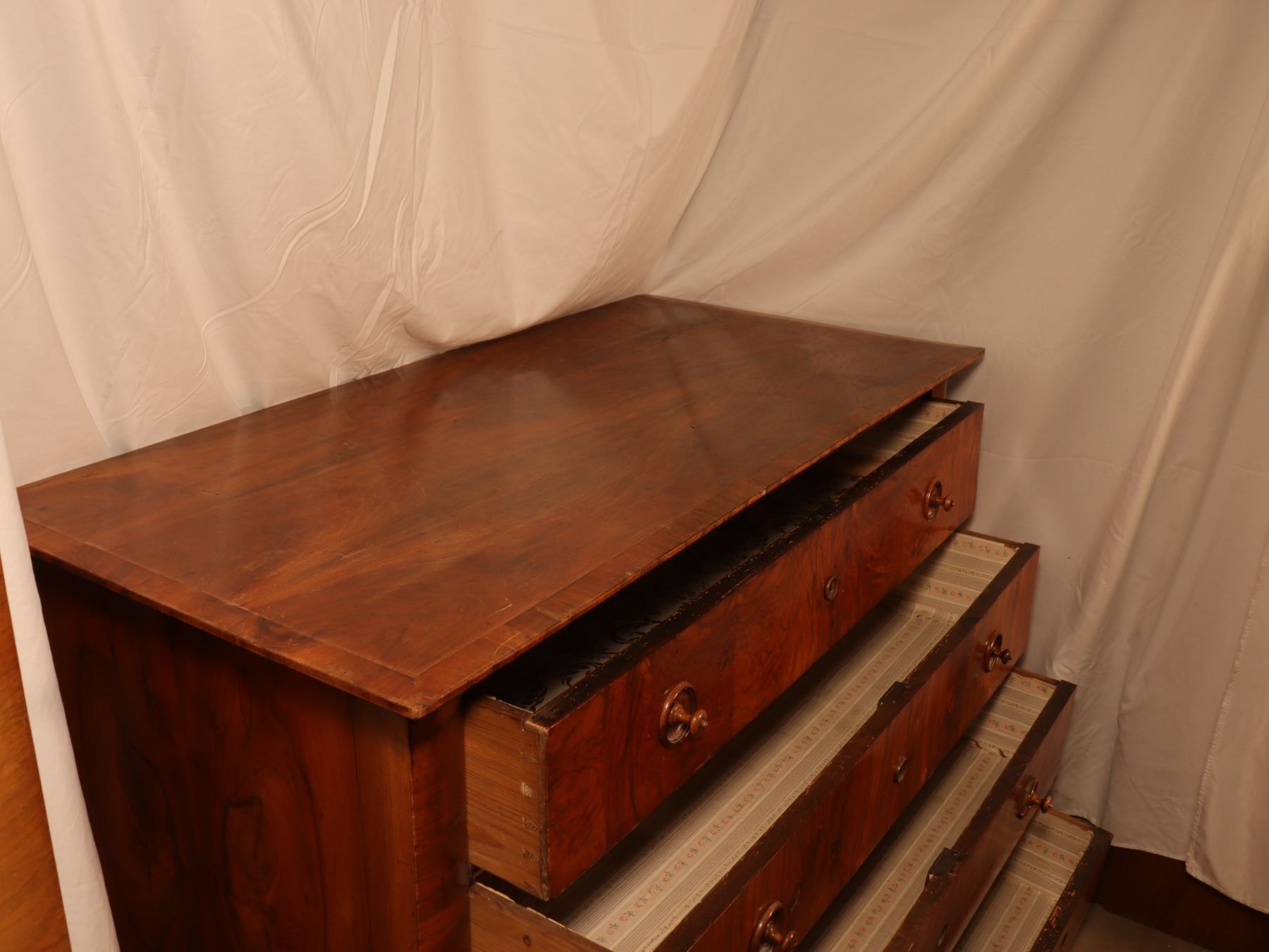 Four-drawer Biedermeier chest in figured walnut veneer with matched drawer fronts and turned pulls. Surface wear, scattered veneer losses, and age-related handling marks visible. 25x51x37