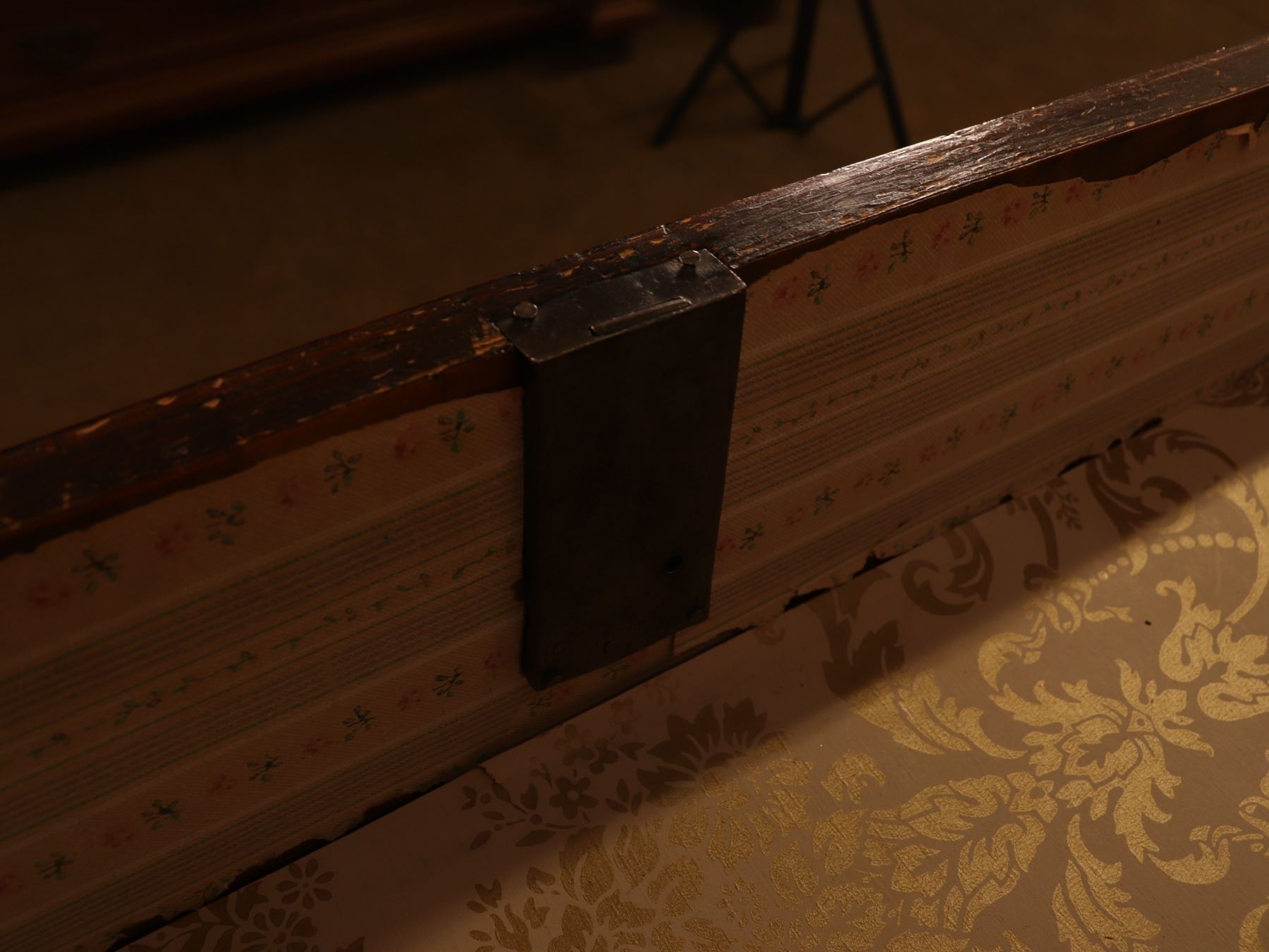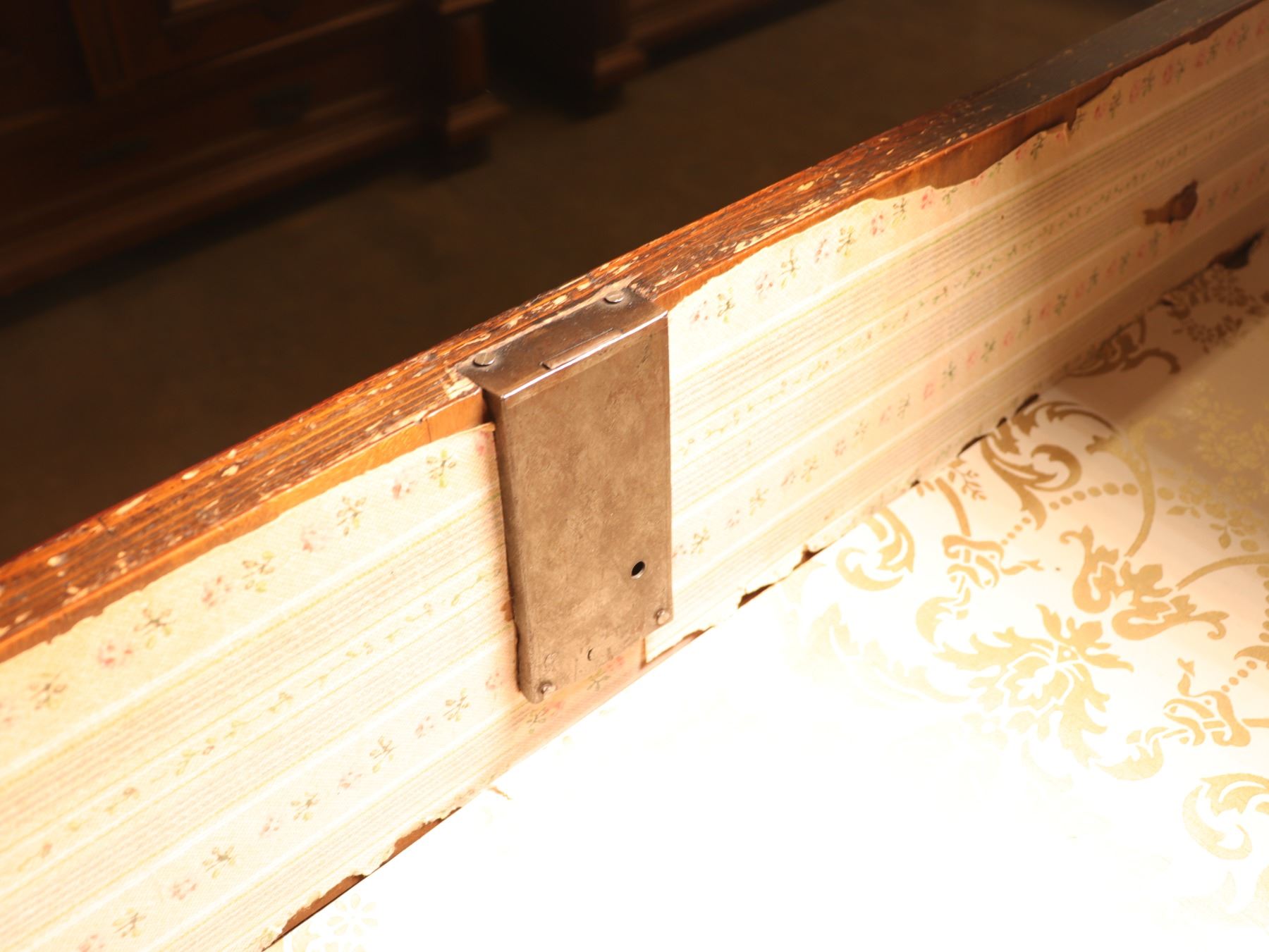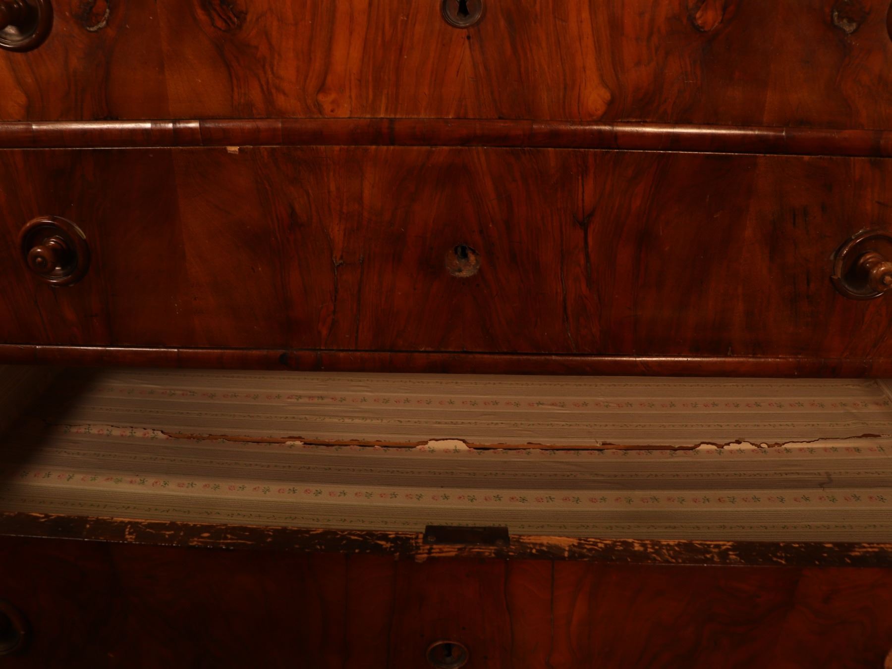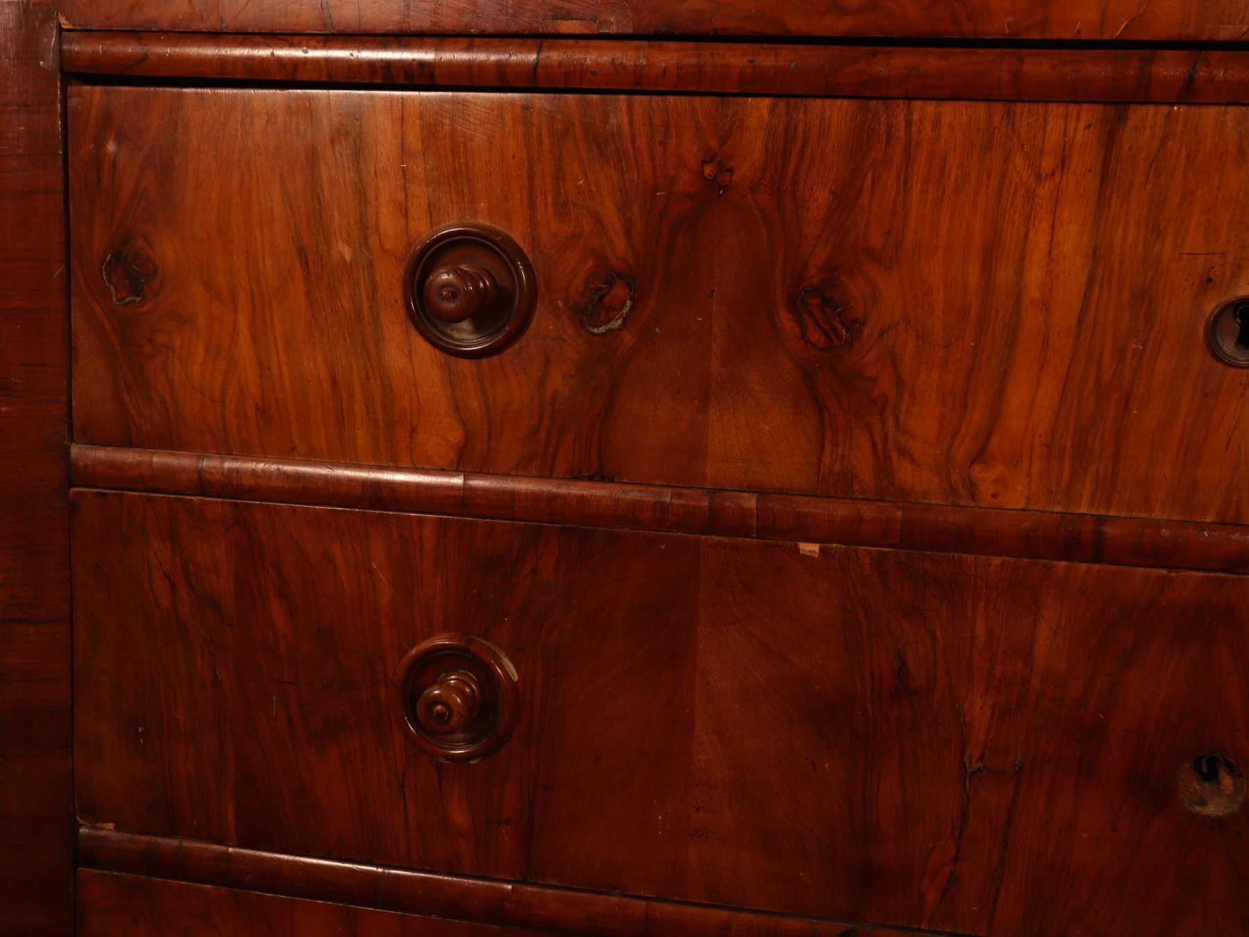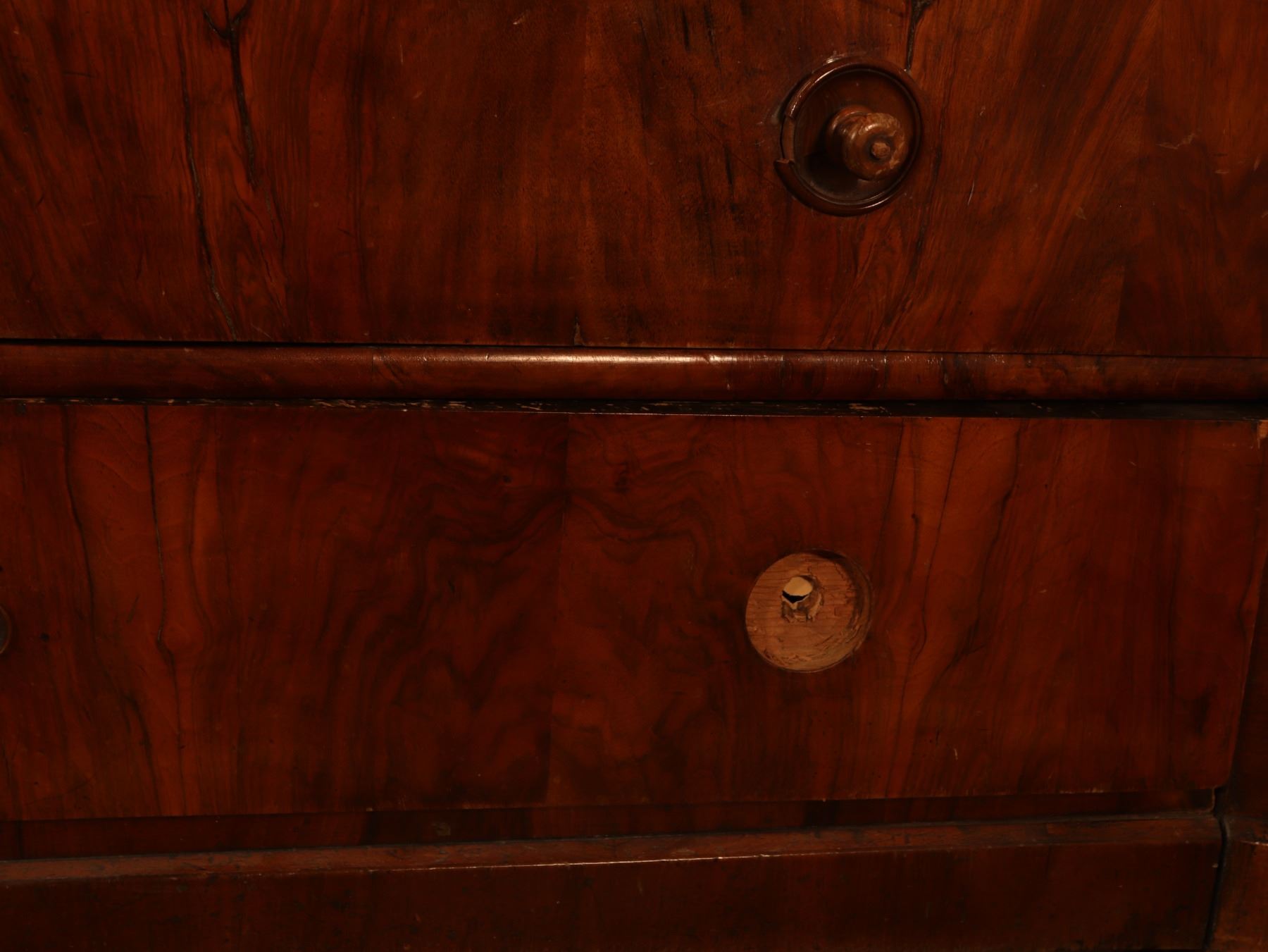 Four-drawer Biedermeier chest in figured walnut veneer with matched drawer fronts and turned pulls. Surface wear, scattered veneer losses, and age-related handling marks visible. 25x51x37