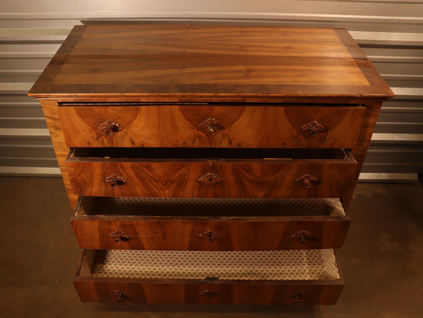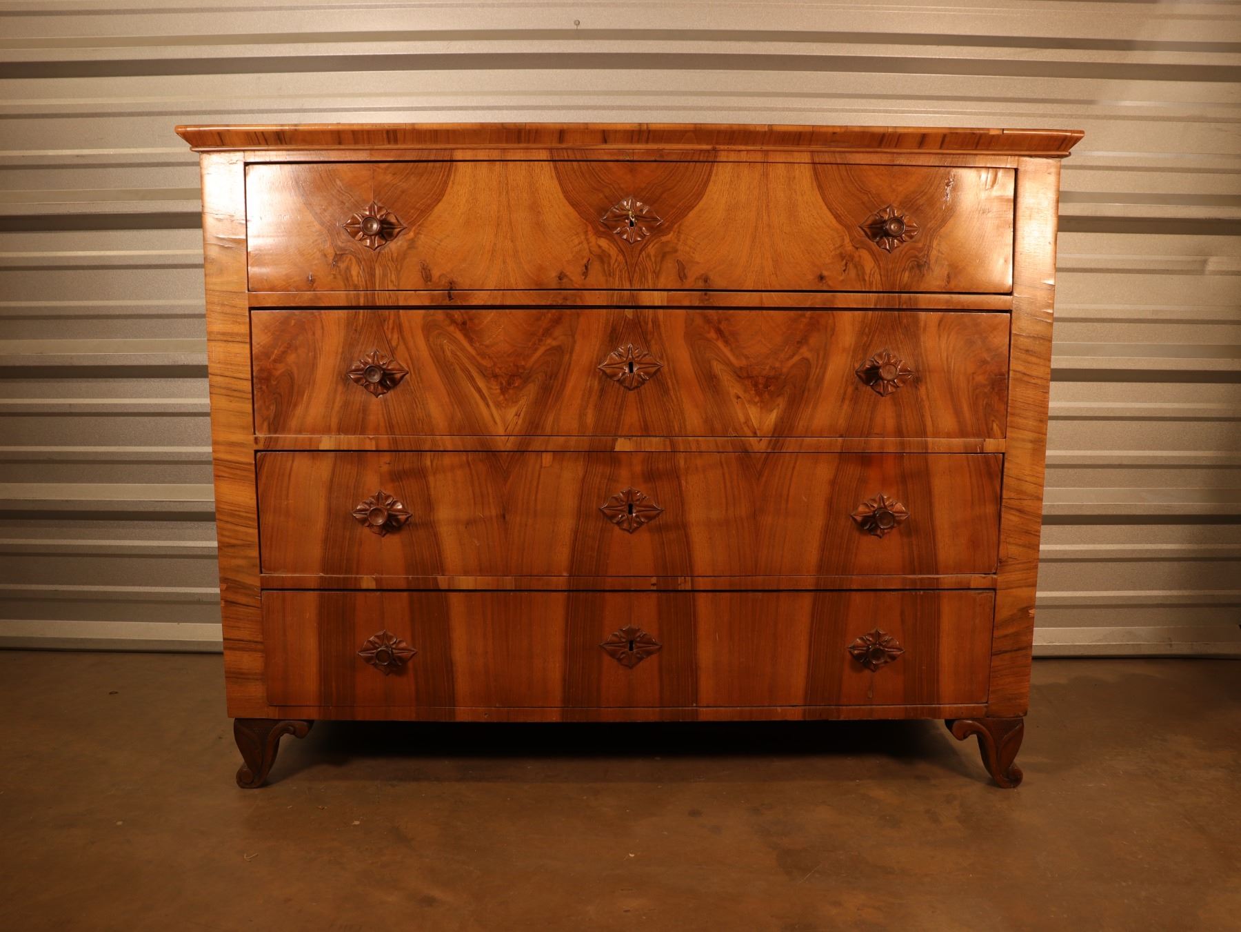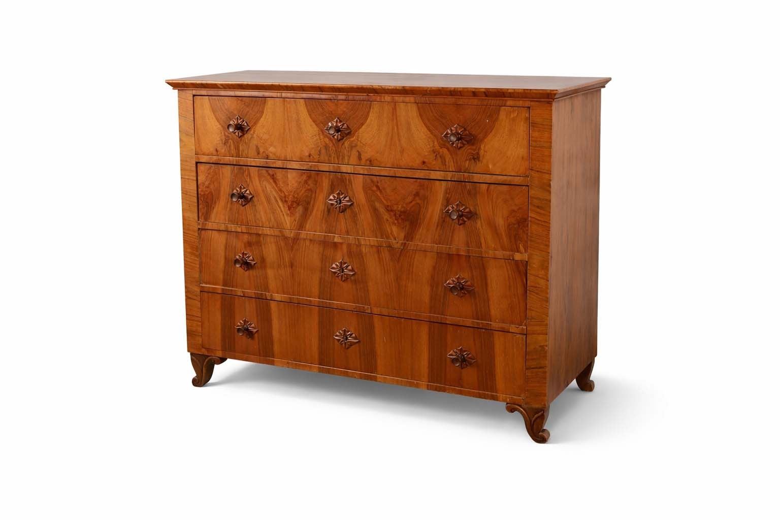 Four-drawer Biedermeier chest in figured walnut veneer with strong book-matched fronts and shaped feet. Drawers retain patterned lining; light wear and minor veneer issues from age and use.25x51x40
