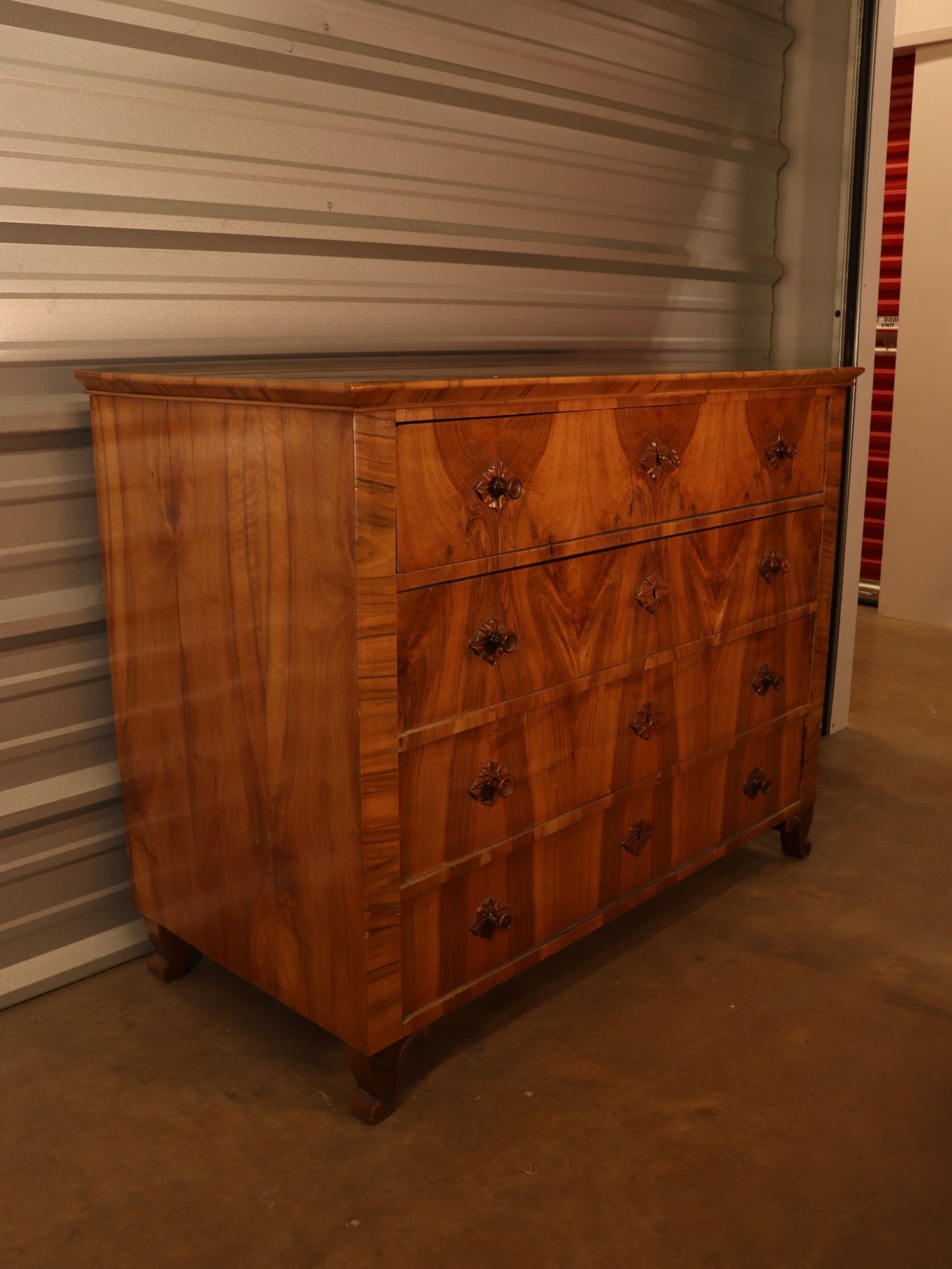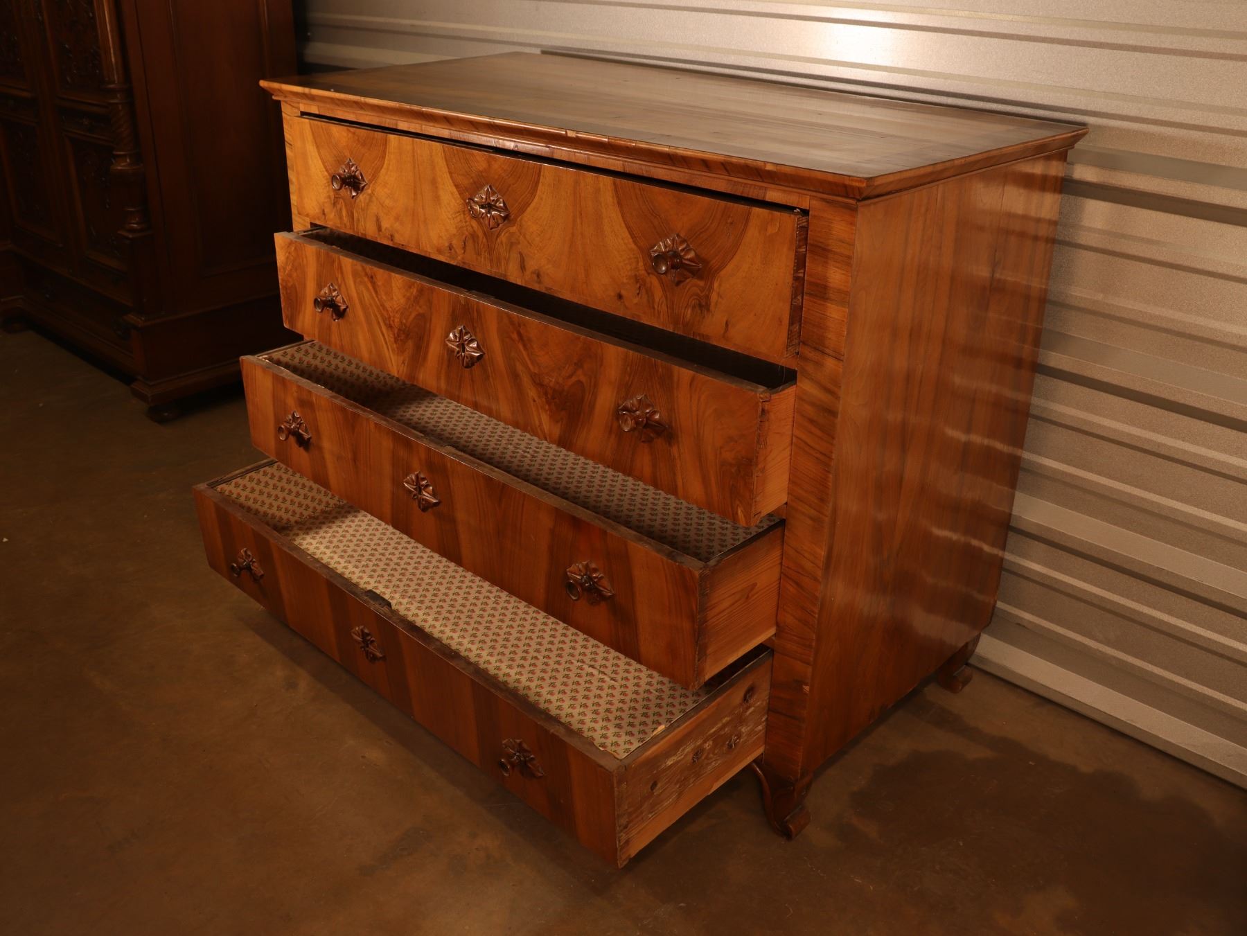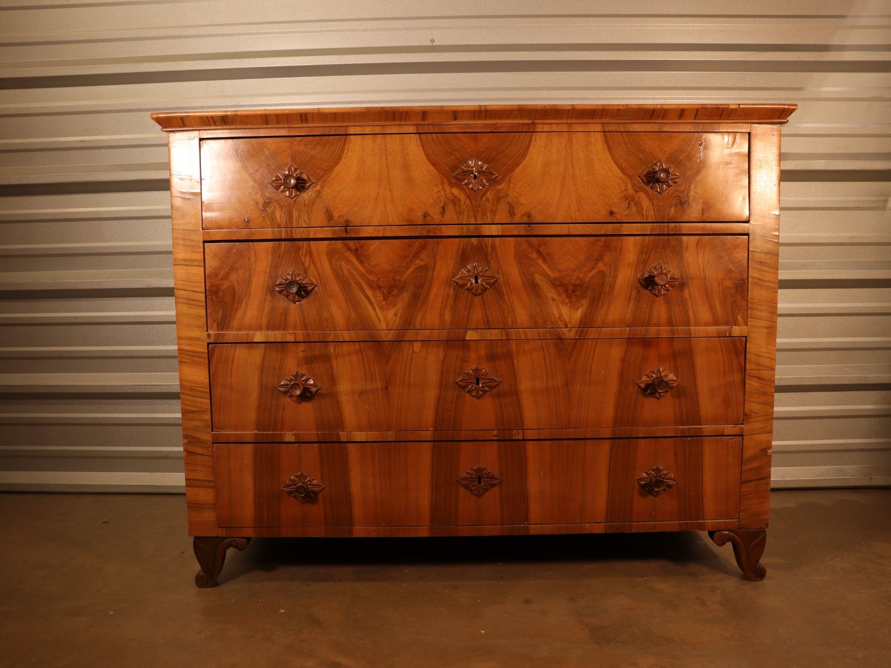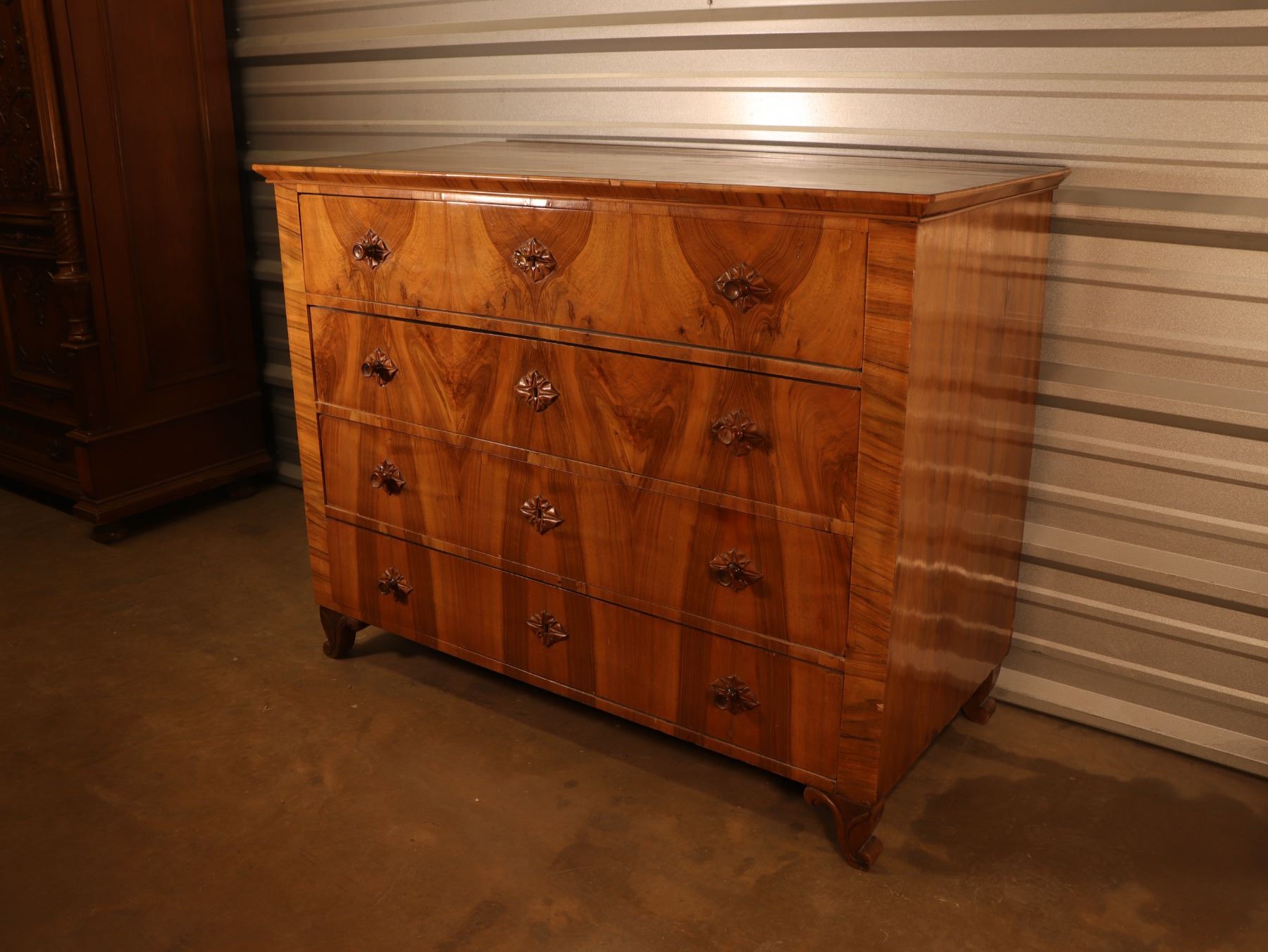 Four-drawer Biedermeier chest in figured walnut veneer with strong book-matched fronts and shaped feet. Drawers retain patterned lining; light wear and minor veneer issues from age and use.25x51x40