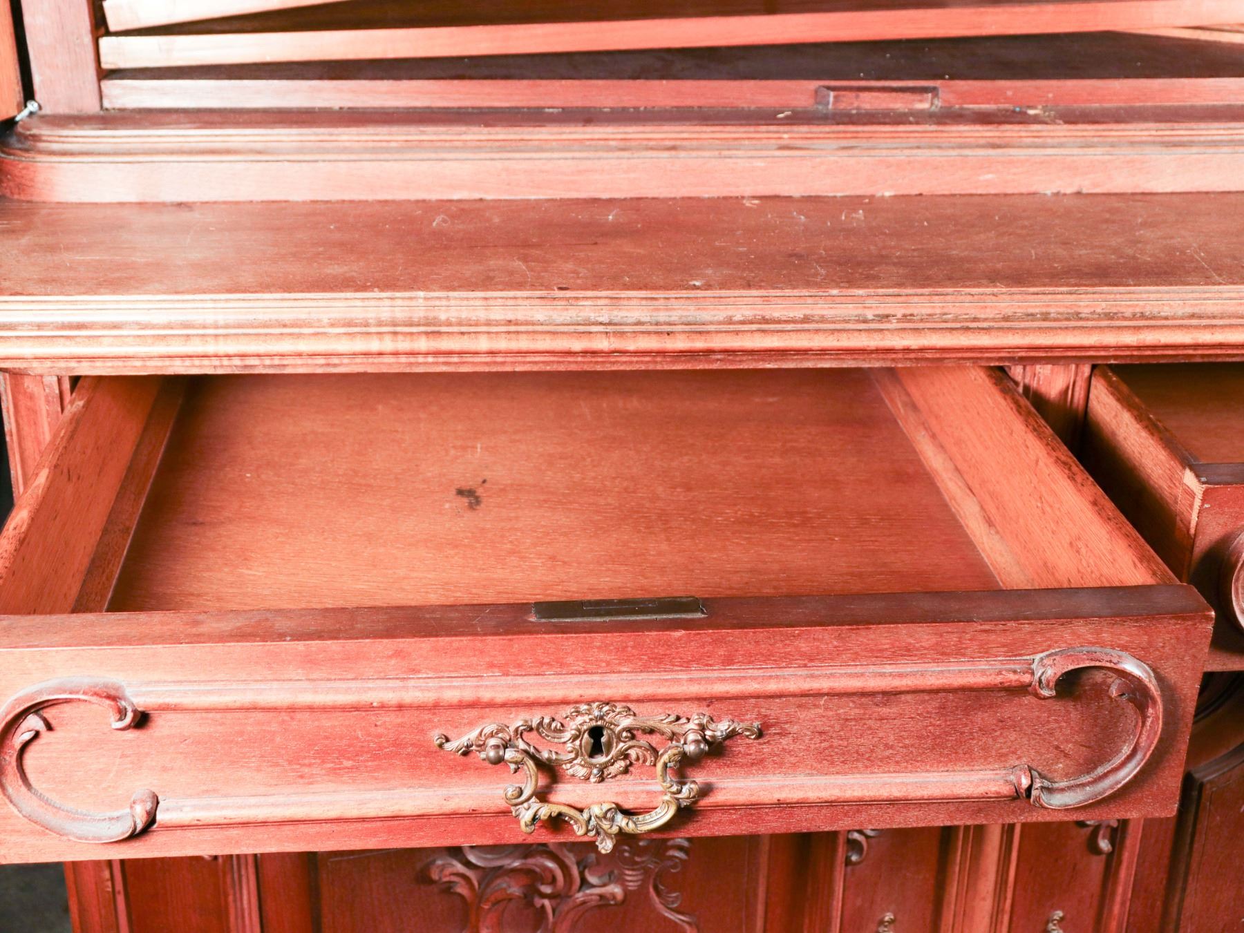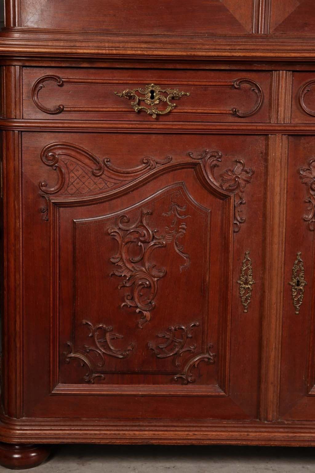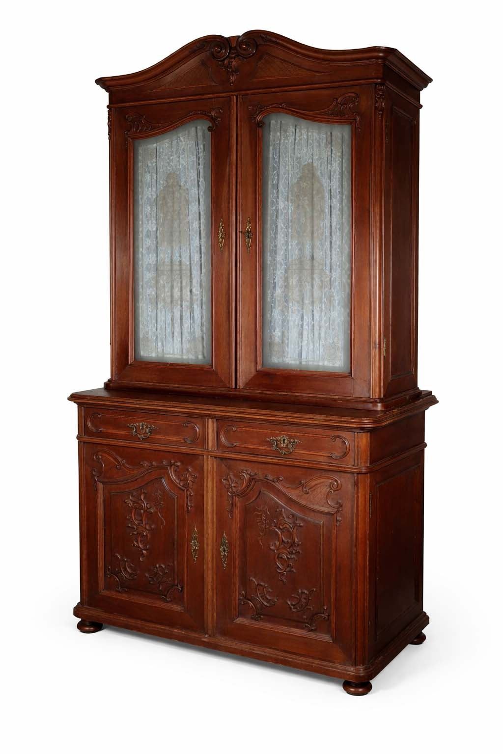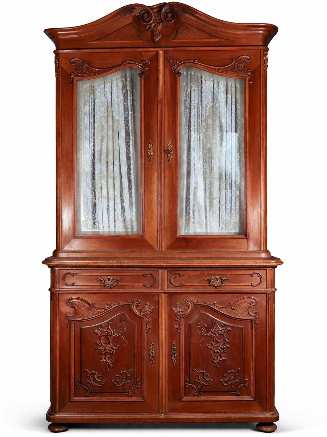 Impressive two-part Continental carved wood display cabinet in the Louis XV revival taste, comprising a glazed upper vitrine with shaped crest and scroll-carved detail over a lower case fitted with two drawers and a two-door cupboard. The upper doors retain lace curtain panels, while the lower section is ornamented with molded reserves and rocaille-inspired applied carving. The stepped profile, warm medium-brown finish, and generous storage/display capacity make this an attractive and practical statement piece for dining room, hallway, or country-house interior. Loose interior shelving is present within the upper section. Condition consistent with age and use, with general surface wear, minor imperfections around one interior hardware area, and no major structural issues apparent. 93 x 46 x 25 in. overall; upper case depth 16 in.