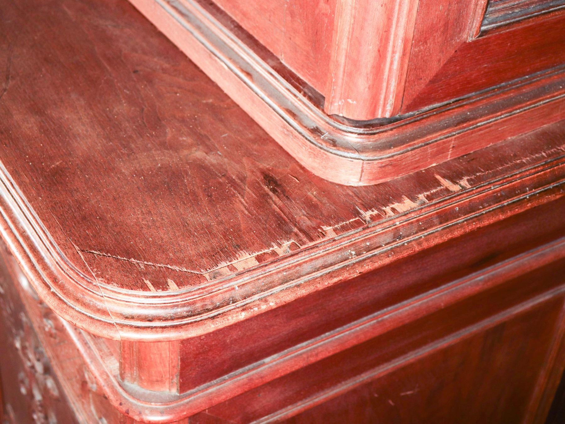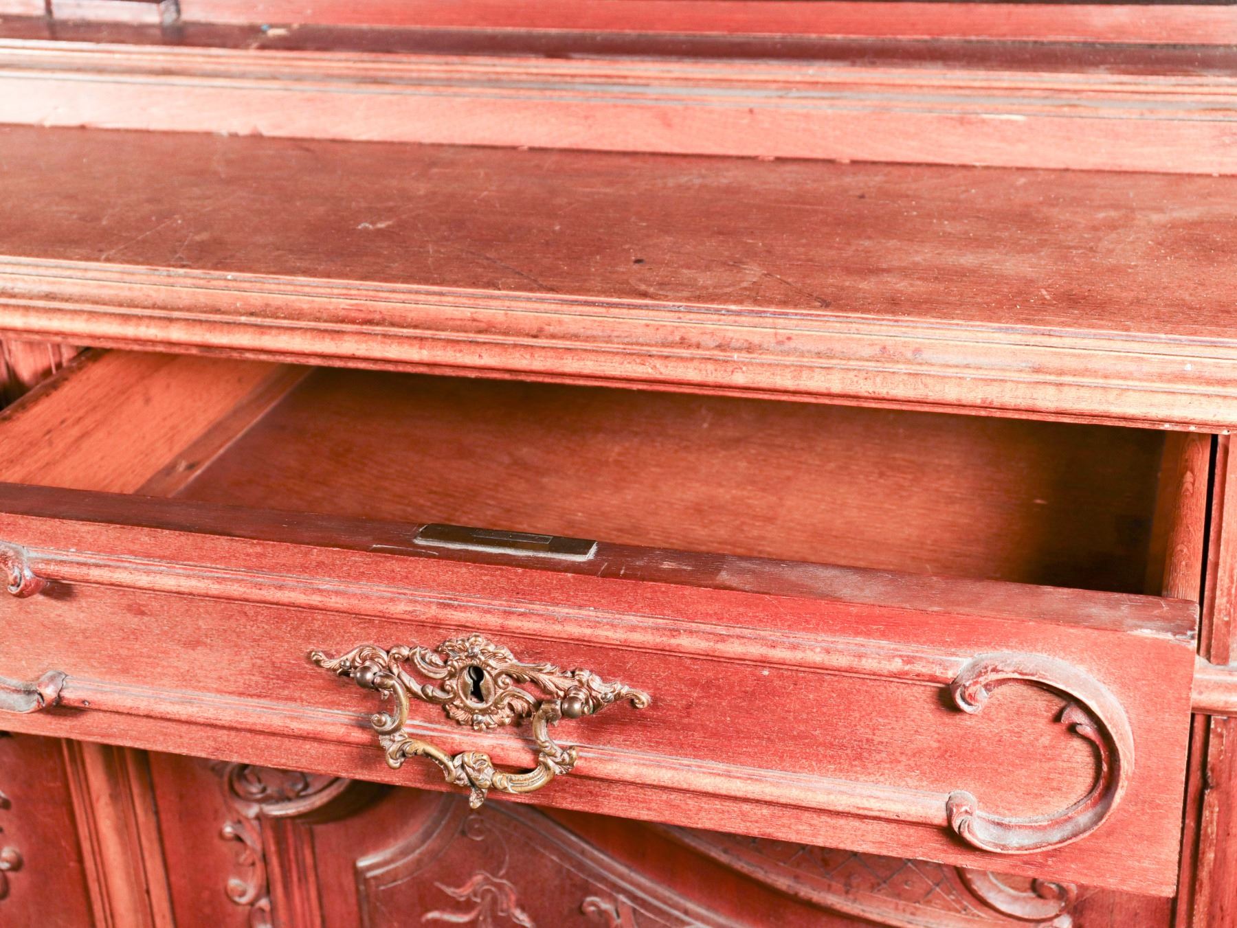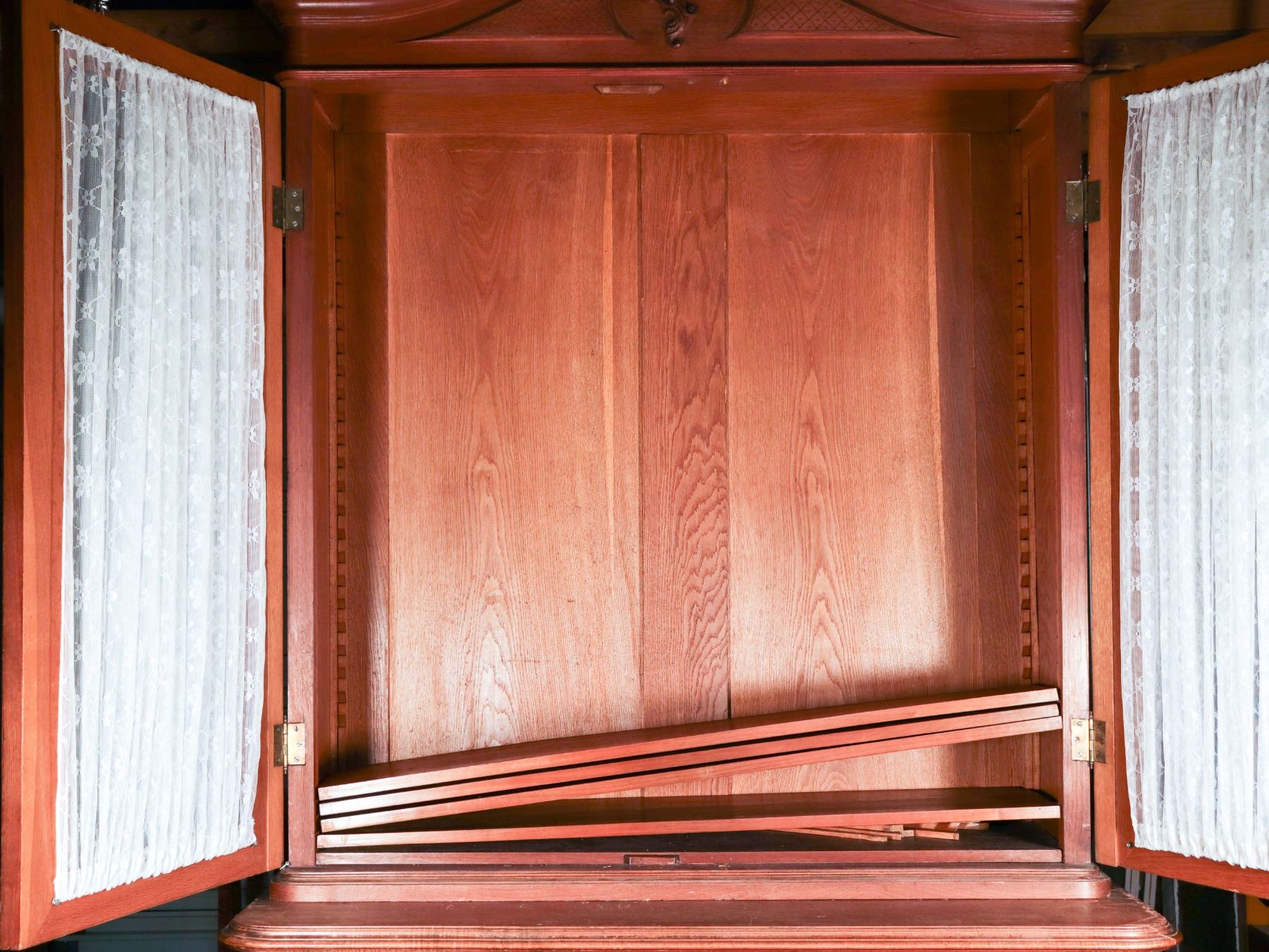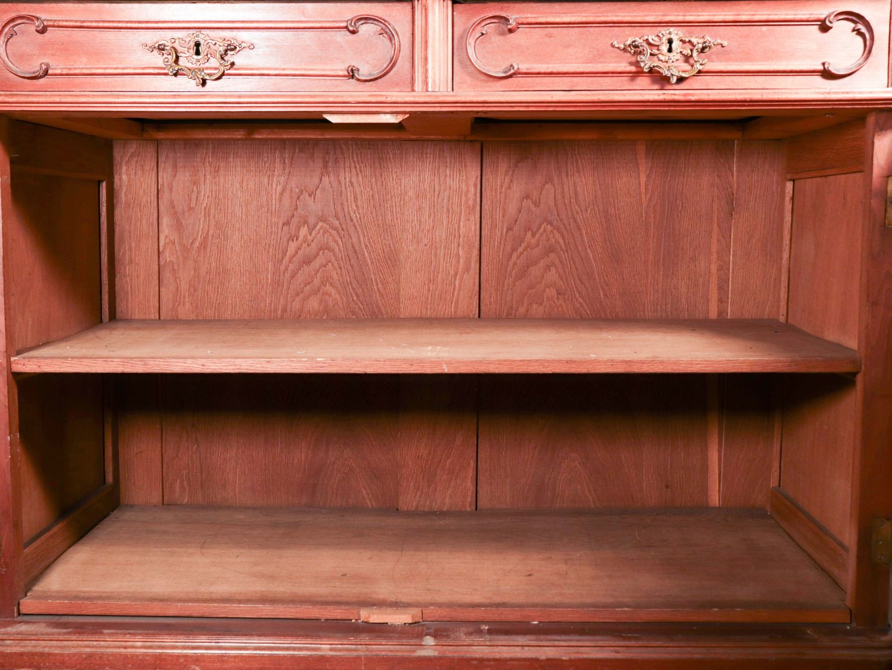 Impressive two-part Continental carved wood display cabinet in the Louis XV revival taste, comprising a glazed upper vitrine with shaped crest and scroll-carved detail over a lower case fitted with two drawers and a two-door cupboard. The upper doors retain lace curtain panels, while the lower section is ornamented with molded reserves and rocaille-inspired applied carving. The stepped profile, warm medium-brown finish, and generous storage/display capacity make this an attractive and practical statement piece for dining room, hallway, or country-house interior. Loose interior shelving is present within the upper section. Condition consistent with age and use, with general surface wear, minor imperfections around one interior hardware area, and no major structural issues apparent. 93 x 46 x 25 in. overall; upper case depth 16 in.