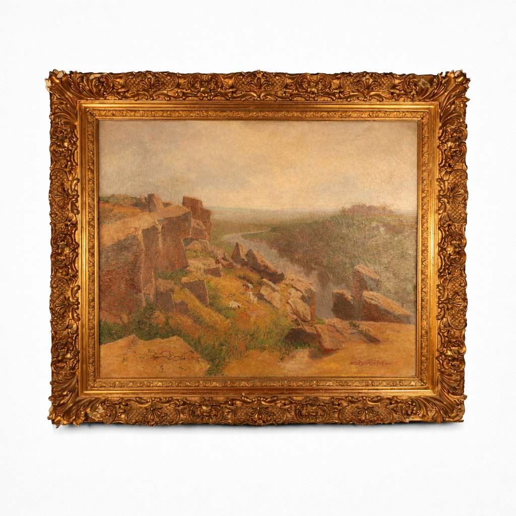 The present work shows a sunlit rocky escarpment descending toward a winding river valley, painted in warm earth tones with an atmospheric, slightly hazy distance. The handling is consistent with Karlinsky’s landscape manner around the turn of the century, and the painting retains a good decorative scale at 39 x 31 in., housed in a substantial ornate gilt frame measuring 43 x 51 in. The frame adds meaningful presentation value, though it should be treated as a bonus rather than the primary driver of value.