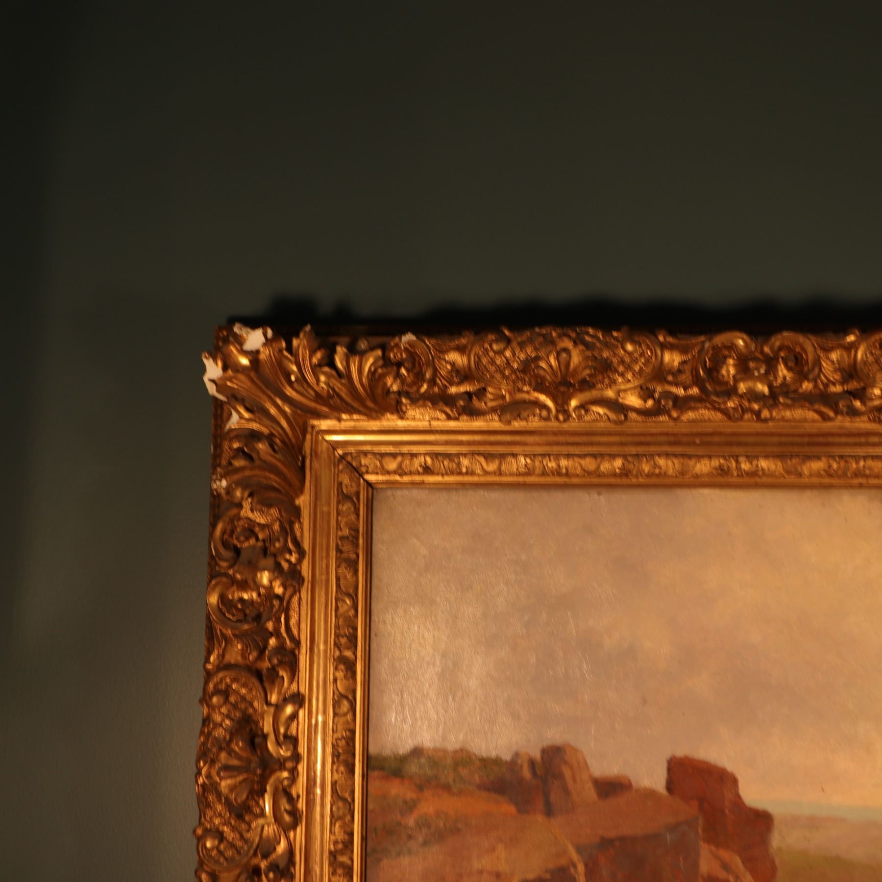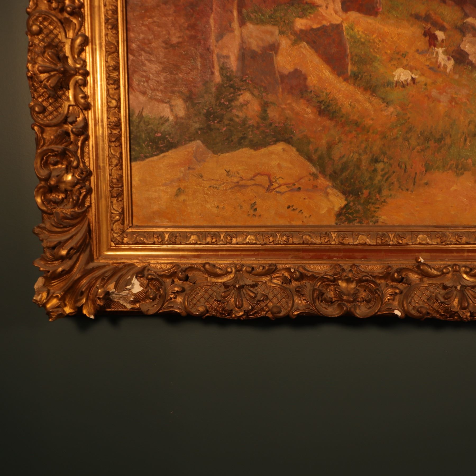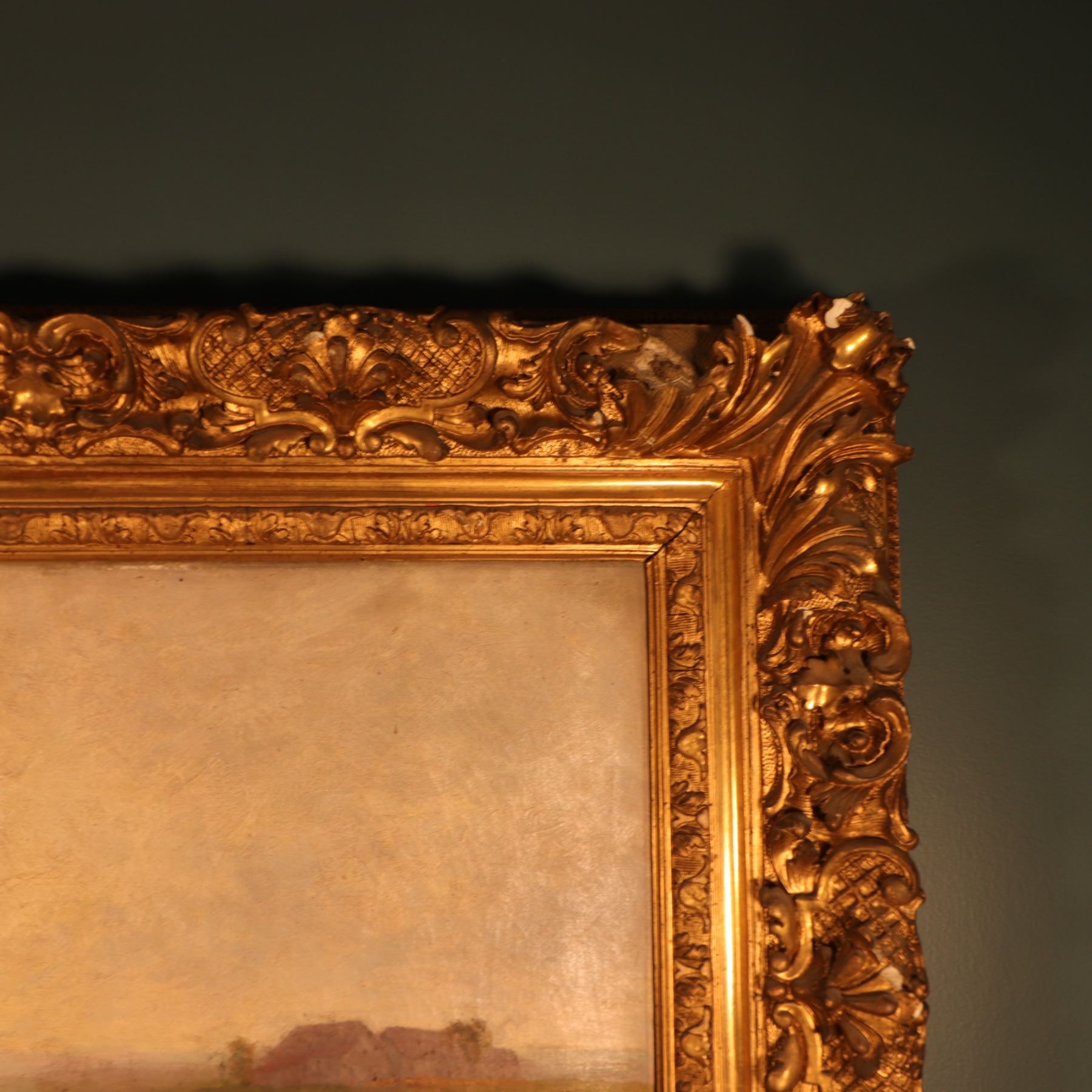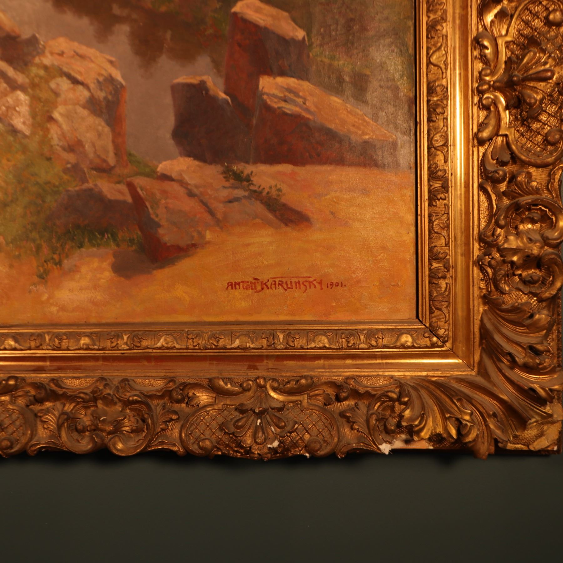 Painting appears in good overall condition, signed lower right and dated 1901. The frame has losses to ornamental elements and localized wear. Those losses reduce the frame’s standalone value, but it still presents impressively on the wall and supports the lot well.