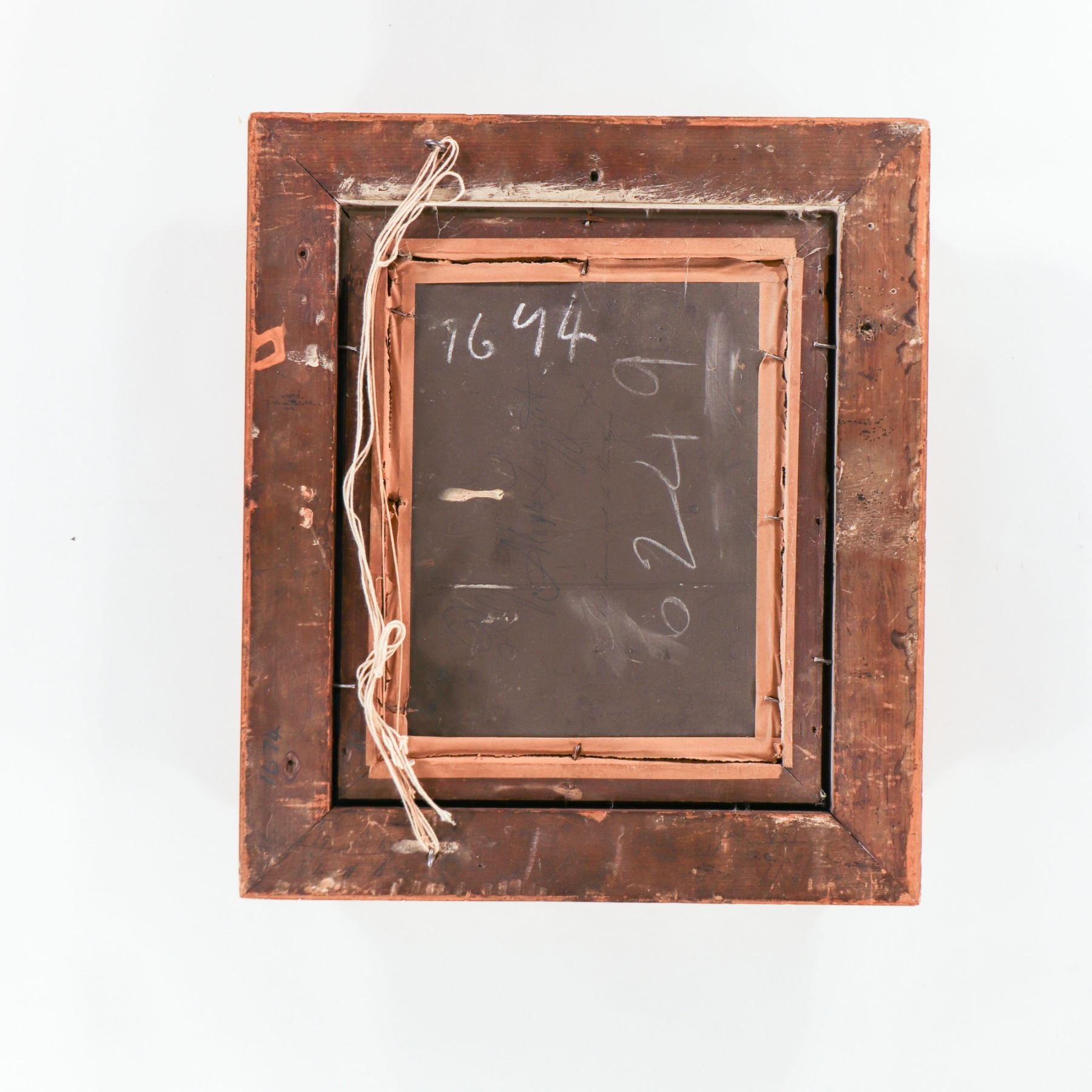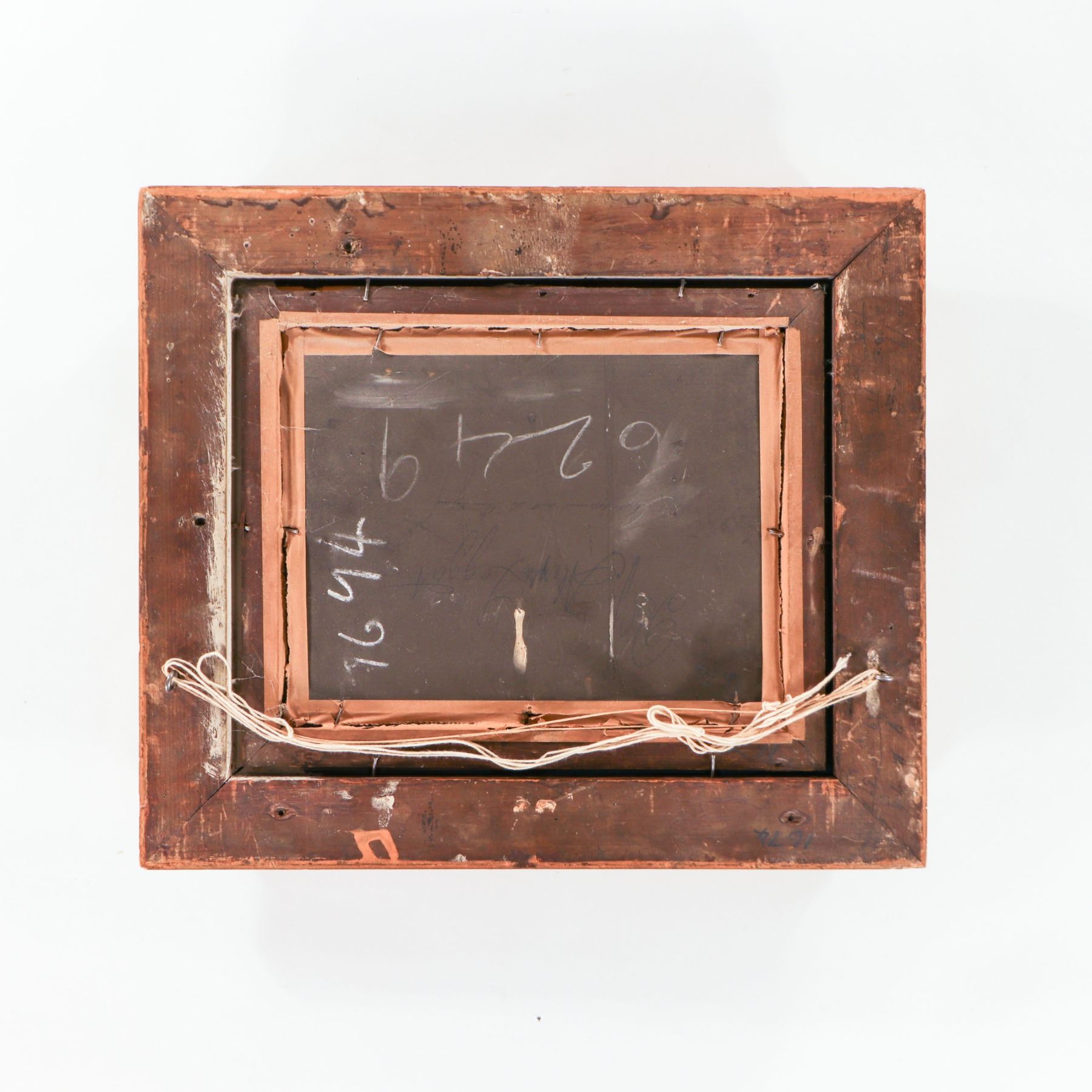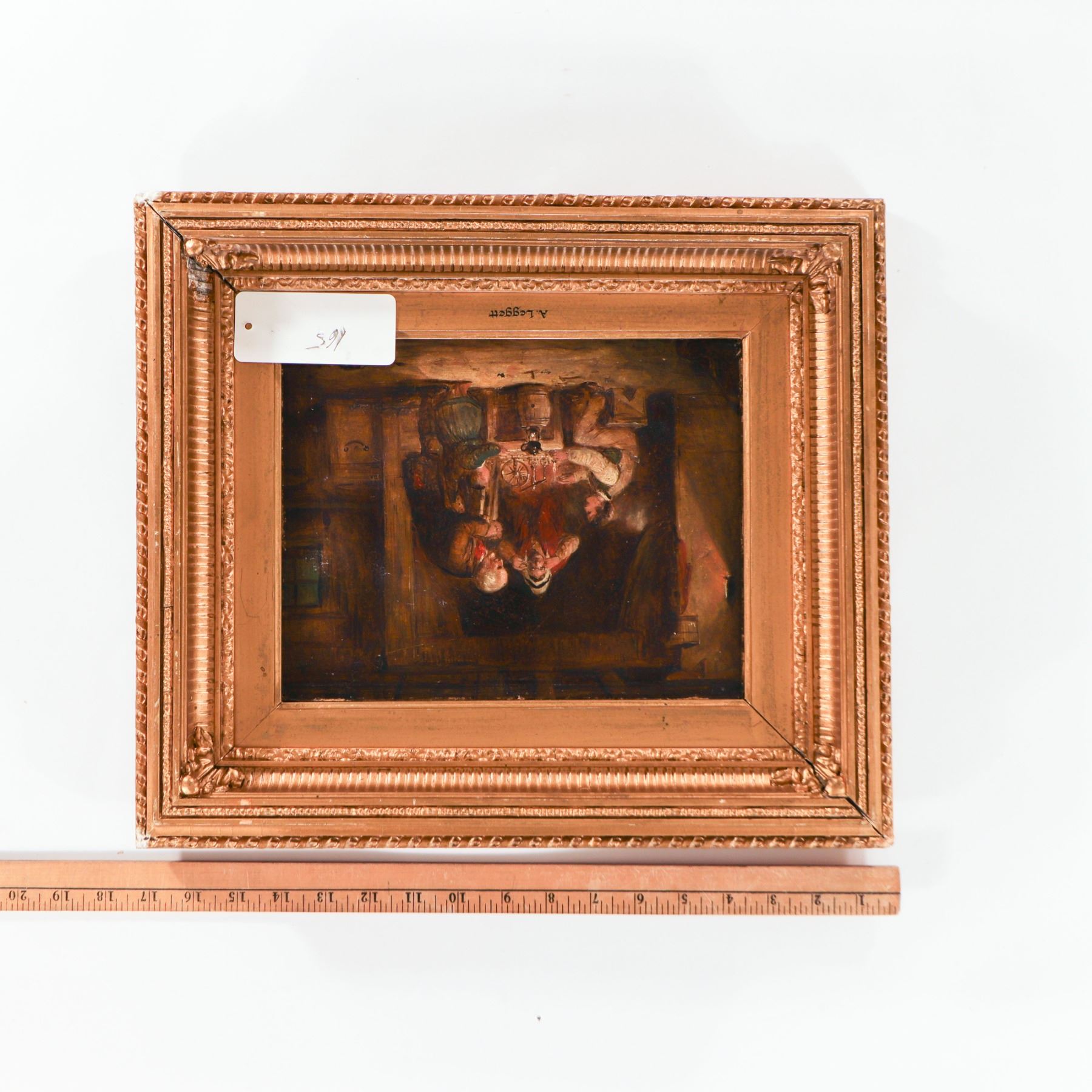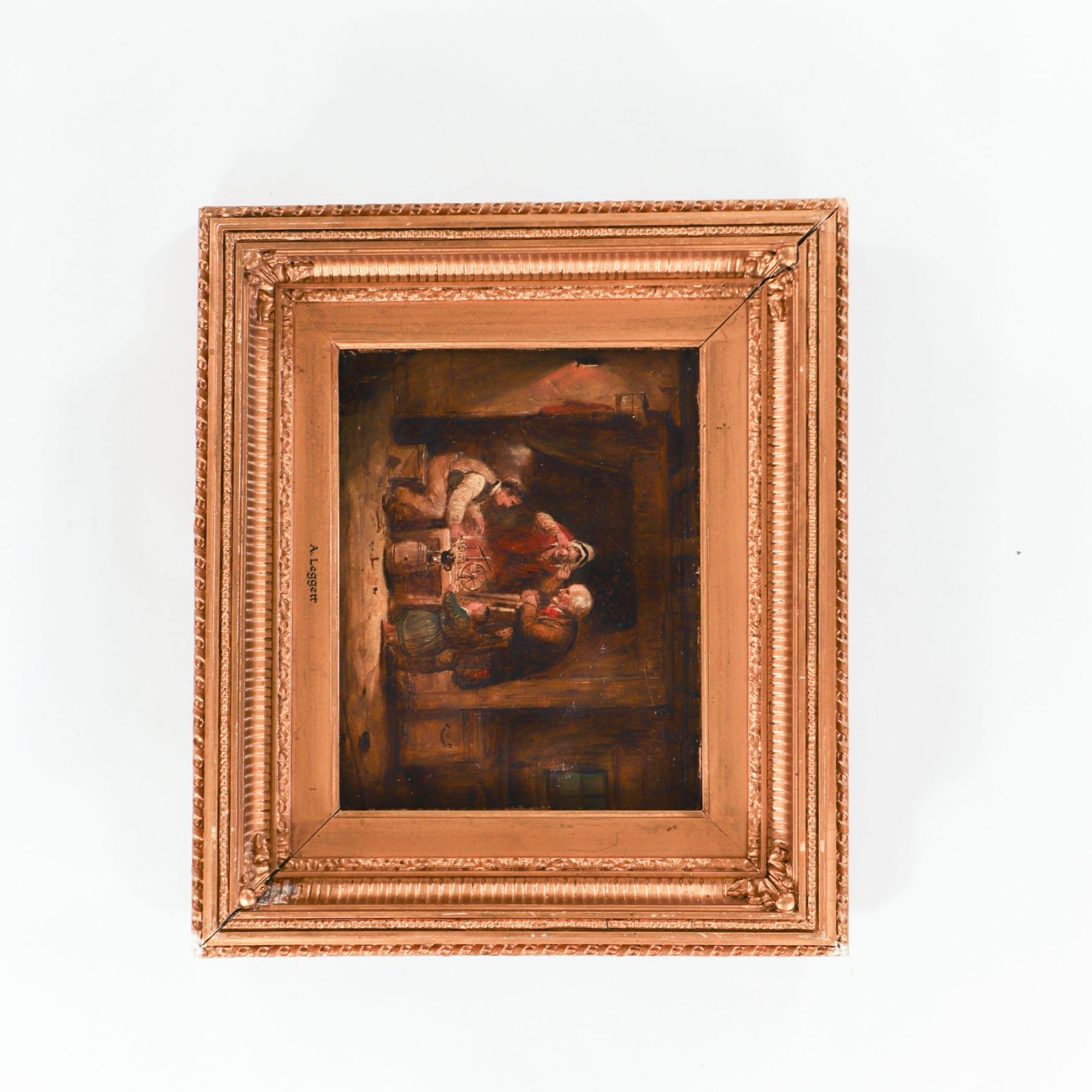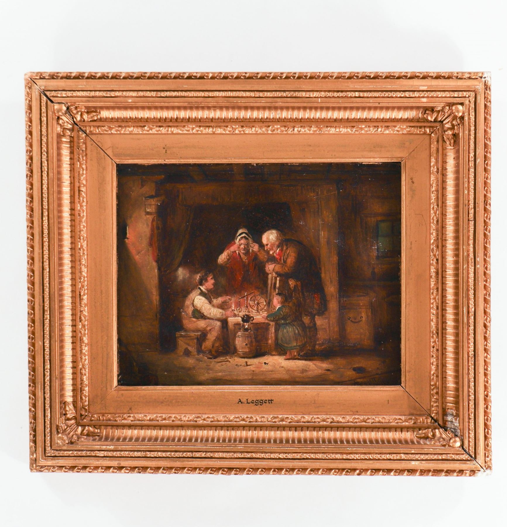 Attributed to A. Leggett (British school, 19th century), oil on panel depicting an intimate cottage interior with three figures gathered around a candlelit table, rendered in warm browns and reds in the Victorian narrative tradition. Signed A. Leggett and presented in an ornate gilt-composition frame. Surface with age-appropriate craquelure and minor abrasions; frame with rubbing, small chips and losses to ornament.