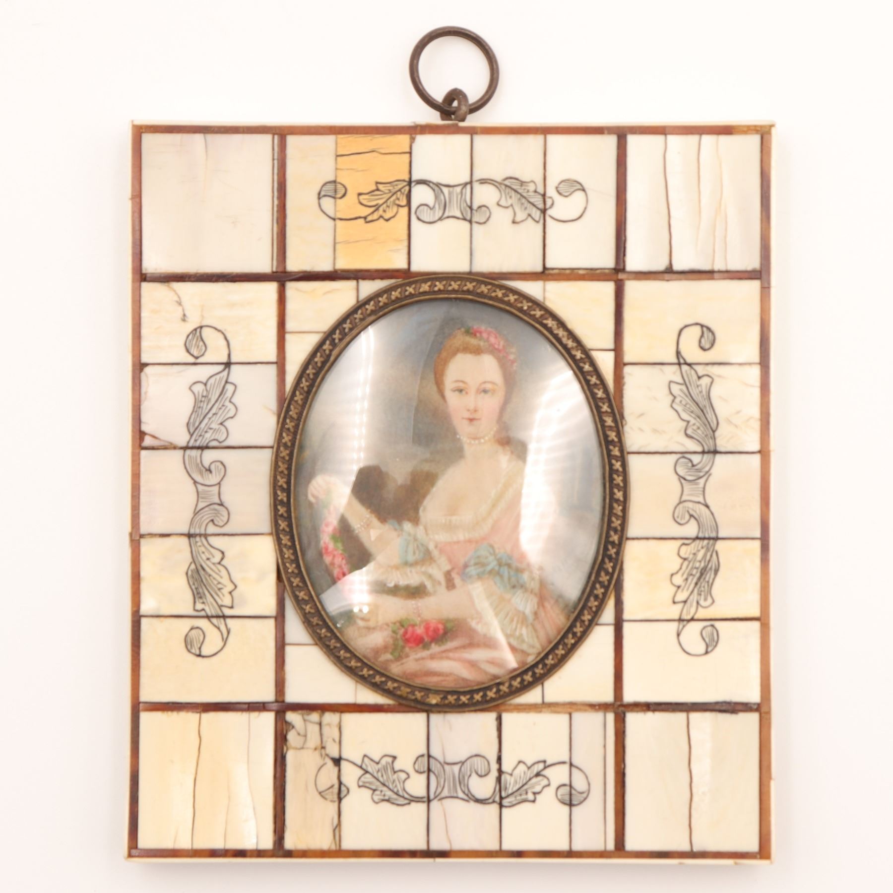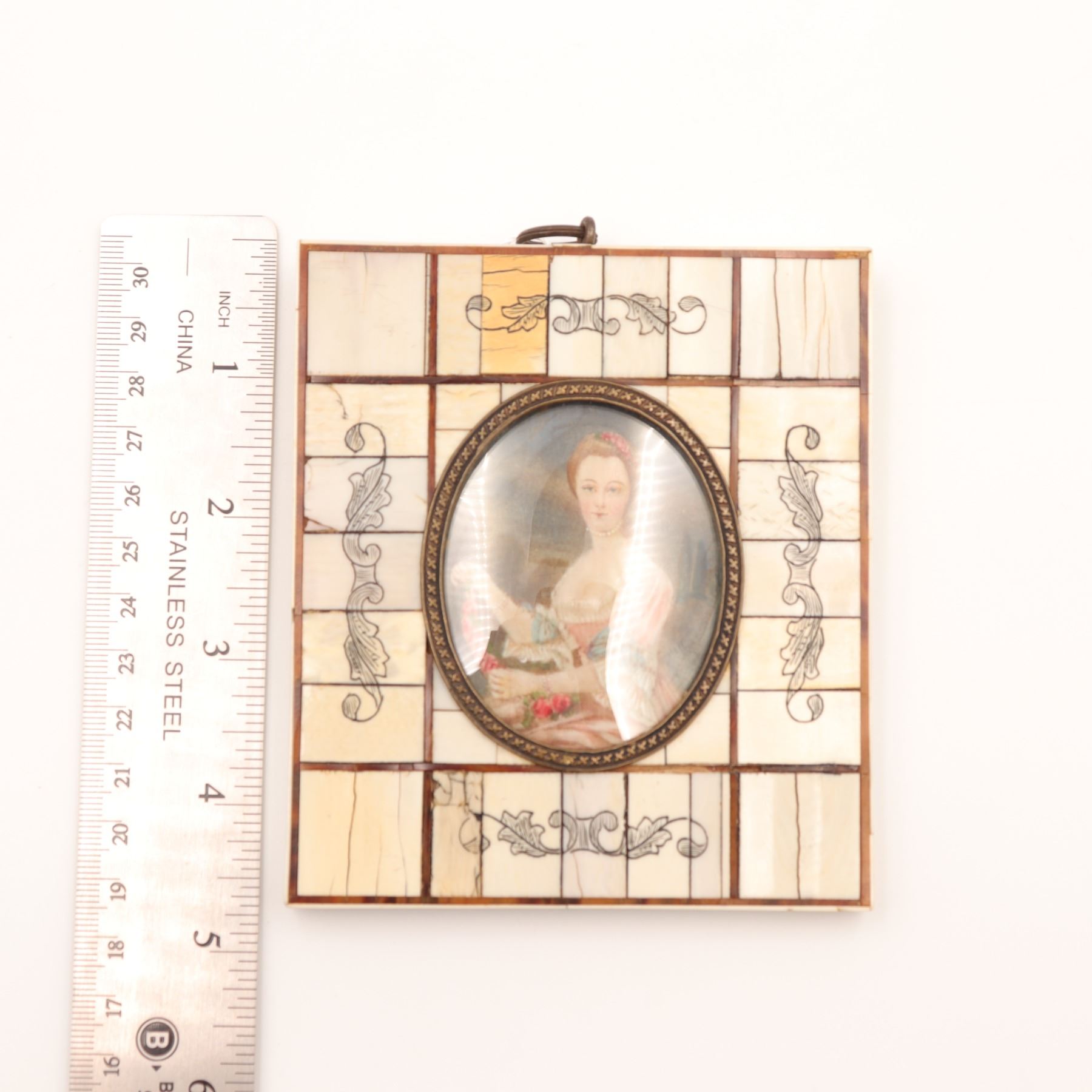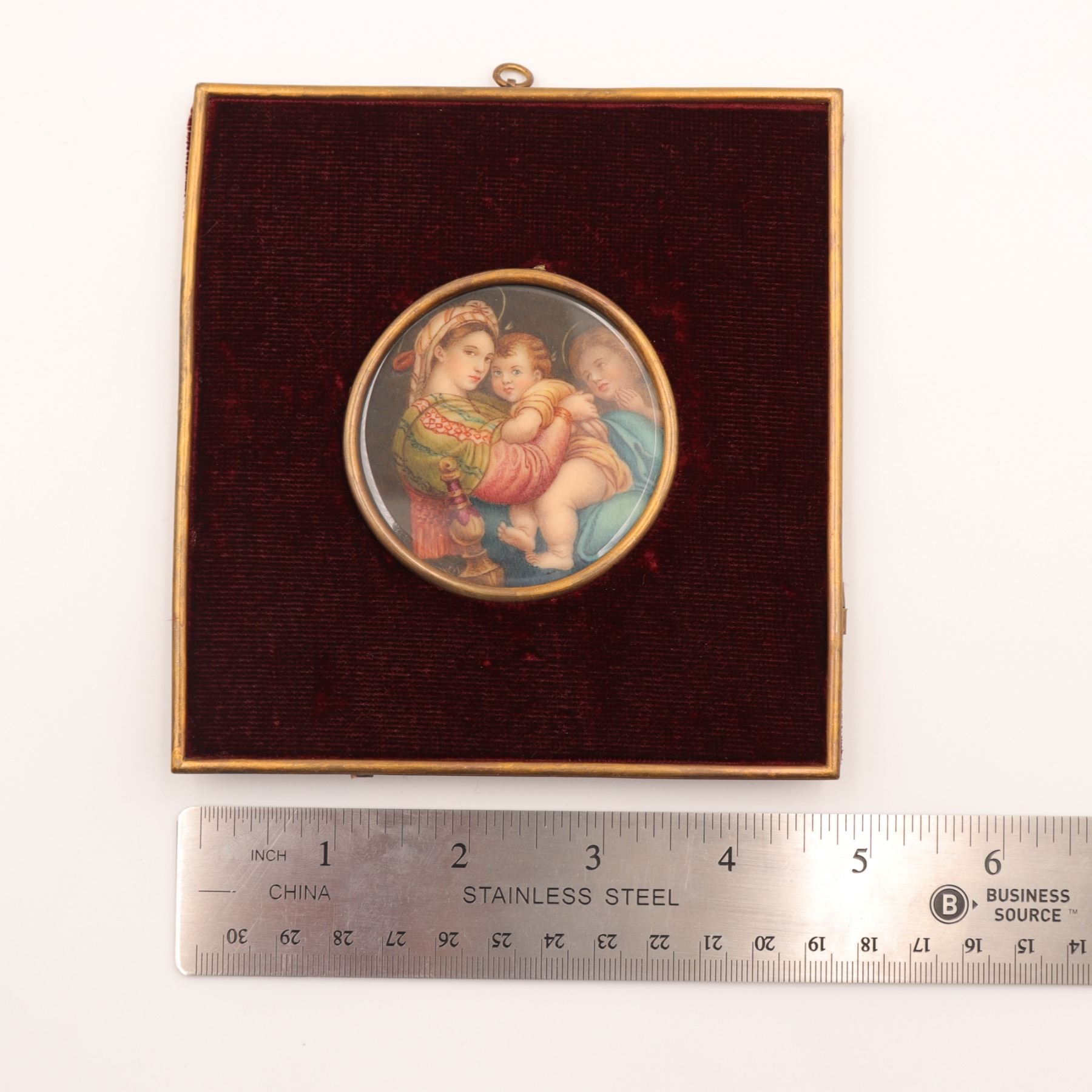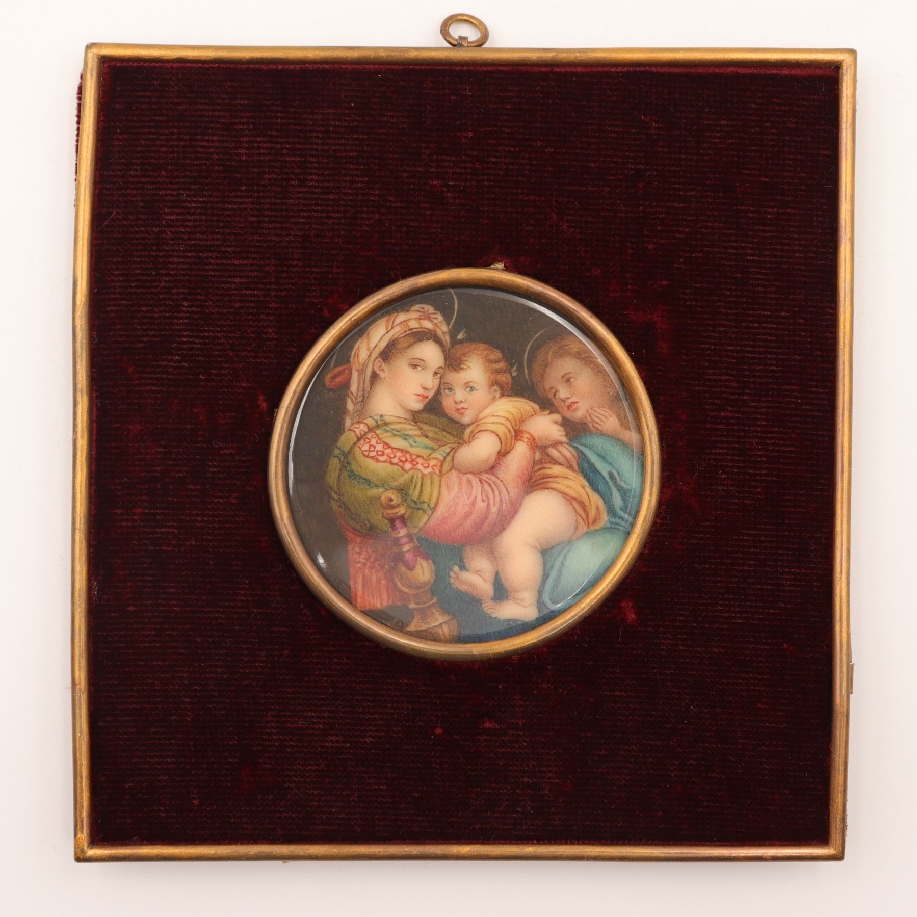 Group of four European framed miniatures, comprising: (1) a French School portrait miniature of a young lady in Rococo dress weaving a garland of roses, watercolour on ivory wafer, mounted behind convex glass in an oval brass bezel within a rectangular ivory-veneered frame with ink-drawn foliate decoration, the reverse with printed French text and collector’s label inscribed “Mme de Pompadour?”; (2) a circular hand-painted miniature after Raphael’s Madonna della Seggiola, probably early 20th century, on a thin translucent support, mounted behind glass in a gilt metal bezel on a square red velvet strut frame, inscribed in Italian to the reverse; (3) a Continental hand-painted genre miniature under convex glass depicting an 18th-century gallant bowing to a lady on a stair, signed “René” lower right, housed in a faux-ivory and tortoiseshell-effect frame with gilt inner slip; and (4) a French School portrait miniature of a lady of the court in late 18th-century dress, watercolour on ivory wafer, mounted in an ebonised wood frame with gilt slip. French and Continental, 19th to early 20th century. Condition varies, with age-related wear, minor rubbing, cracks and shrinkage to parts of the ivory veneer, light surface marks, and frame wear throughout. Export or shipment of lots containing ivory may be subject to applicable regulations.