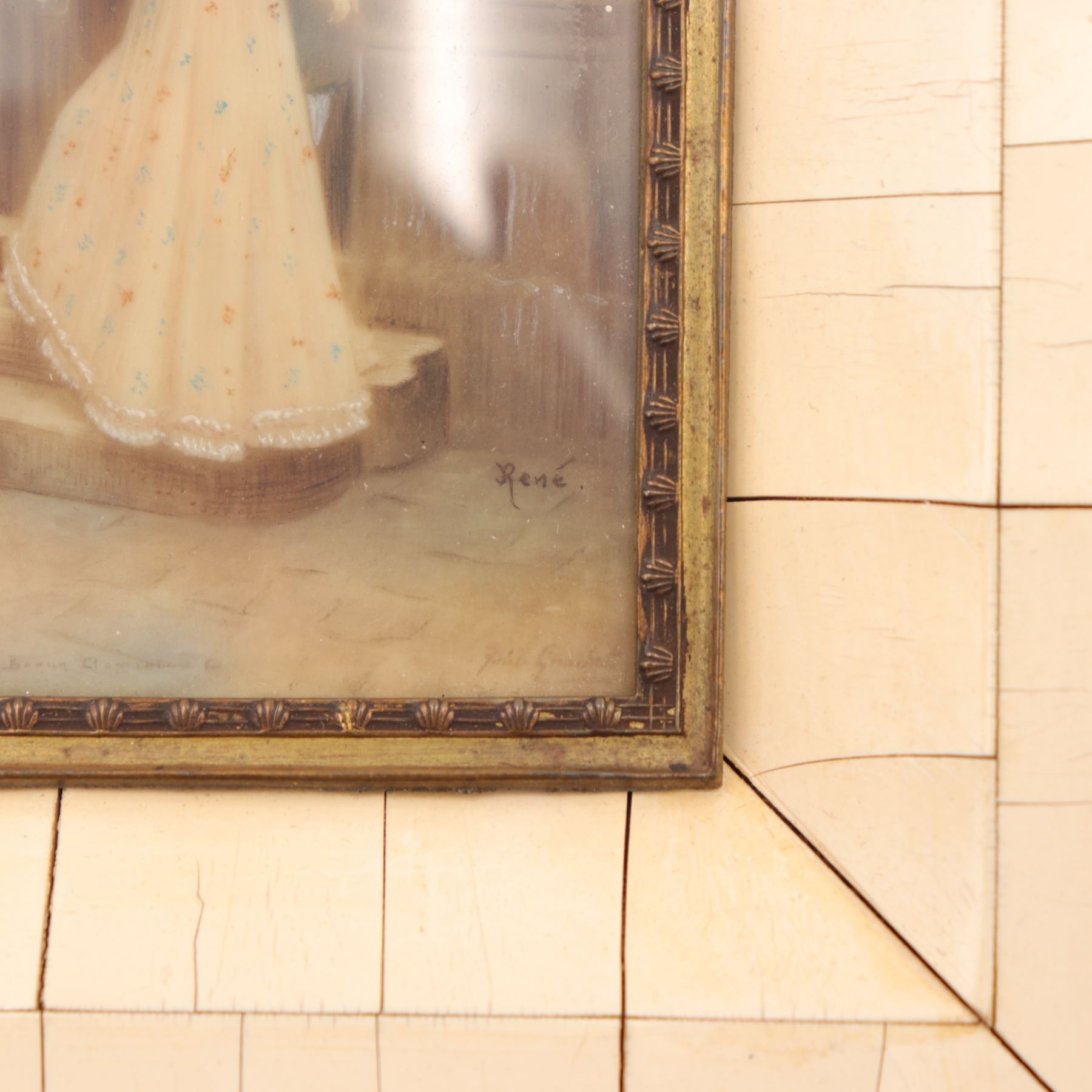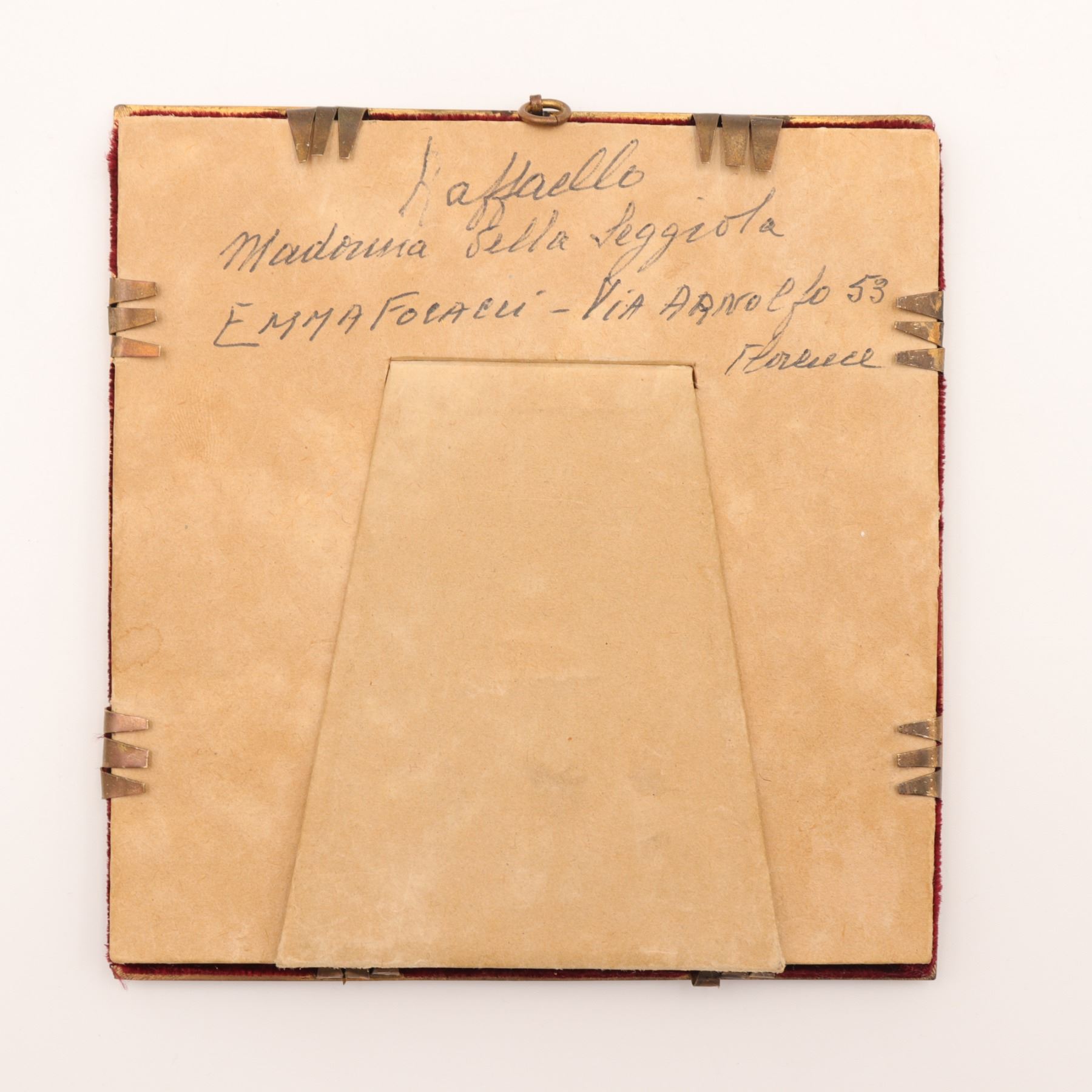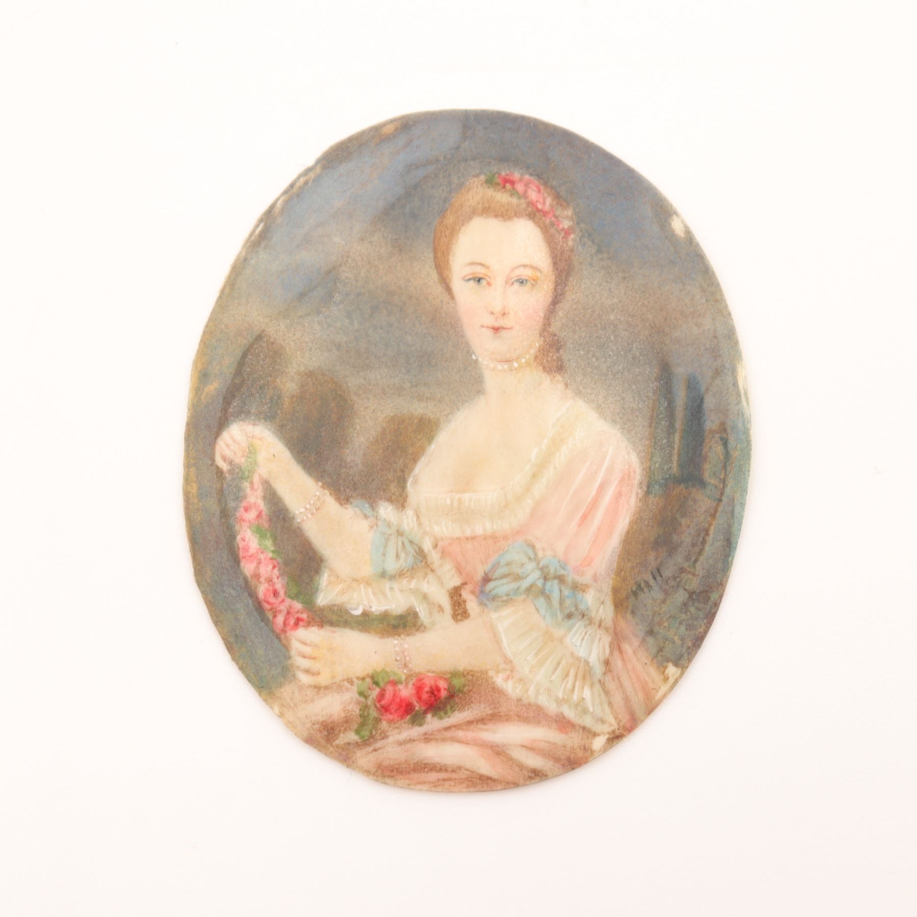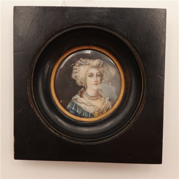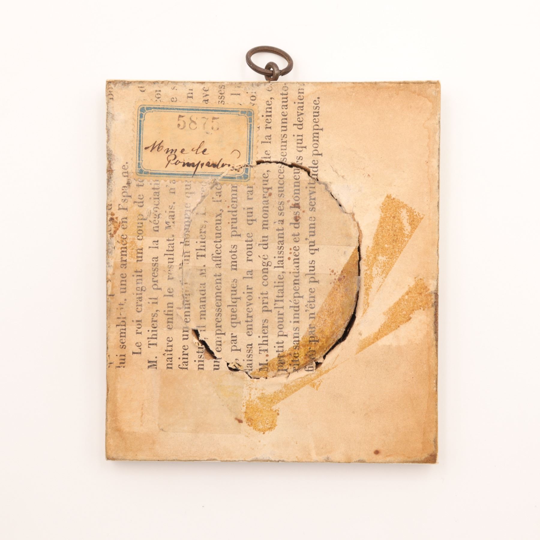 Group of four European framed miniatures, comprising: (1) a French School portrait miniature of a young lady in Rococo dress weaving a garland of roses, watercolour on ivory wafer, mounted behind convex glass in an oval brass bezel within a rectangular ivory-veneered frame with ink-drawn foliate decoration, the reverse with printed French text and collector’s label inscribed “Mme de Pompadour?”; (2) a circular hand-painted miniature after Raphael’s Madonna della Seggiola, probably early 20th century, on a thin translucent support, mounted behind glass in a gilt metal bezel on a square red velvet strut frame, inscribed in Italian to the reverse; (3) a Continental hand-painted genre miniature under convex glass depicting an 18th-century gallant bowing to a lady on a stair, signed “René” lower right, housed in a faux-ivory and tortoiseshell-effect frame with gilt inner slip; and (4) a French School portrait miniature of a lady of the court in late 18th-century dress, watercolour on ivory wafer, mounted in an ebonised wood frame with gilt slip. French and Continental, 19th to early 20th century. Condition varies, with age-related wear, minor rubbing, cracks and shrinkage to parts of the ivory veneer, light surface marks, and frame wear throughout. Export or shipment of lots containing ivory may be subject to applicable regulations.