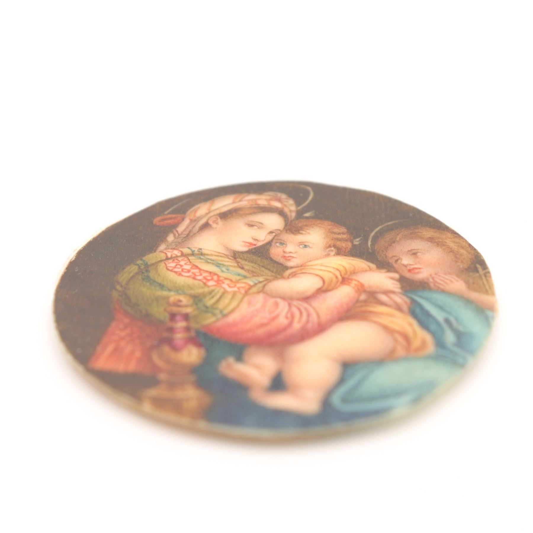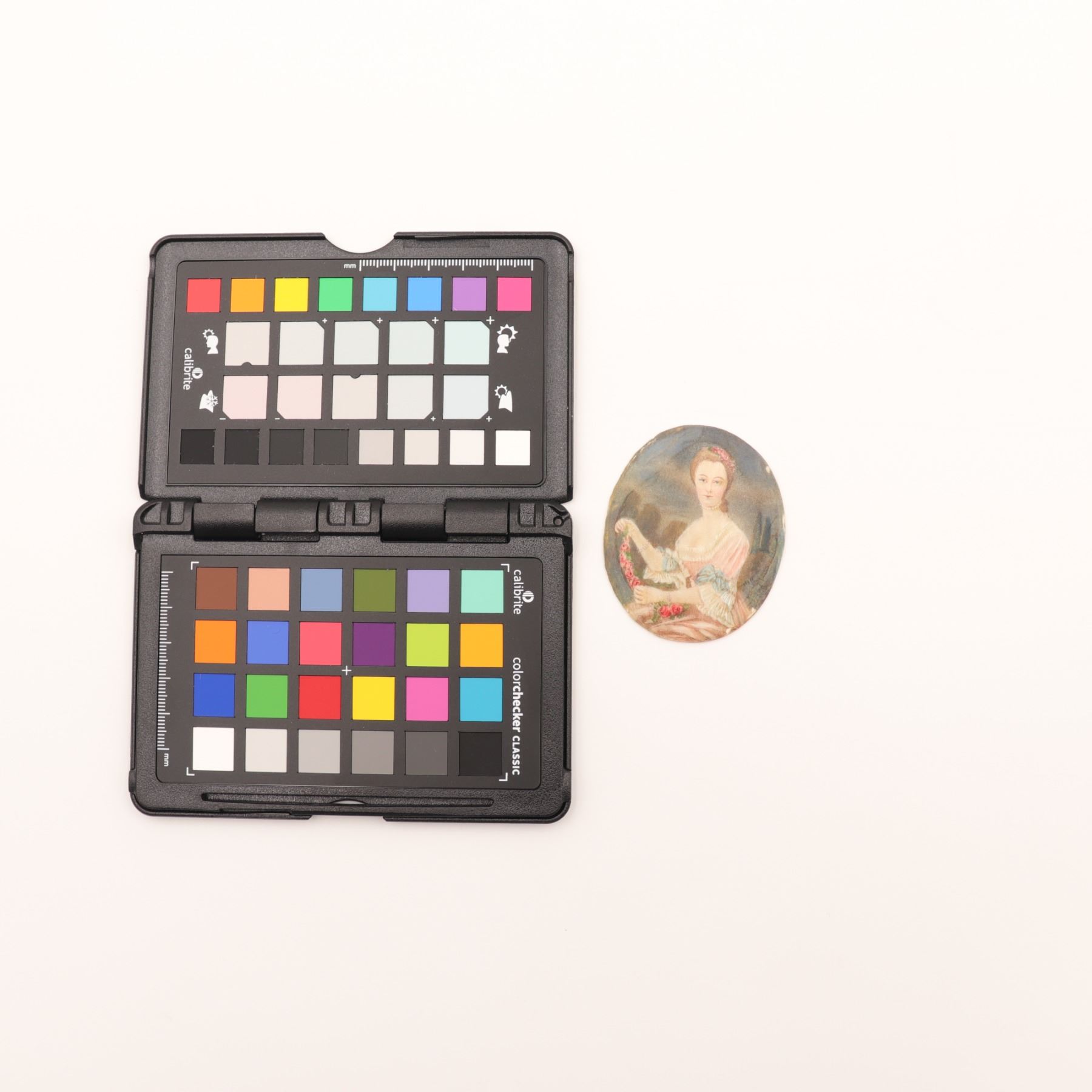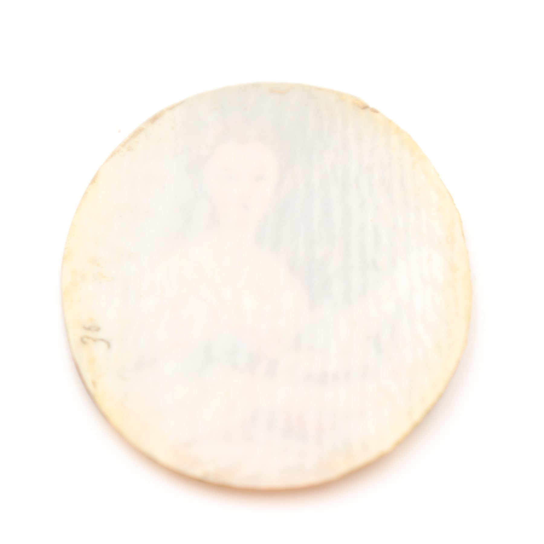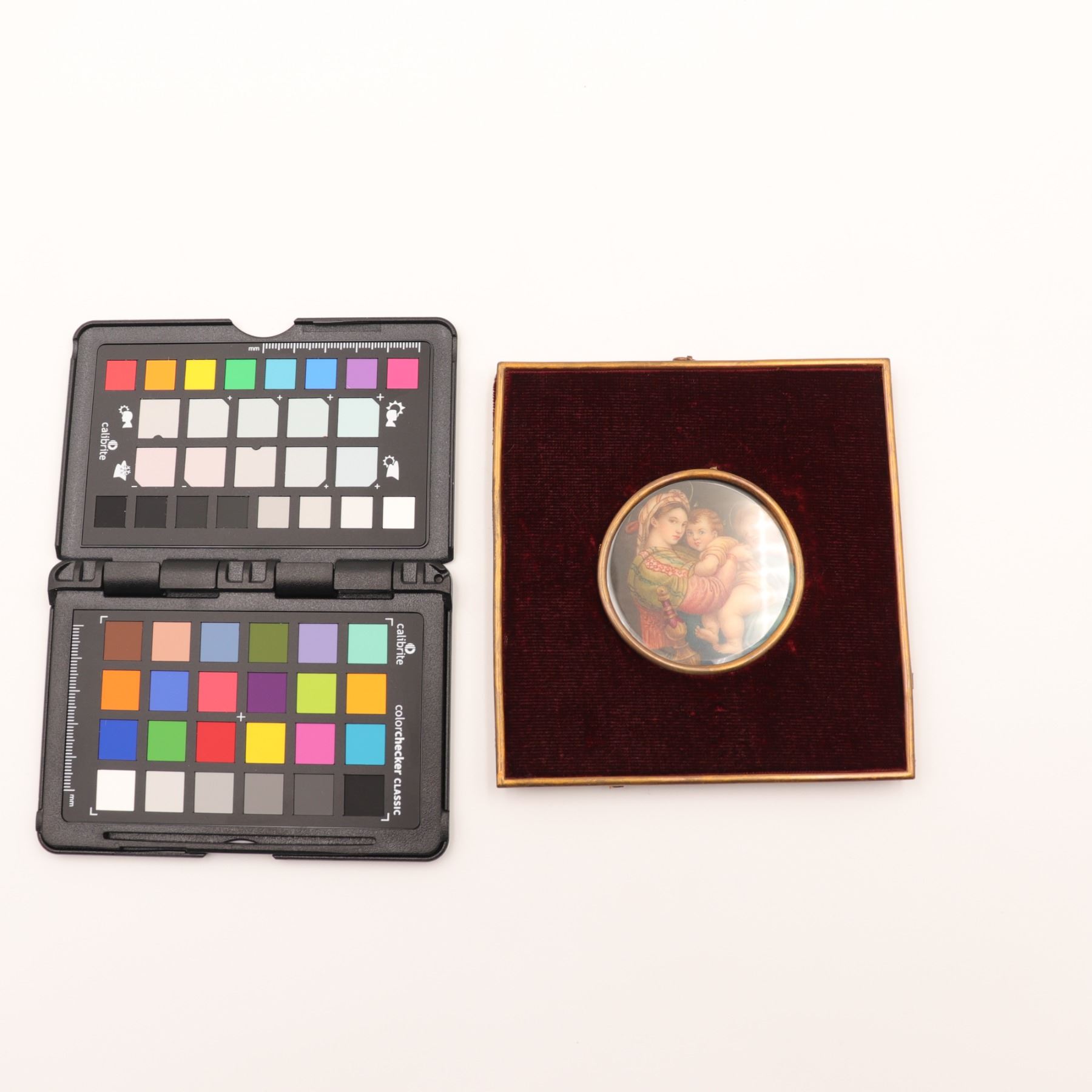 Group of four European framed miniatures, comprising: (1) a French School portrait miniature of a young lady in Rococo dress weaving a garland of roses, watercolour on ivory wafer, mounted behind convex glass in an oval brass bezel within a rectangular ivory-veneered frame with ink-drawn foliate decoration, the reverse with printed French text and collector’s label inscribed “Mme de Pompadour?”; (2) a circular hand-painted miniature after Raphael’s Madonna della Seggiola, probably early 20th century, on a thin translucent support, mounted behind glass in a gilt metal bezel on a square red velvet strut frame, inscribed in Italian to the reverse; (3) a Continental hand-painted genre miniature under convex glass depicting an 18th-century gallant bowing to a lady on a stair, signed “René” lower right, housed in a faux-ivory and tortoiseshell-effect frame with gilt inner slip; and (4) a French School portrait miniature of a lady of the court in late 18th-century dress, watercolour on ivory wafer, mounted in an ebonised wood frame with gilt slip. French and Continental, 19th to early 20th century. Condition varies, with age-related wear, minor rubbing, cracks and shrinkage to parts of the ivory veneer, light surface marks, and frame wear throughout. Export or shipment of lots containing ivory may be subject to applicable regulations.