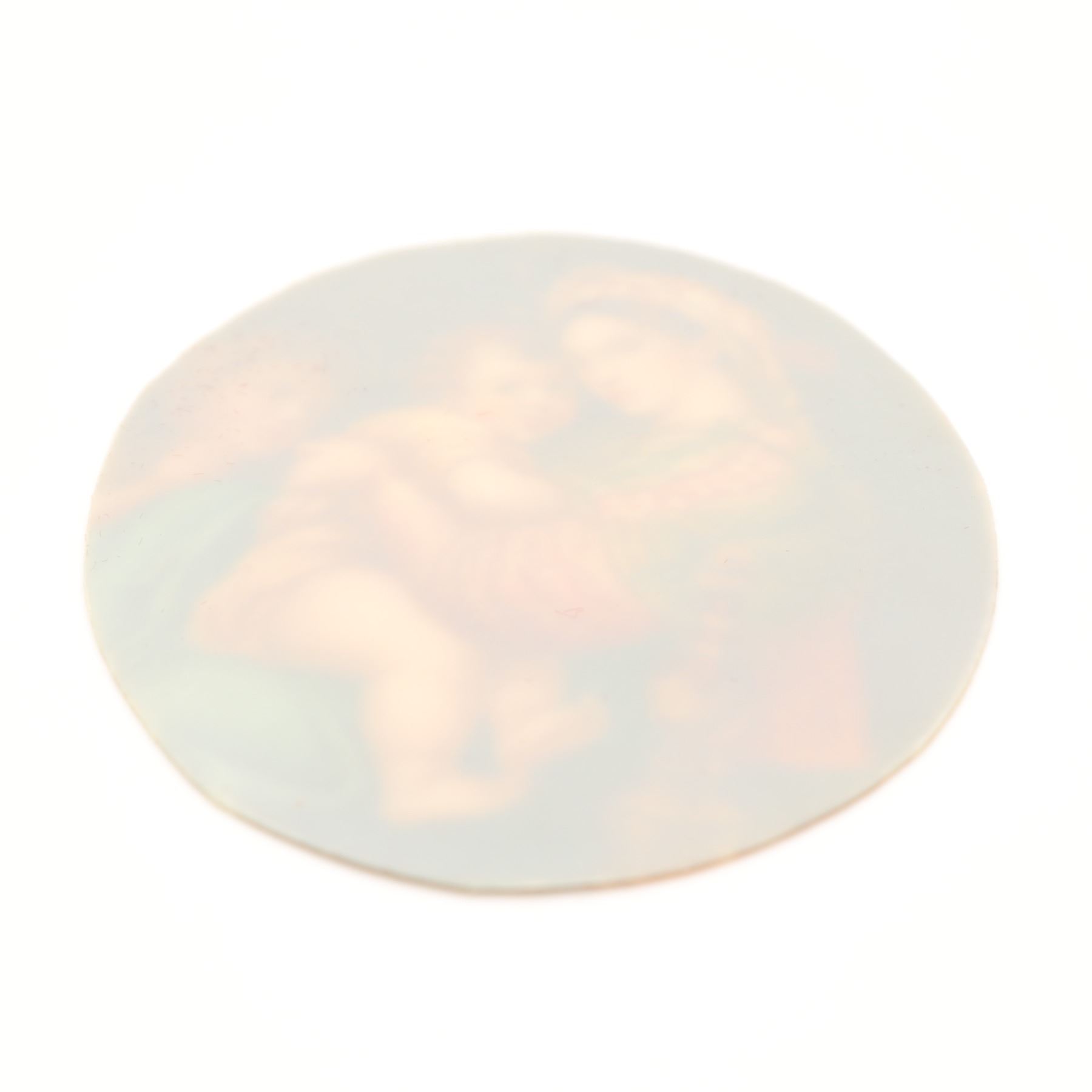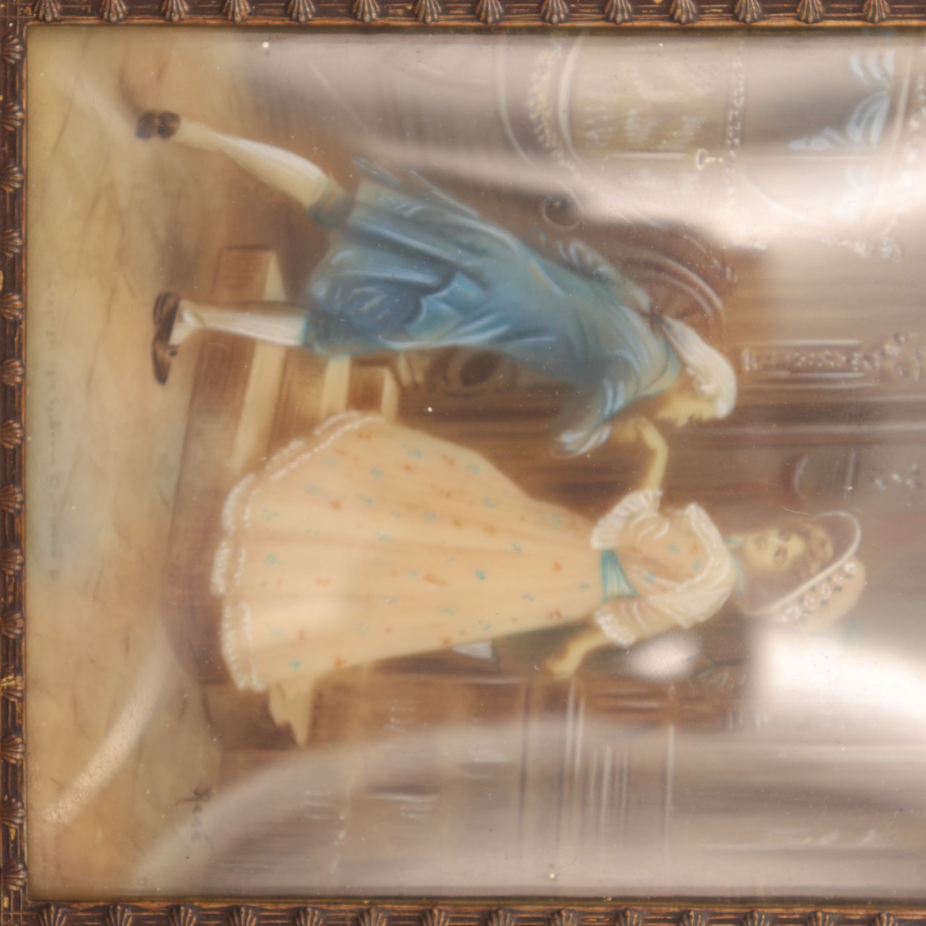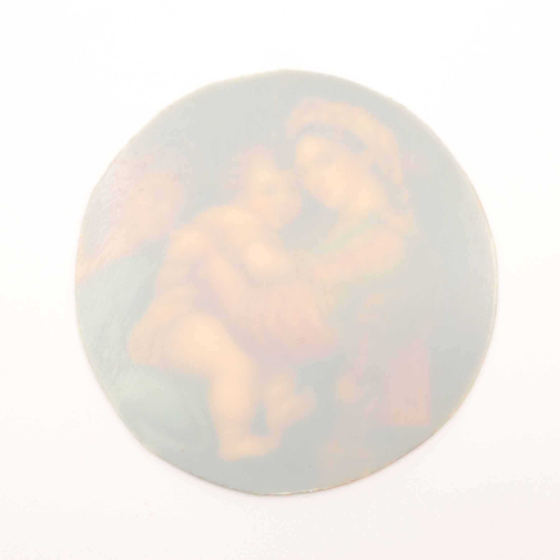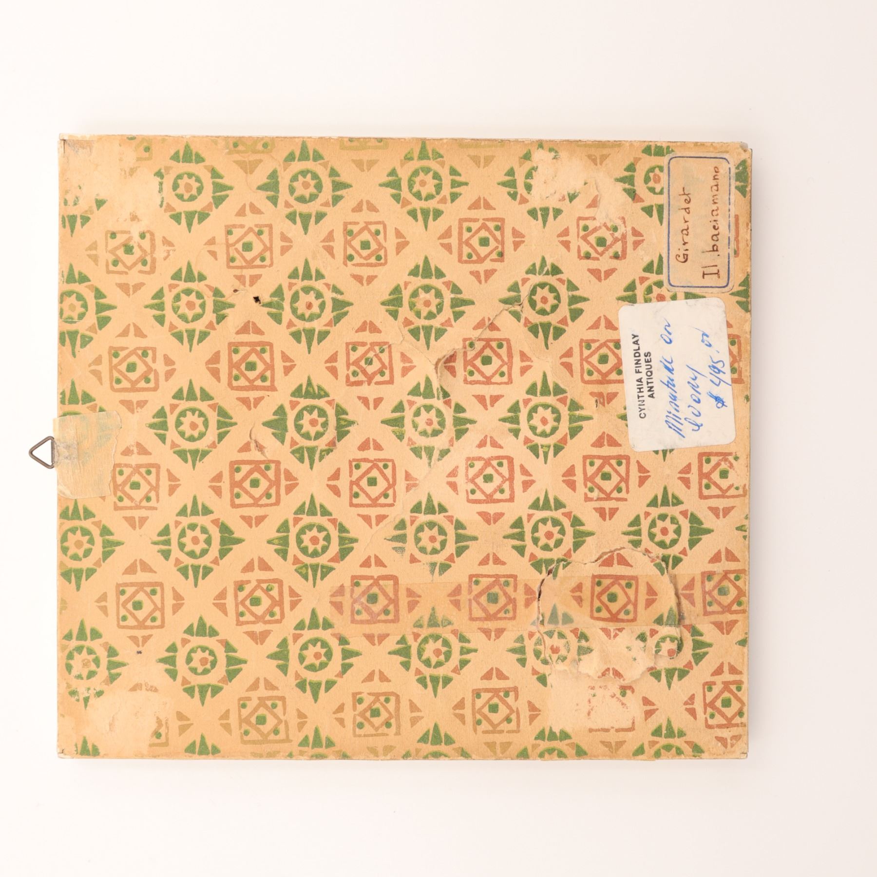 Group of four European framed miniatures, comprising: (1) a French School portrait miniature of a young lady in Rococo dress weaving a garland of roses, watercolour on ivory wafer, mounted behind convex glass in an oval brass bezel within a rectangular ivory-veneered frame with ink-drawn foliate decoration, the reverse with printed French text and collector’s label inscribed “Mme de Pompadour?”; (2) a circular hand-painted miniature after Raphael’s Madonna della Seggiola, probably early 20th century, on a thin translucent support, mounted behind glass in a gilt metal bezel on a square red velvet strut frame, inscribed in Italian to the reverse; (3) a Continental hand-painted genre miniature under convex glass depicting an 18th-century gallant bowing to a lady on a stair, signed “René” lower right, housed in a faux-ivory and tortoiseshell-effect frame with gilt inner slip; and (4) a French School portrait miniature of a lady of the court in late 18th-century dress, watercolour on ivory wafer, mounted in an ebonised wood frame with gilt slip. French and Continental, 19th to early 20th century. Condition varies, with age-related wear, minor rubbing, cracks and shrinkage to parts of the ivory veneer, light surface marks, and frame wear throughout. Export or shipment of lots containing ivory may be subject to applicable regulations.