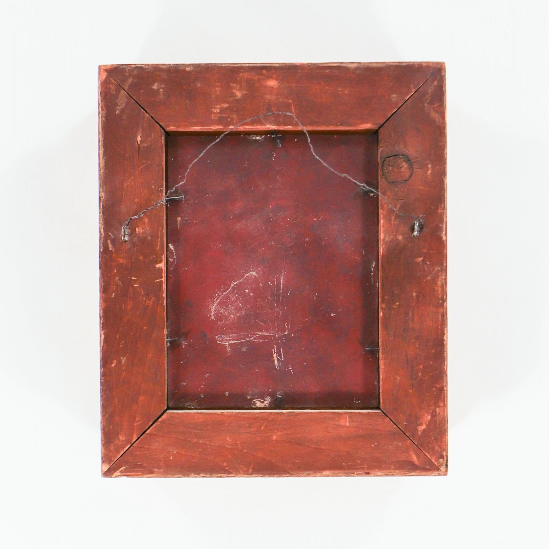 Condition: Painting with minor edge wear and small scattered paint losses, surface craquelure and light grime; metal support sound. Frame with noticeable rubbing, losses and chipping to the gilt gesso, consistent with age; structurally stable and presentable. Quite captivating.