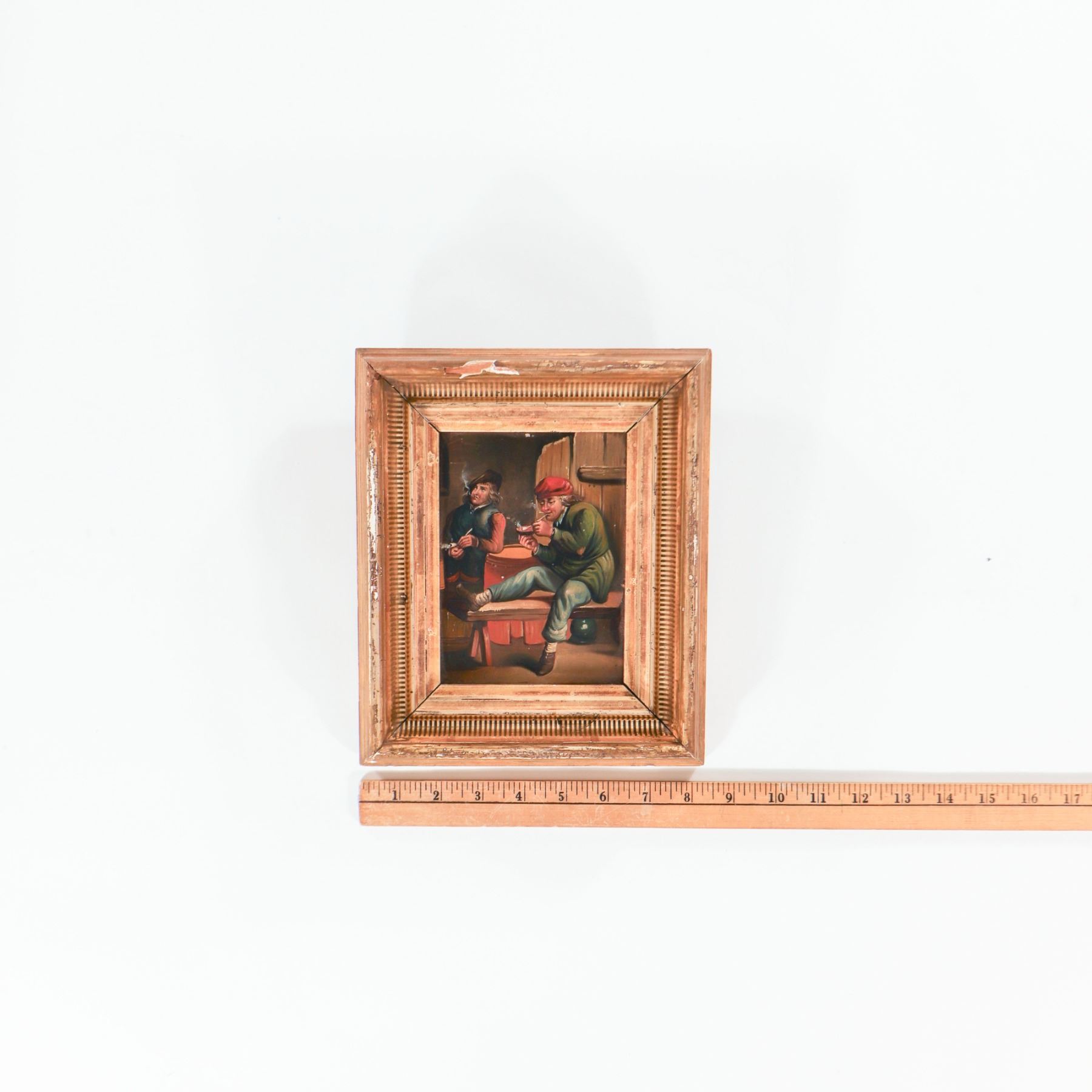 Oil on tin panel, unsigned, depicting two peasants drinking and smoking at a table in a rustic interior, one figure raising a glass while the other leans back in laughter, a jug and other tavern objects on the floor and table. The work is set within its original gilt gesso frame, the scene painted in the manner of 17th-century Dutch tavern interiors.