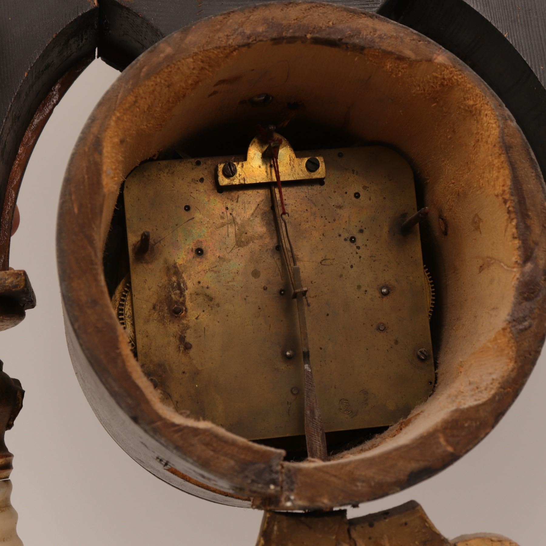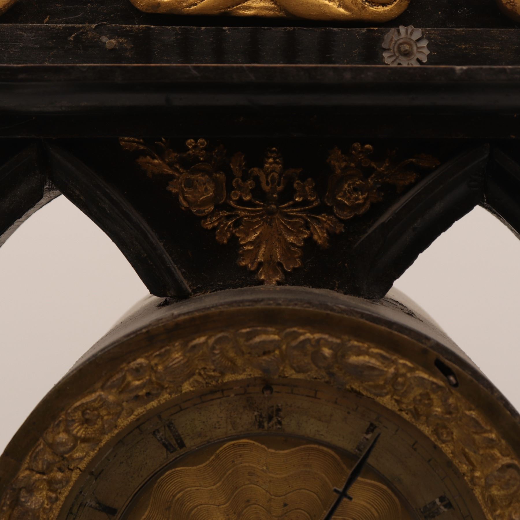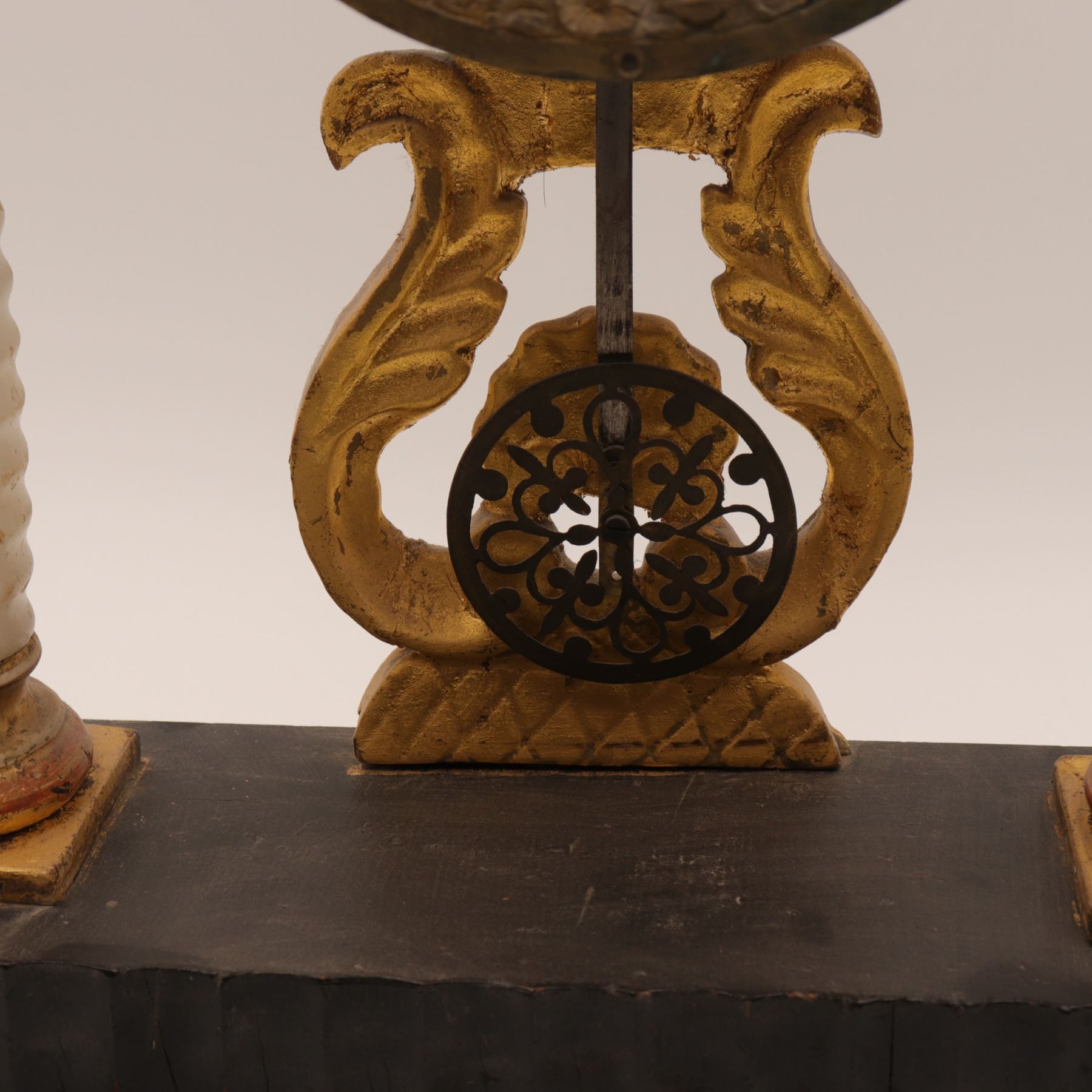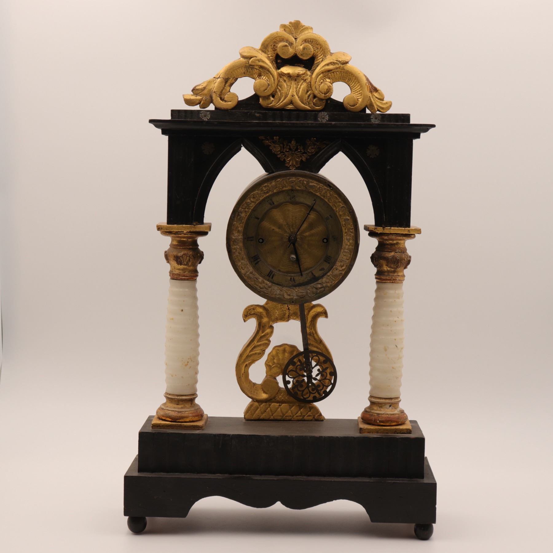 The ebonized architectural case with gilt foliate crest above pointed arches, suspending a circular brass Roman dial and lyre-form pendulum, flanked by two white turned stone columns and raised on a stepped plinth with ball feet; the movement with thread-suspended pendulum, a feature consistent with Austrian Biedermeier portico clocks. Probably Austrian, likely Vienna, circa 1830–1850. Untested and may require servicing.