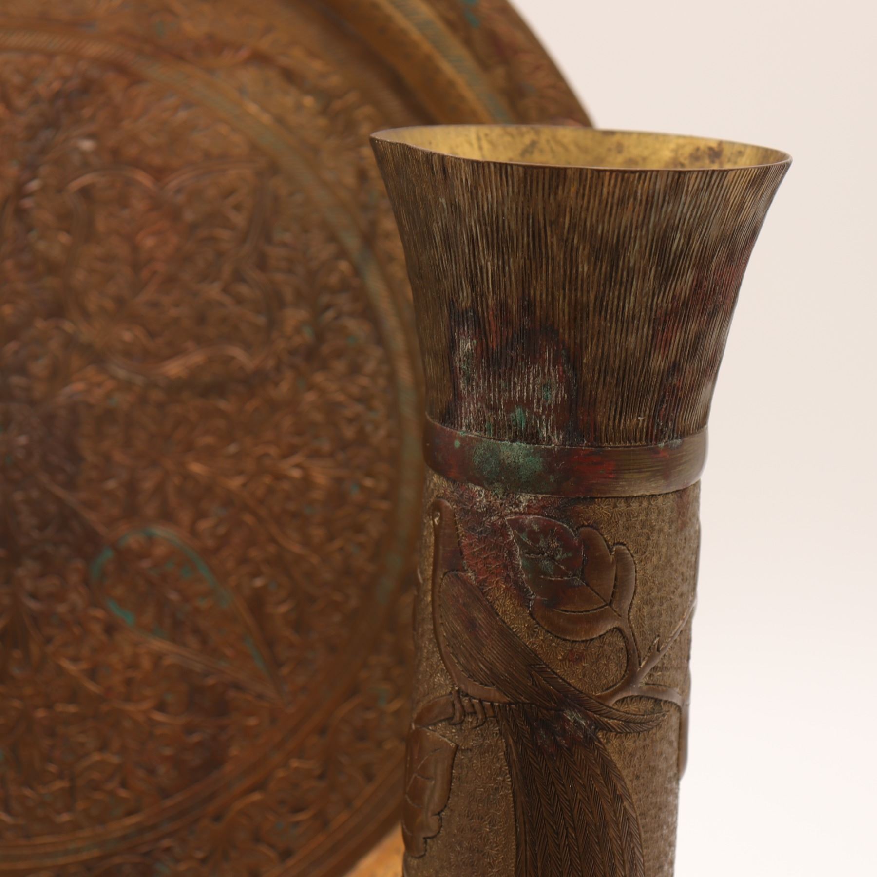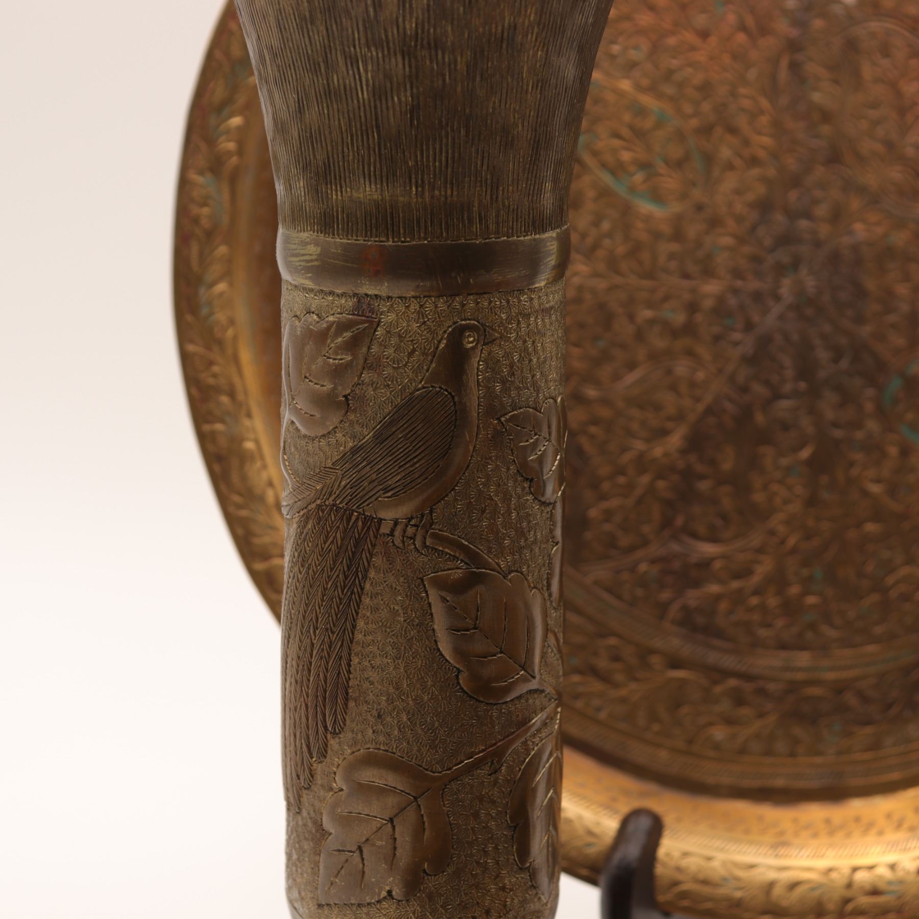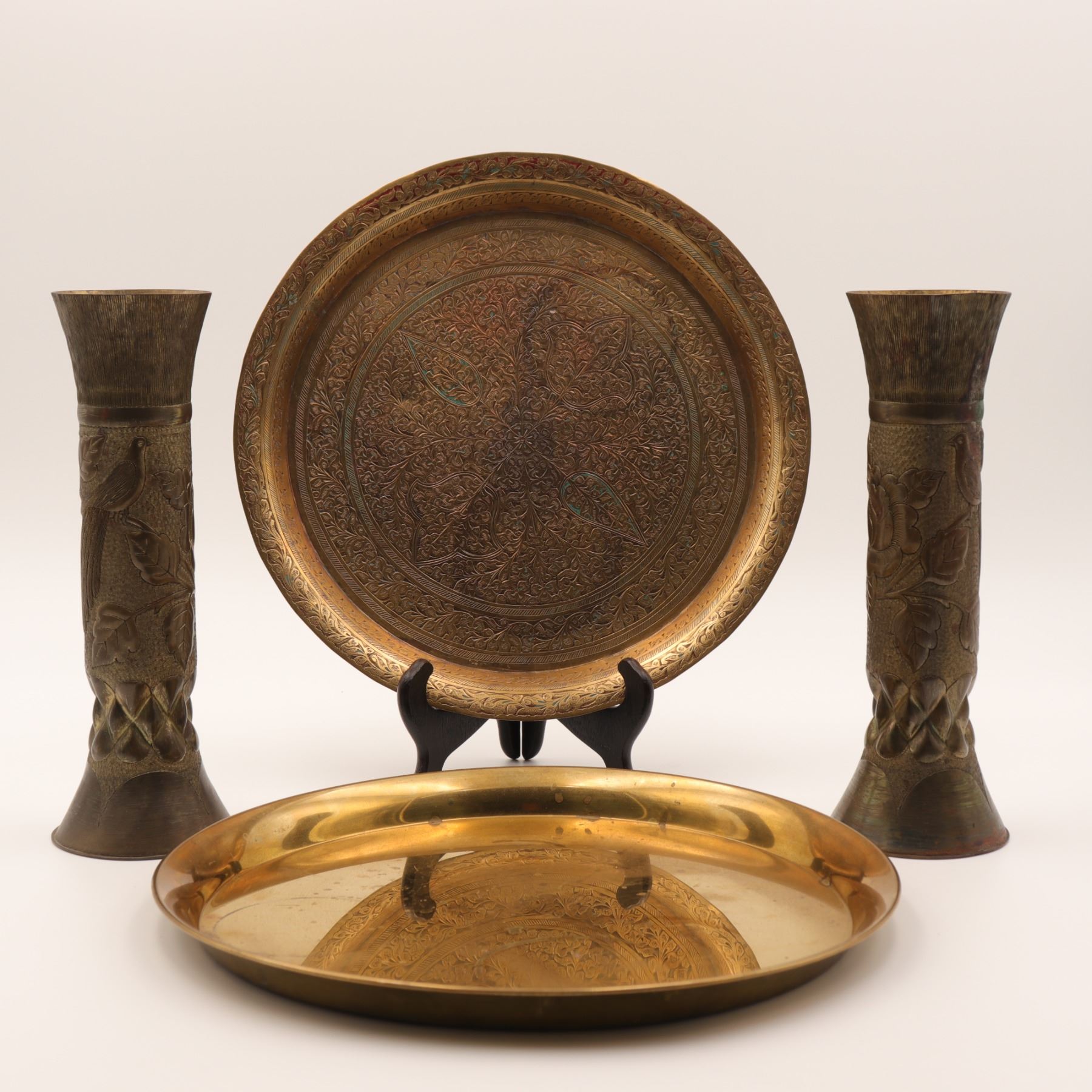 A decorative four-piece Indian metalwork group comprising a pair of trumpet-form brass or copper-alloy vases, a circular hand-engraved tray or charger, and an associated plain polished brass tray. The matching vases are worked in low relief with birds perched among foliate scrolls over textured grounds, with flared rims and interlaced bands above the feet, showing repoussé and chased decoration rather than simple hammering alone. The circular tray is densely engraved with a central flowerhead, scrolling vegetal ornament, and leaf-shaped reserves in a Kashmiri taste. The plain tray is of simpler rolled-rim form and appears associated. Surface wear, oxidation, patina, scratches, and spotting throughout; no major splits or losses observed.