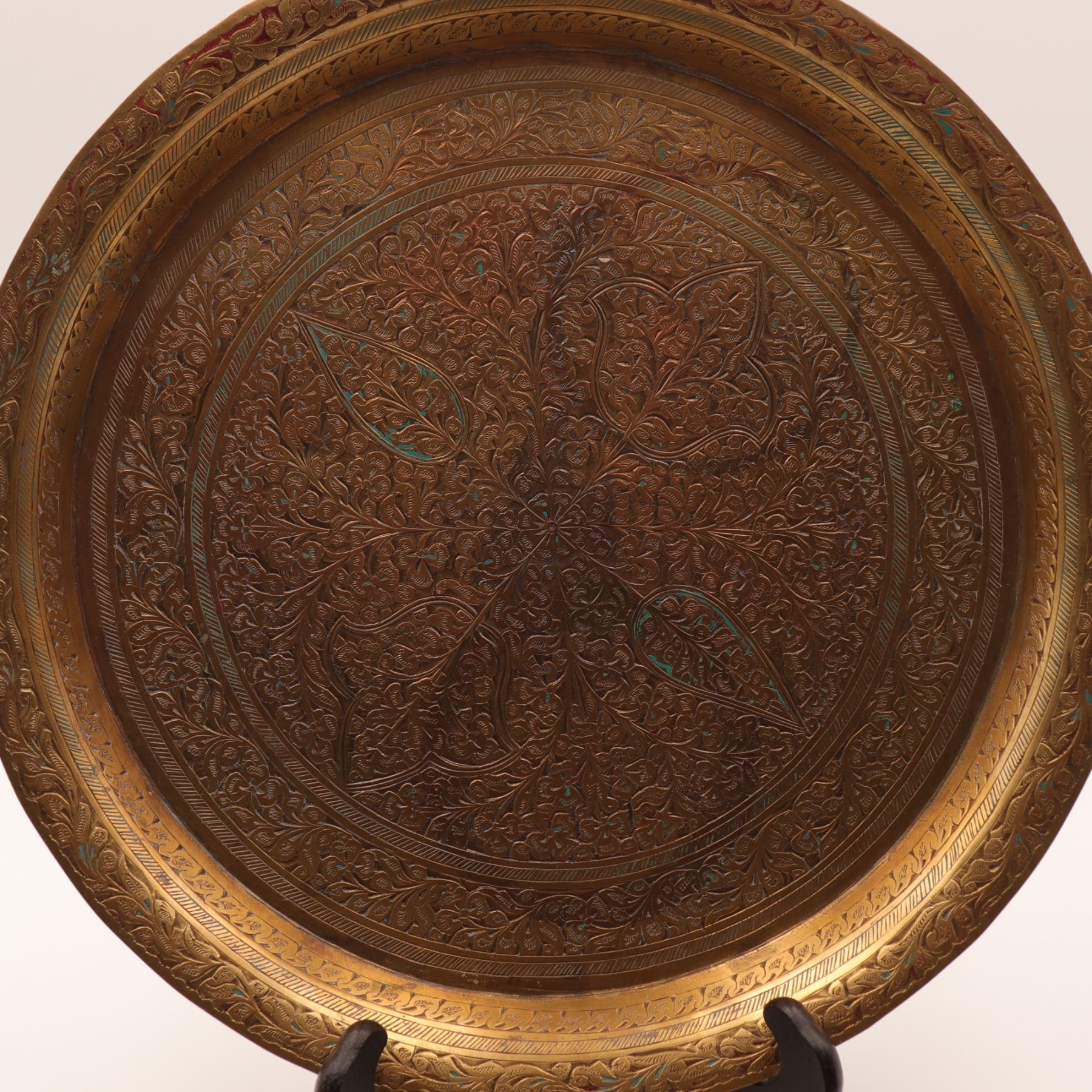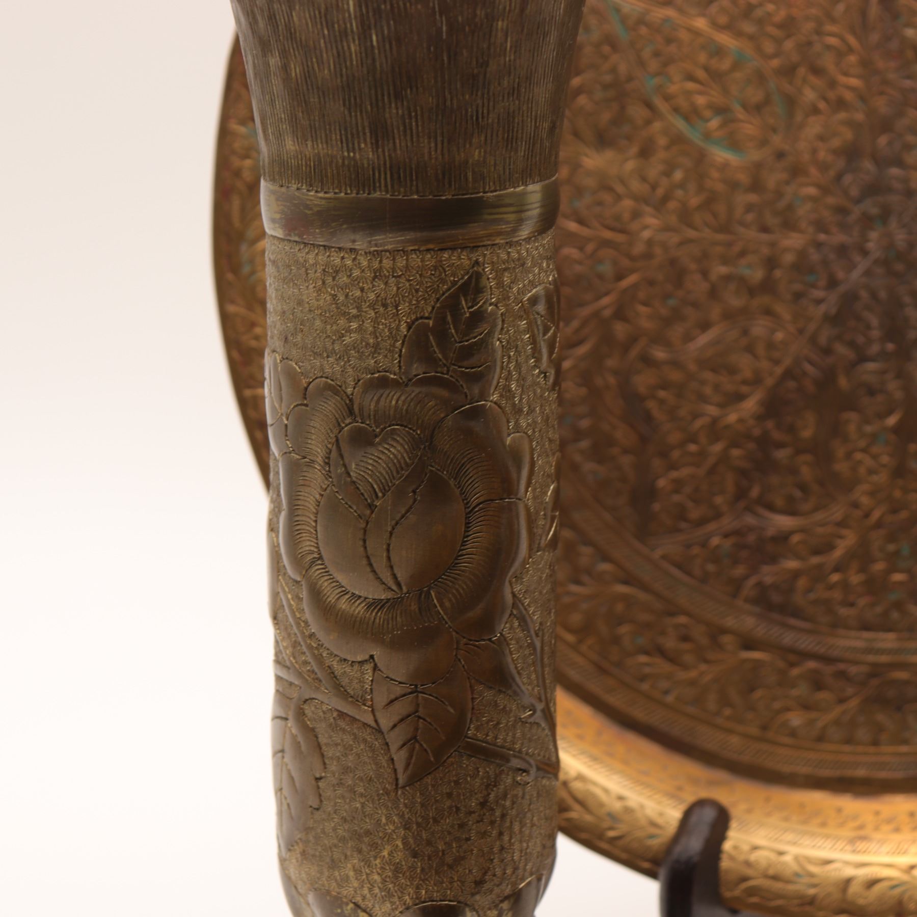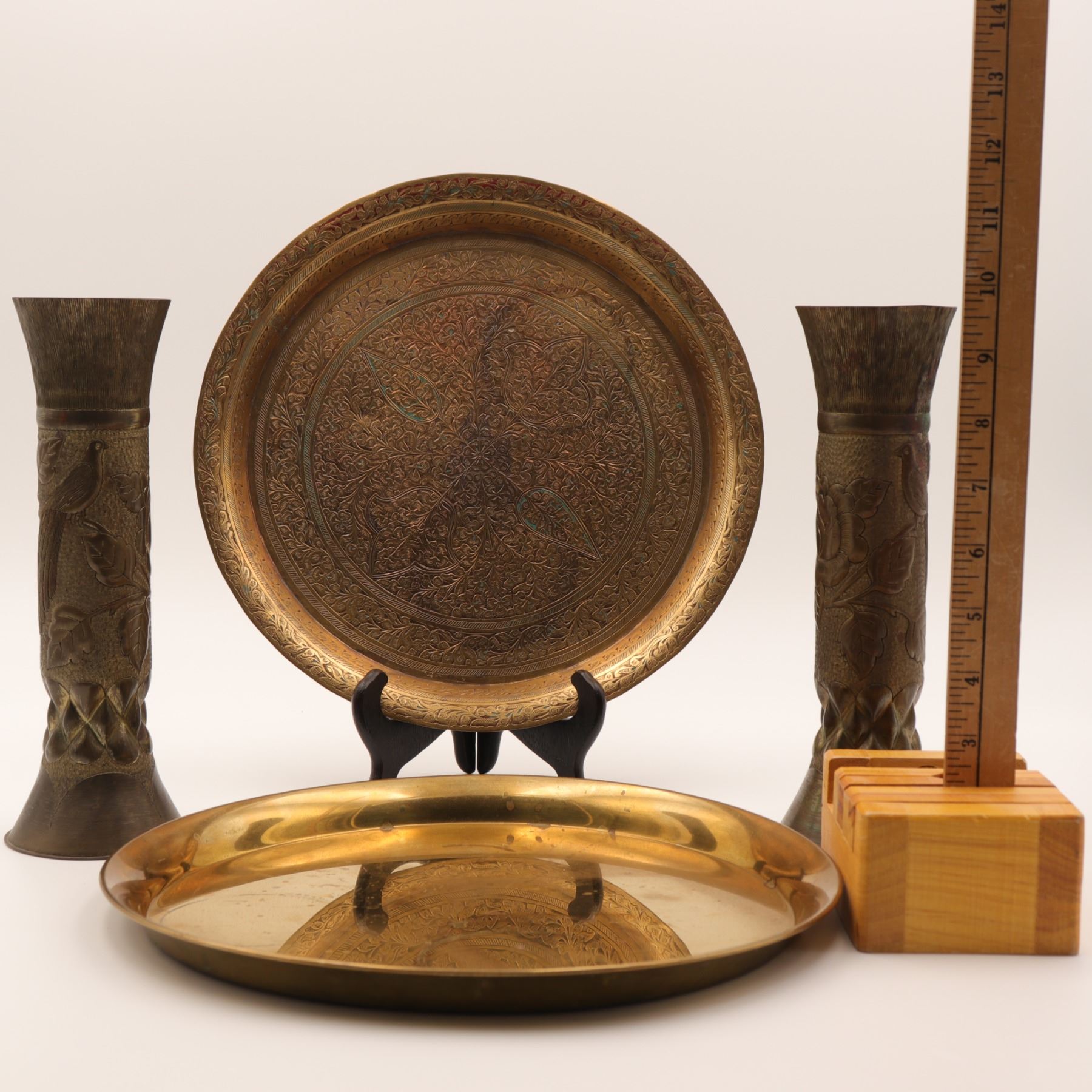Lot 32 Pair of Indian Repoussé and Chased Vases with Kashmiri-Style Engraved Tray and Brass Tray, 4 pcs