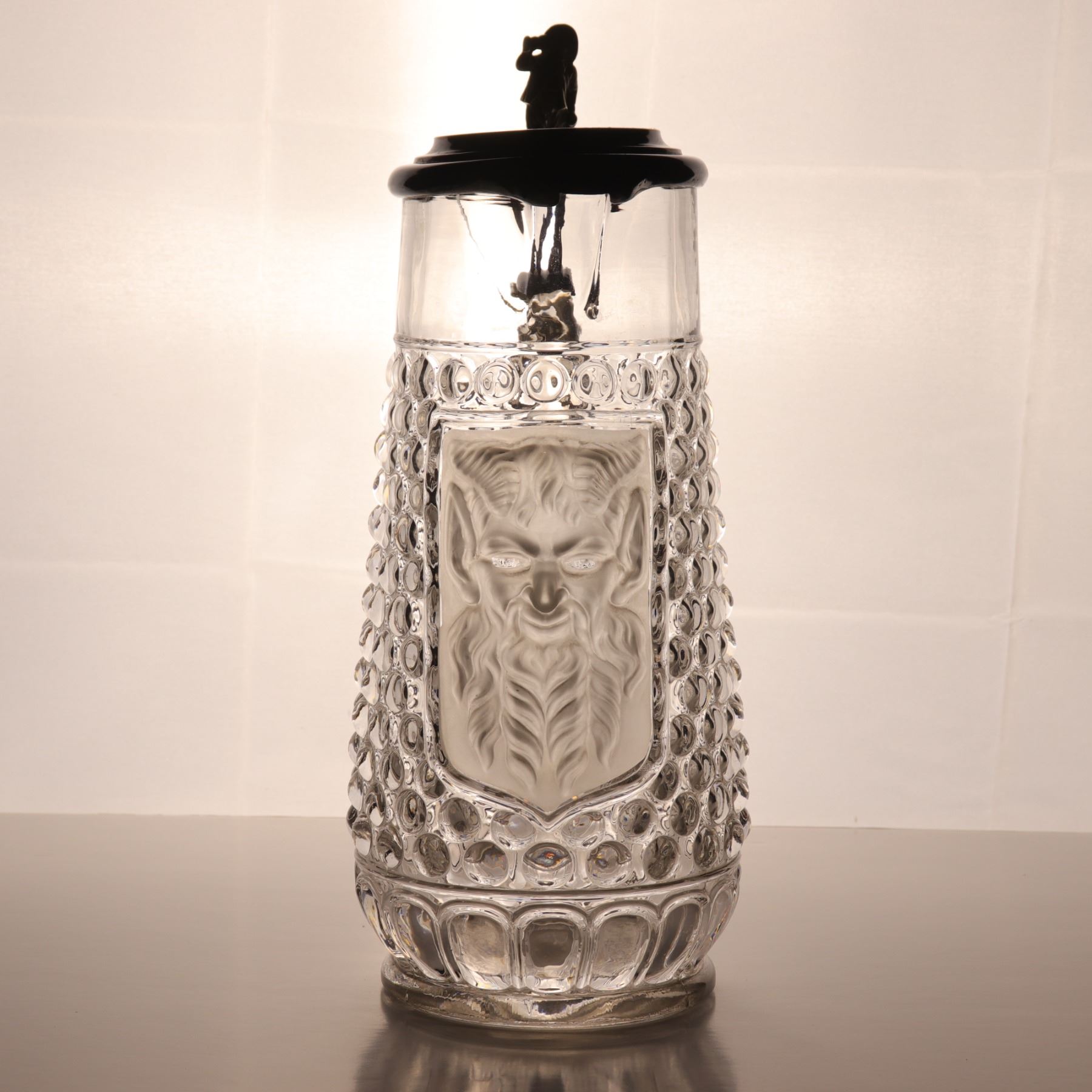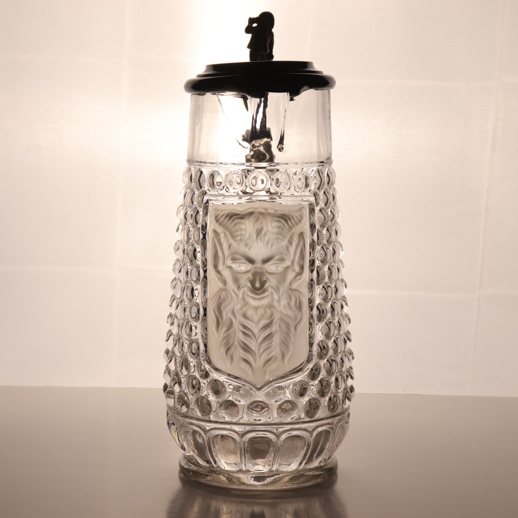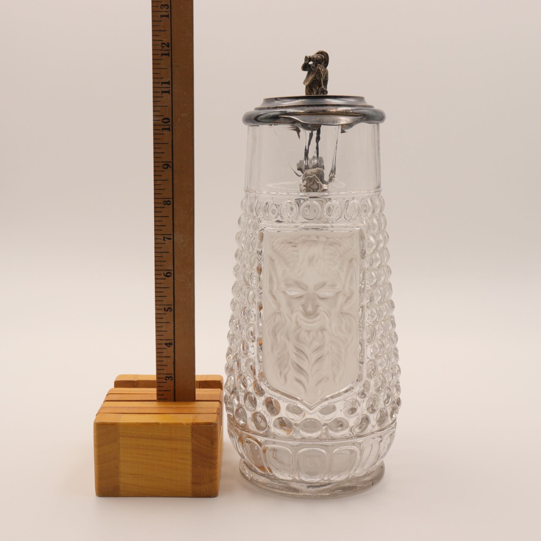 Molded clear-glass combination stein/pouring pitcher with a notched pouring lip, the body decorated with allover raised bosses and a central frosted relief mask panel (satyr/"green man" type), above a molded base band. Fitted with a hinged pewter lid and figural finial, the top engraved with a script monogram (appears "RH") within an ornamental border. Condition note: crack to the upper rim area as shown.