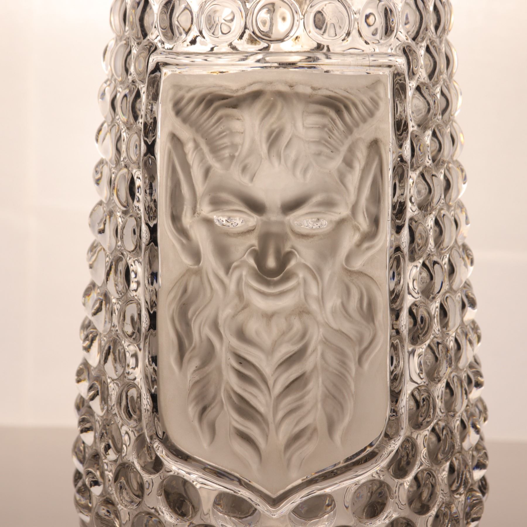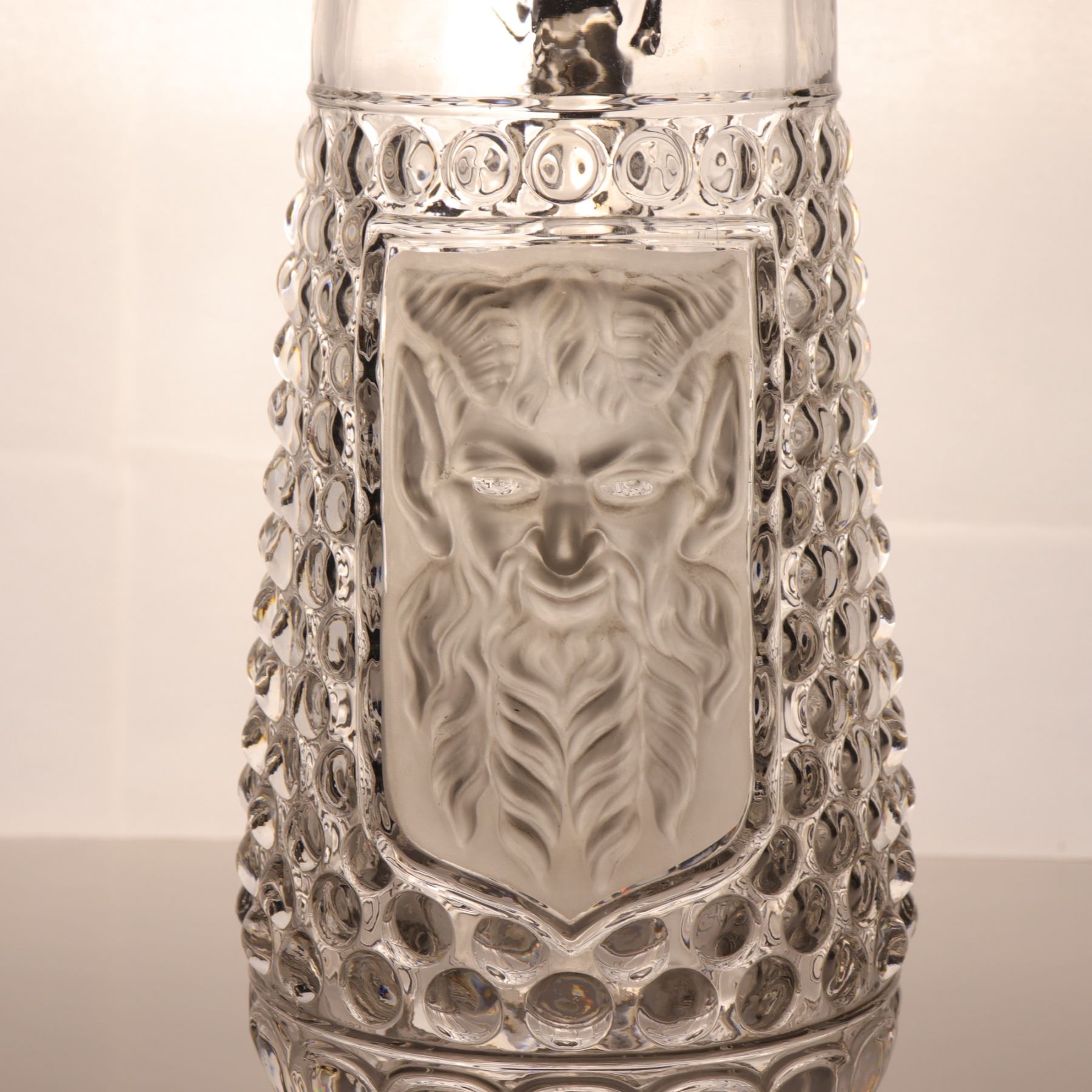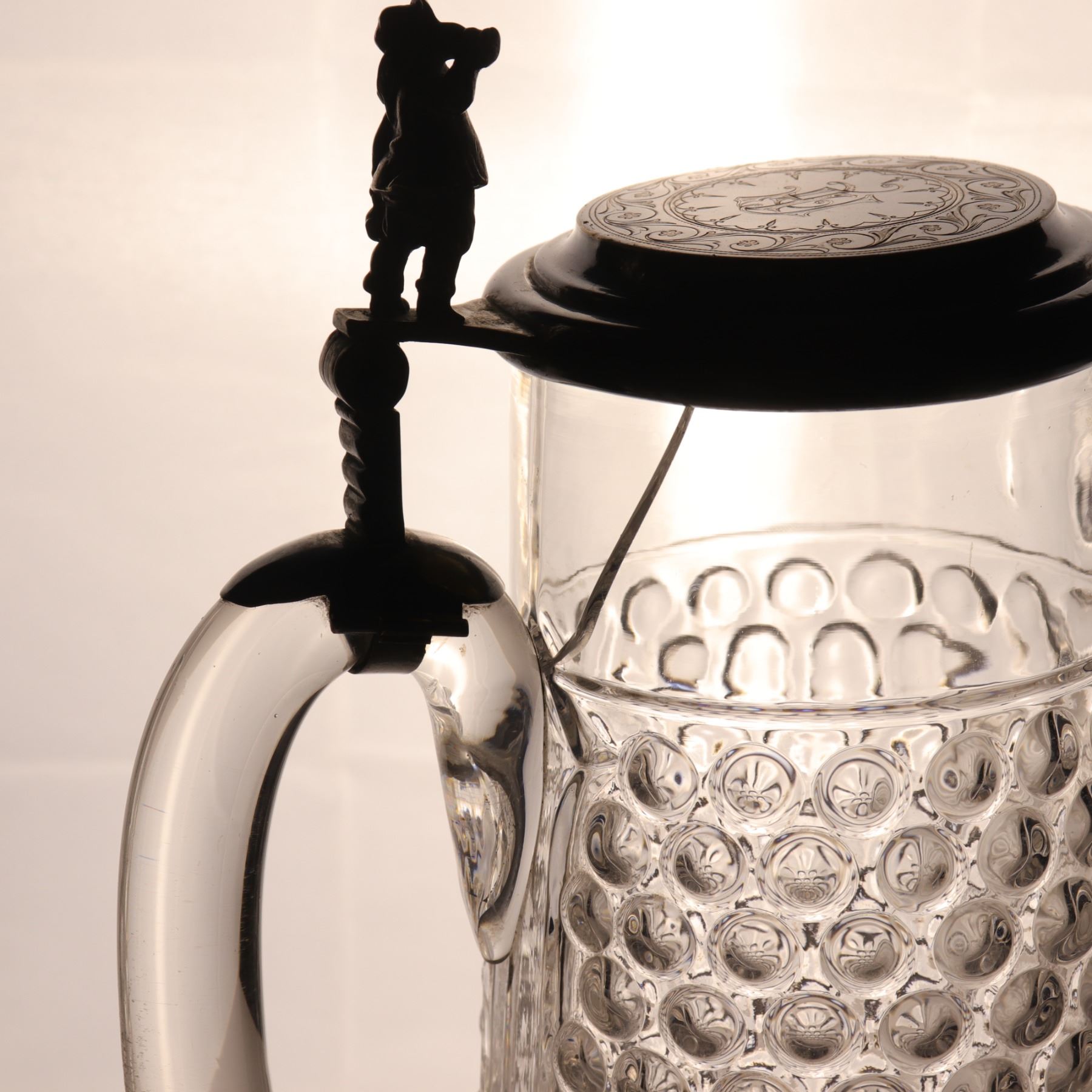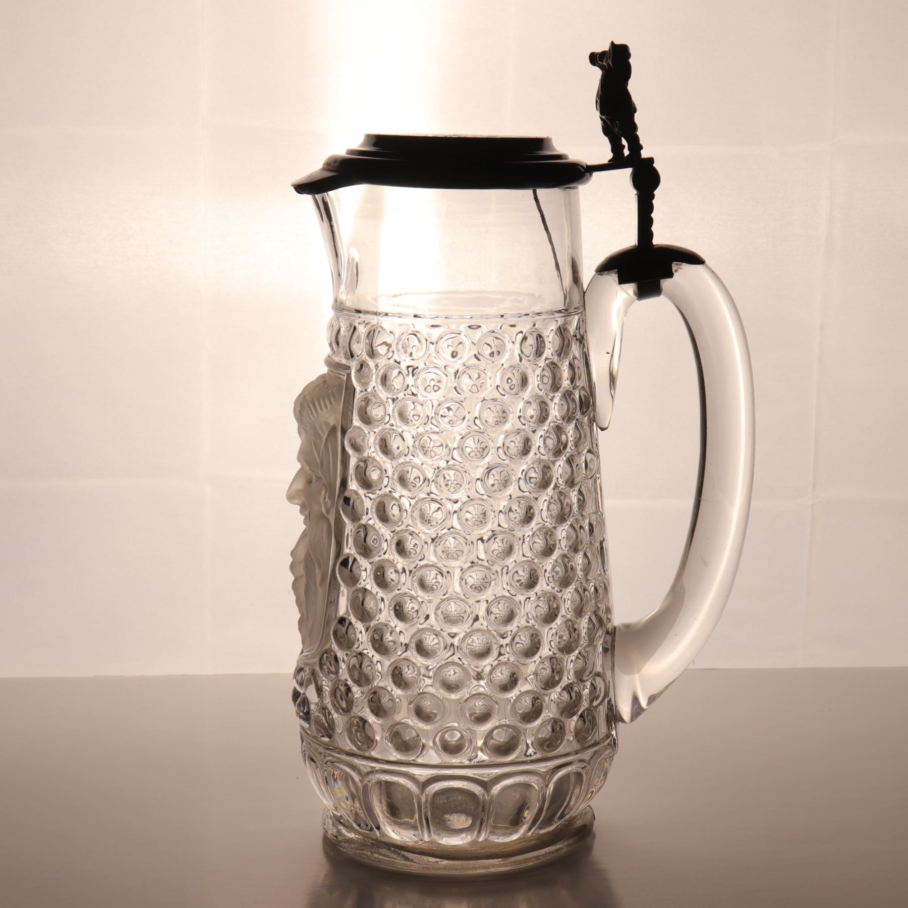 Molded clear-glass combination stein/pouring pitcher with a notched pouring lip, the body decorated with allover raised bosses and a central frosted relief mask panel (satyr/"green man" type), above a molded base band. Fitted with a hinged pewter lid and figural finial, the top engraved with a script monogram (appears "RH") within an ornamental border. Condition note: crack to the upper rim area as shown.