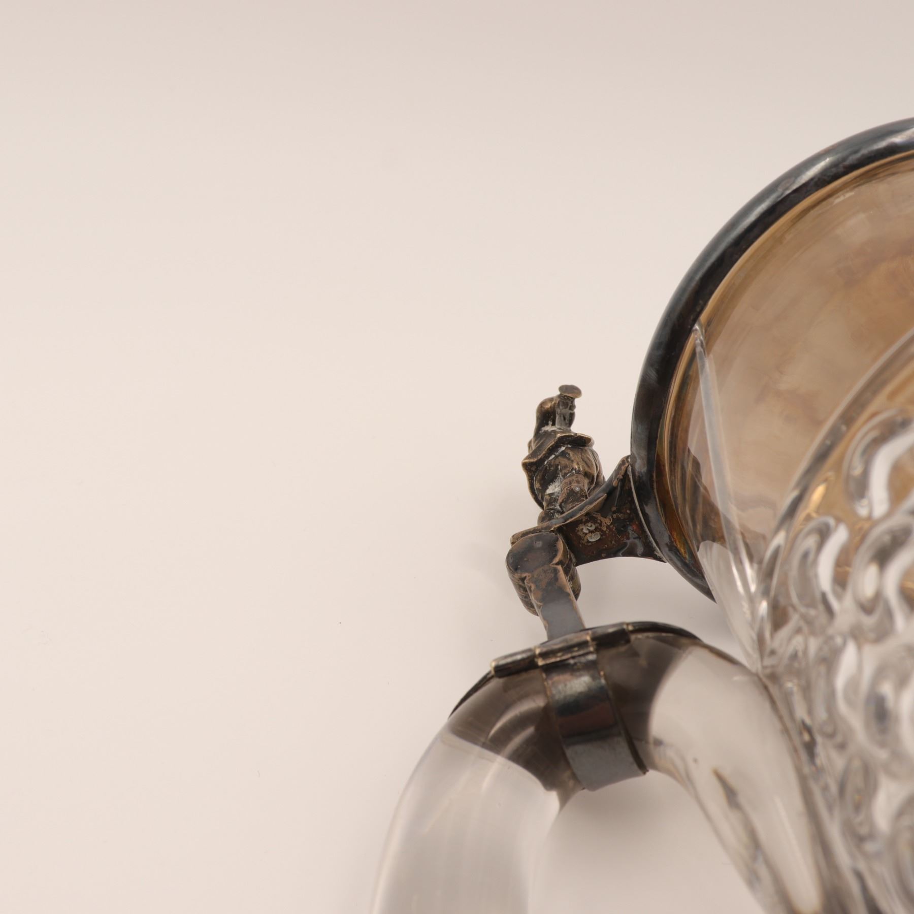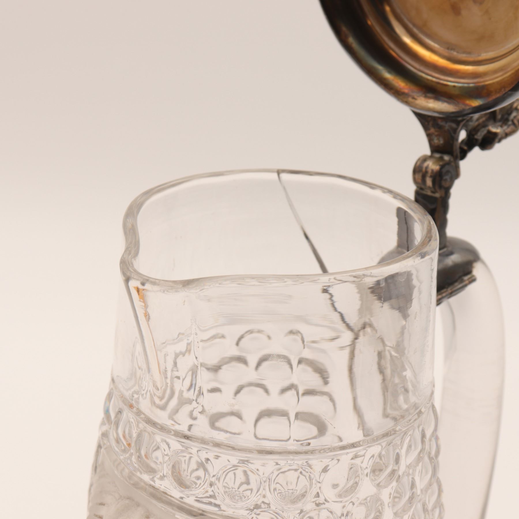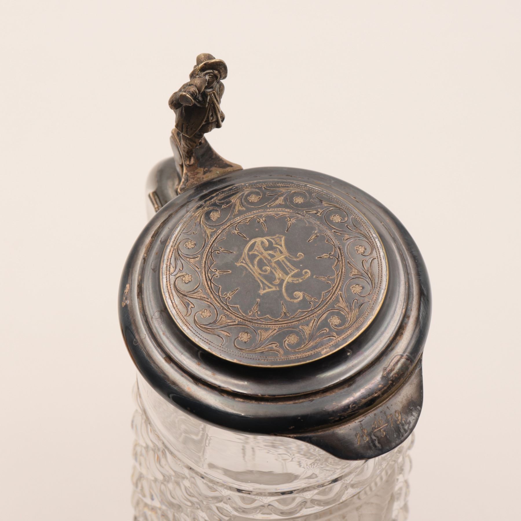 Lot 44 Central European-Style Glass "Stein & Carafe" Lidded Pitcher with Mask Panel and Monogrammed Lid