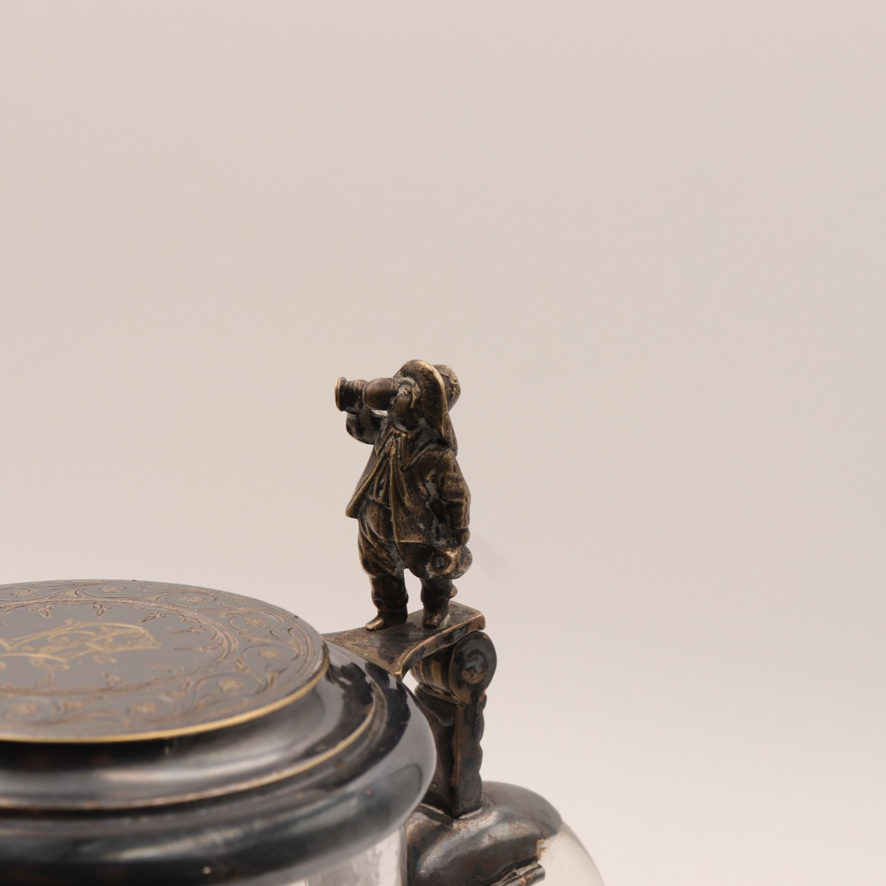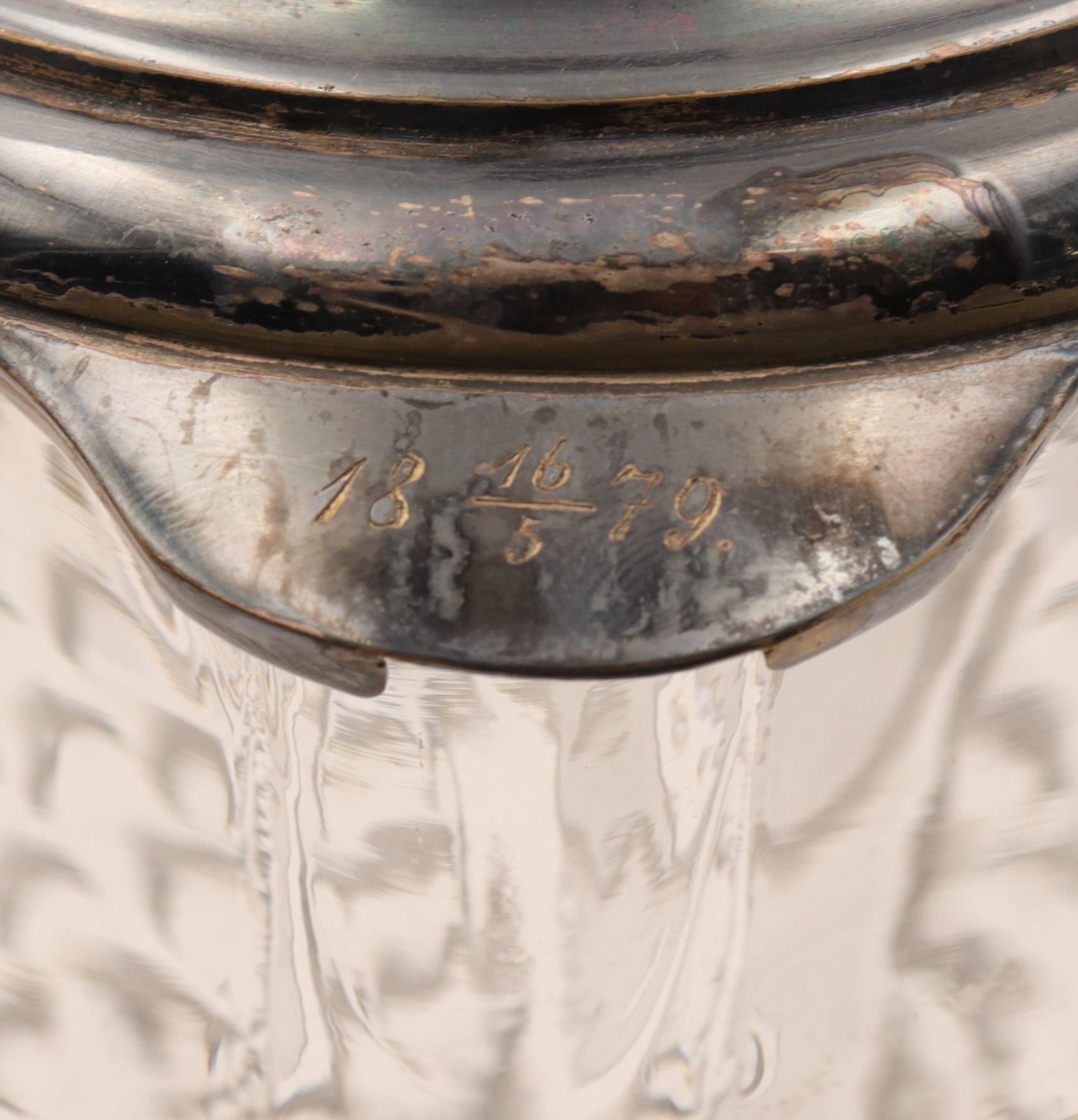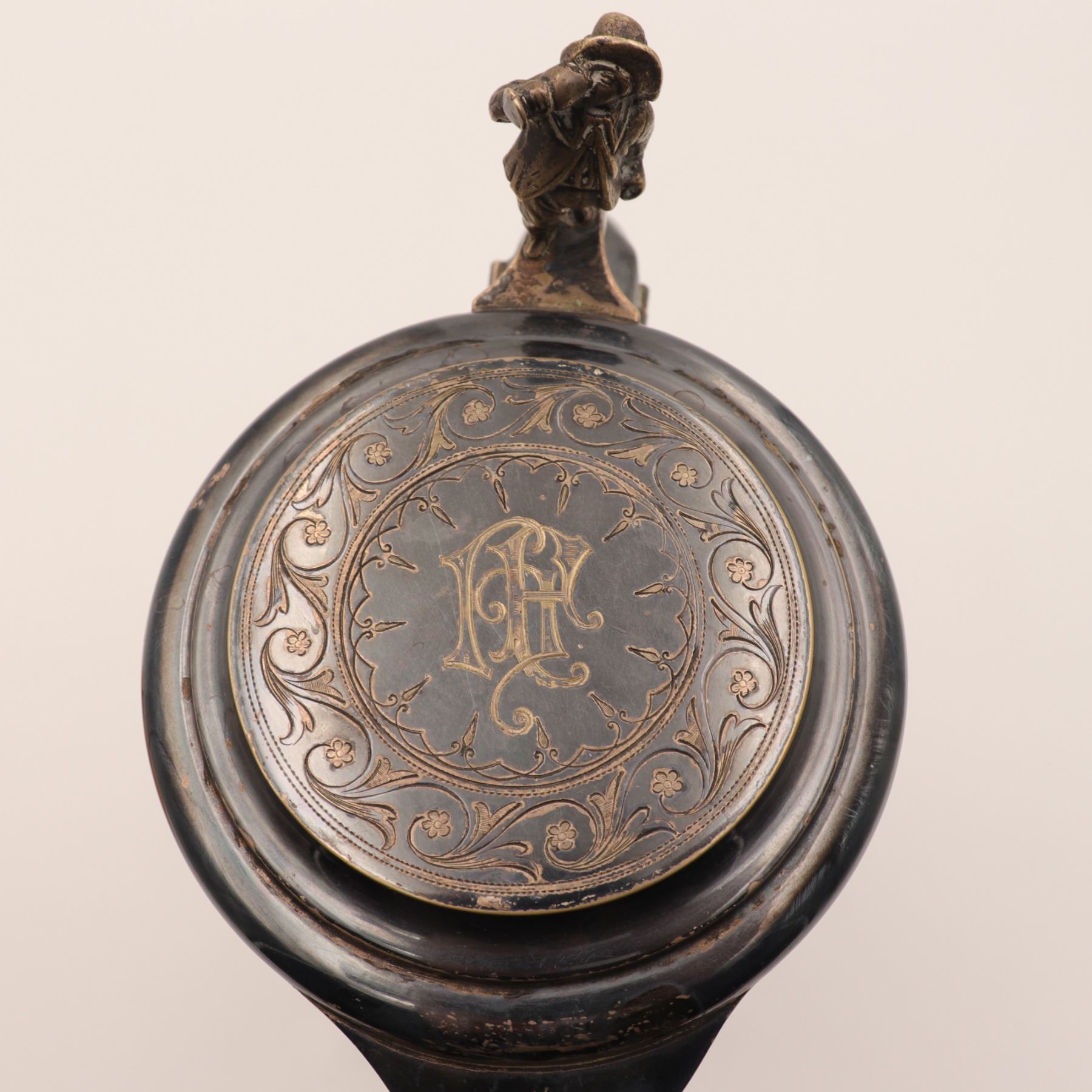 Lot 44 Central European-Style Glass "Stein & Carafe" Lidded Pitcher with Mask Panel and Monogrammed Lid