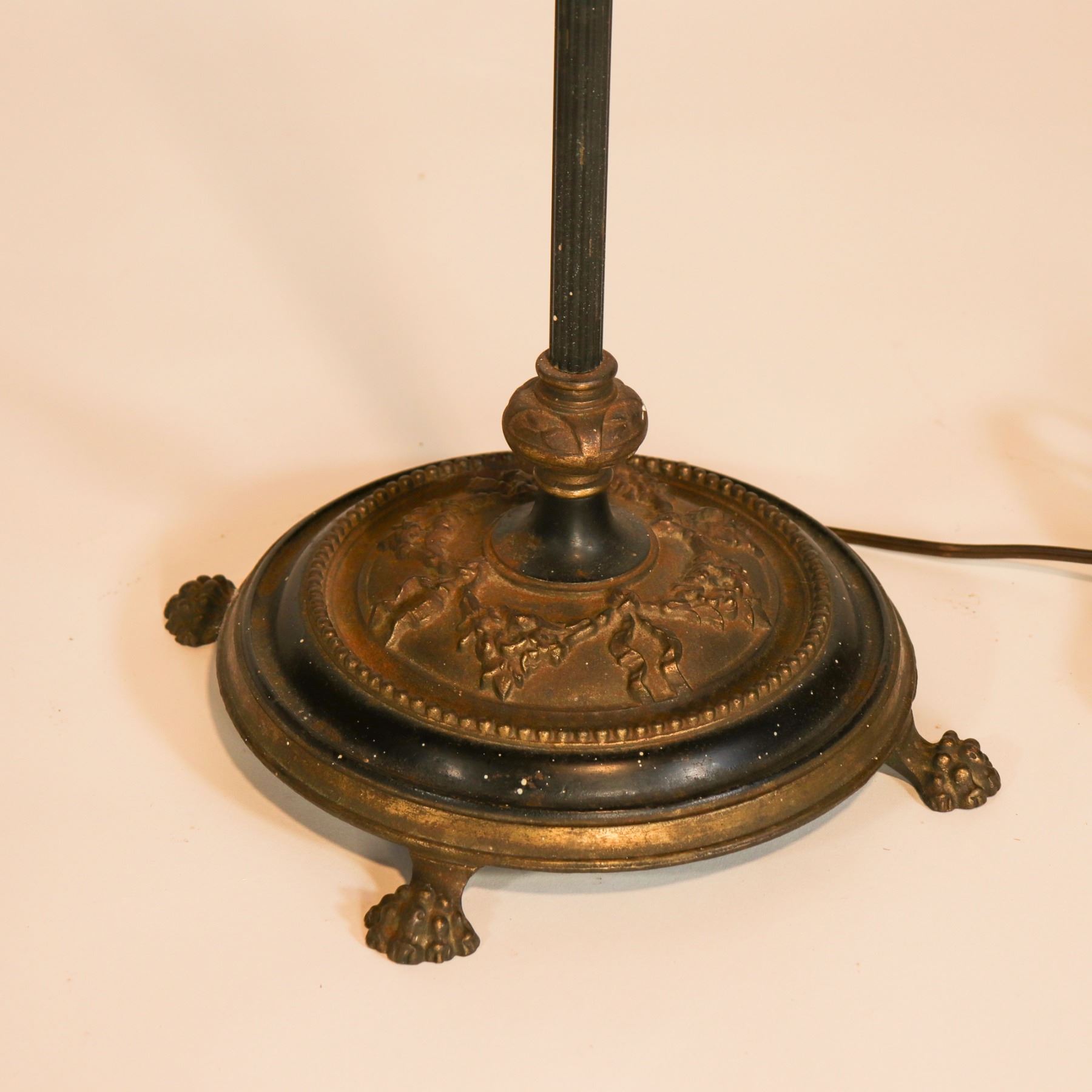 Cast-metal floor lamp with circular weighted base on four lion-paw feet, the domed center decorated with classical swags and beaded border and finished in an aged bronze and black patination. The slender, reeded standard rises to a twin candle-form light cluster with drip sleeves and an upper finial, originally intended to support a shade or reflector (not present). Likely iron or spelter with bronzed finish, American, circa 1920-1940, in a neoclassical / Colonial Revival style. Sold without shade and with electrical condition unknown.
