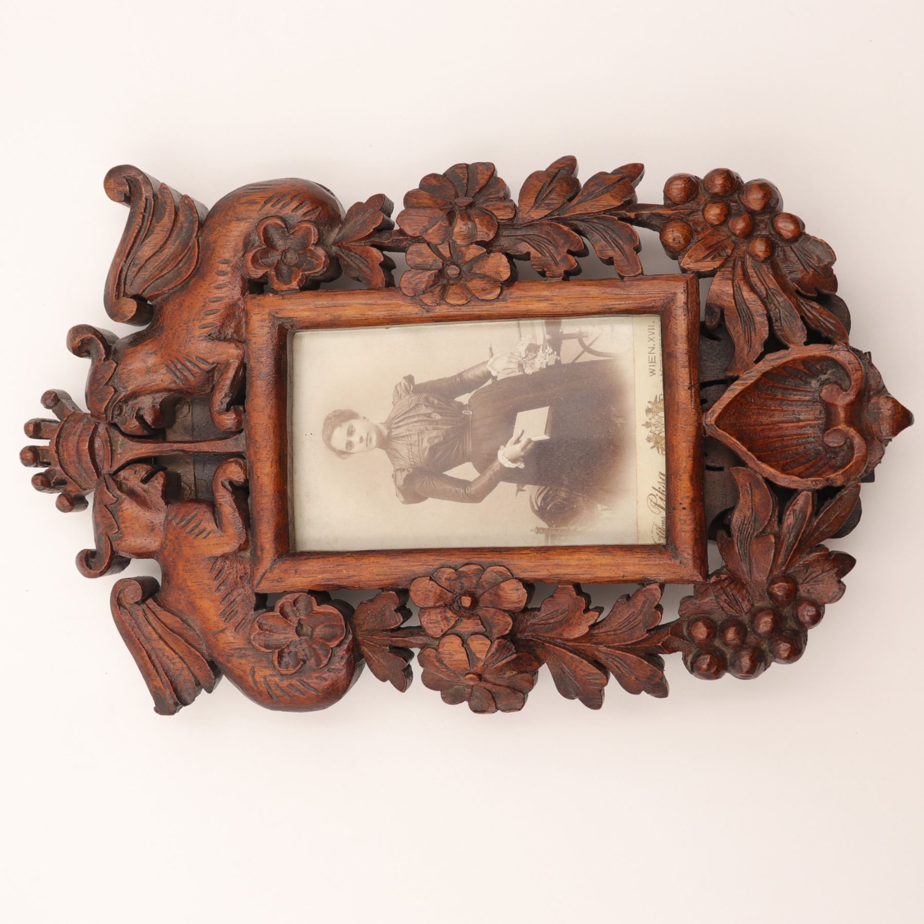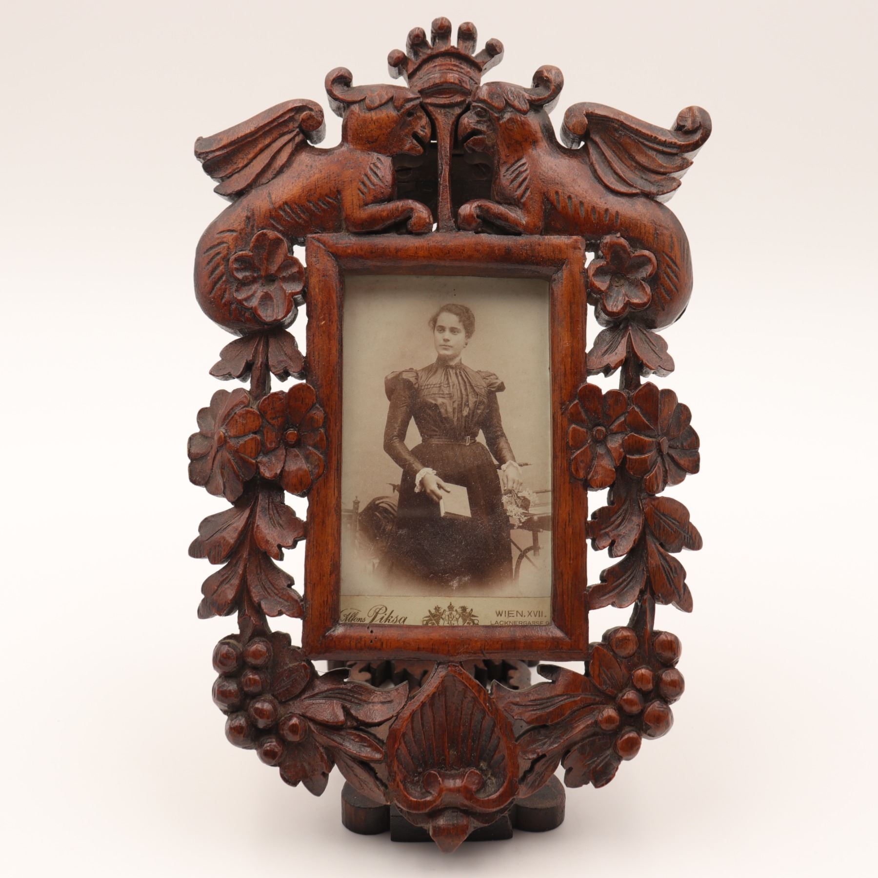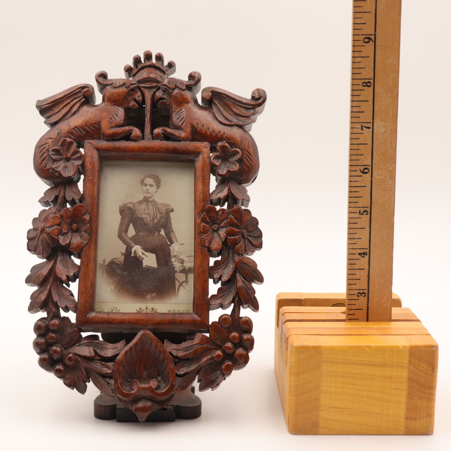 Group of three small standing frames, including a carved wooden folding easel frame containing an antique studio photograph of a seated woman identified to Vienna, together with two Art Deco chrome oval frames enclosing needlework embroideries of children. Mixed materials and dates, sold as a decorative mantel group. Light age wear to frames and inserts.