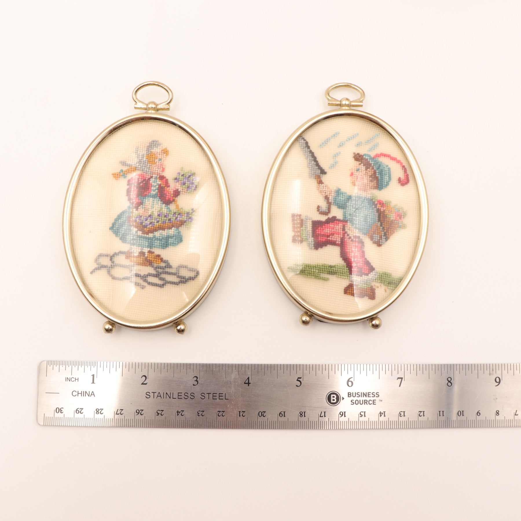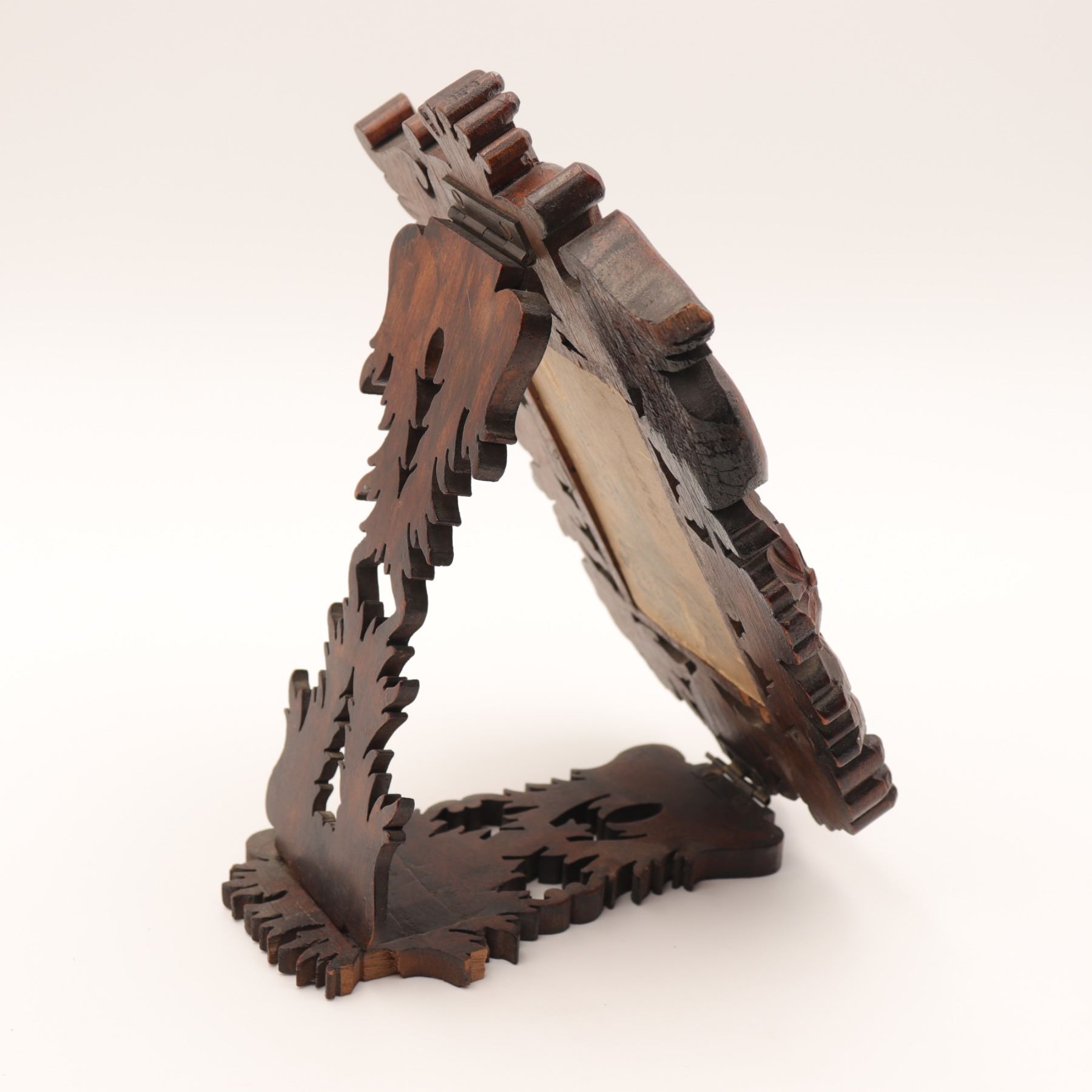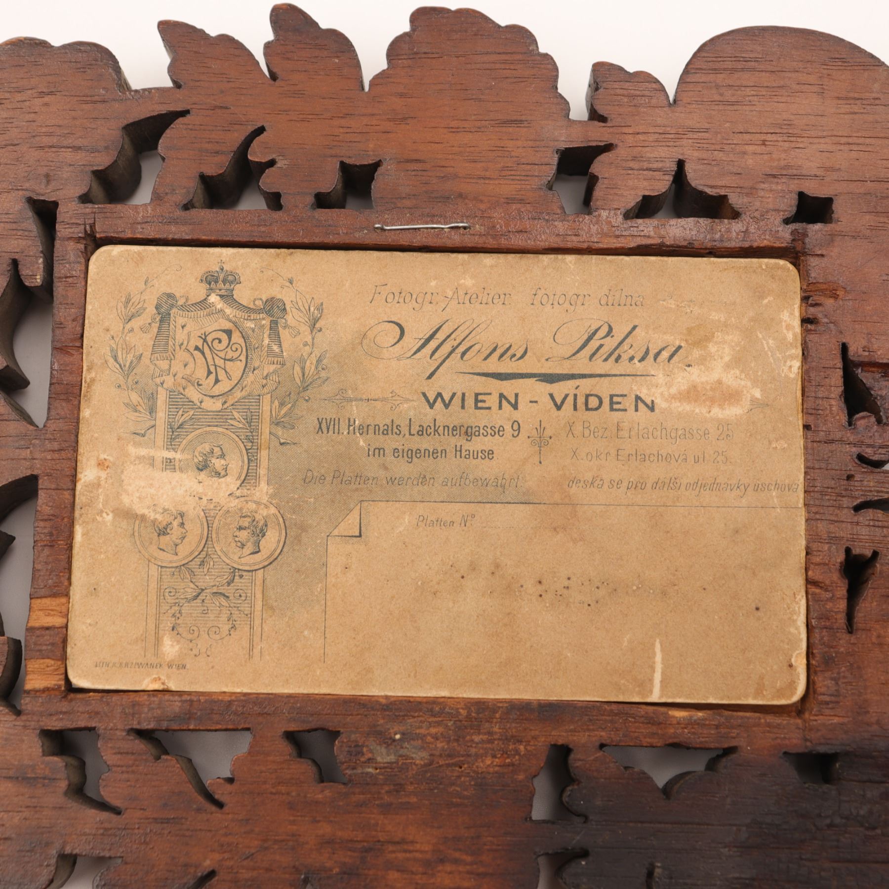 Group of three small standing frames, including a carved wooden folding easel frame containing an antique studio photograph of a seated woman identified to Vienna, together with two Art Deco chrome oval frames enclosing needlework embroideries of children. Mixed materials and dates, sold as a decorative mantel group. Light age wear to frames and inserts.