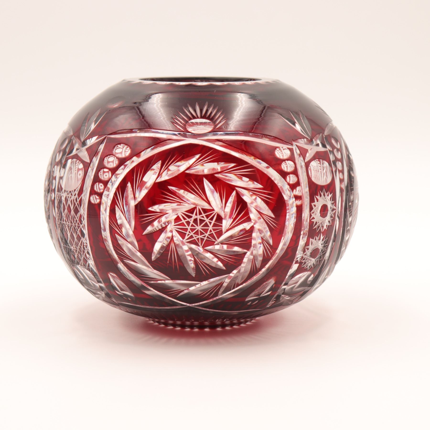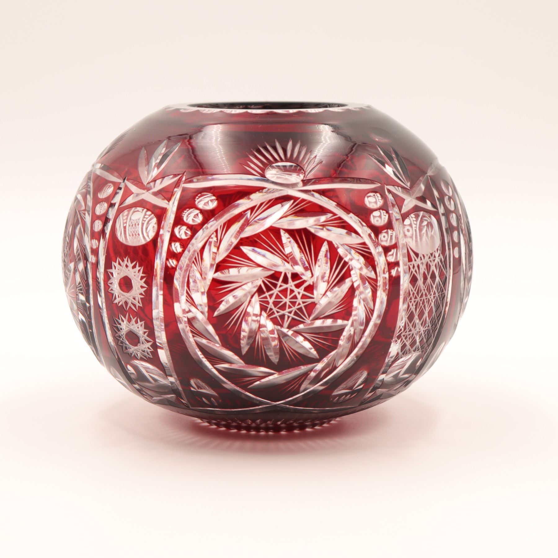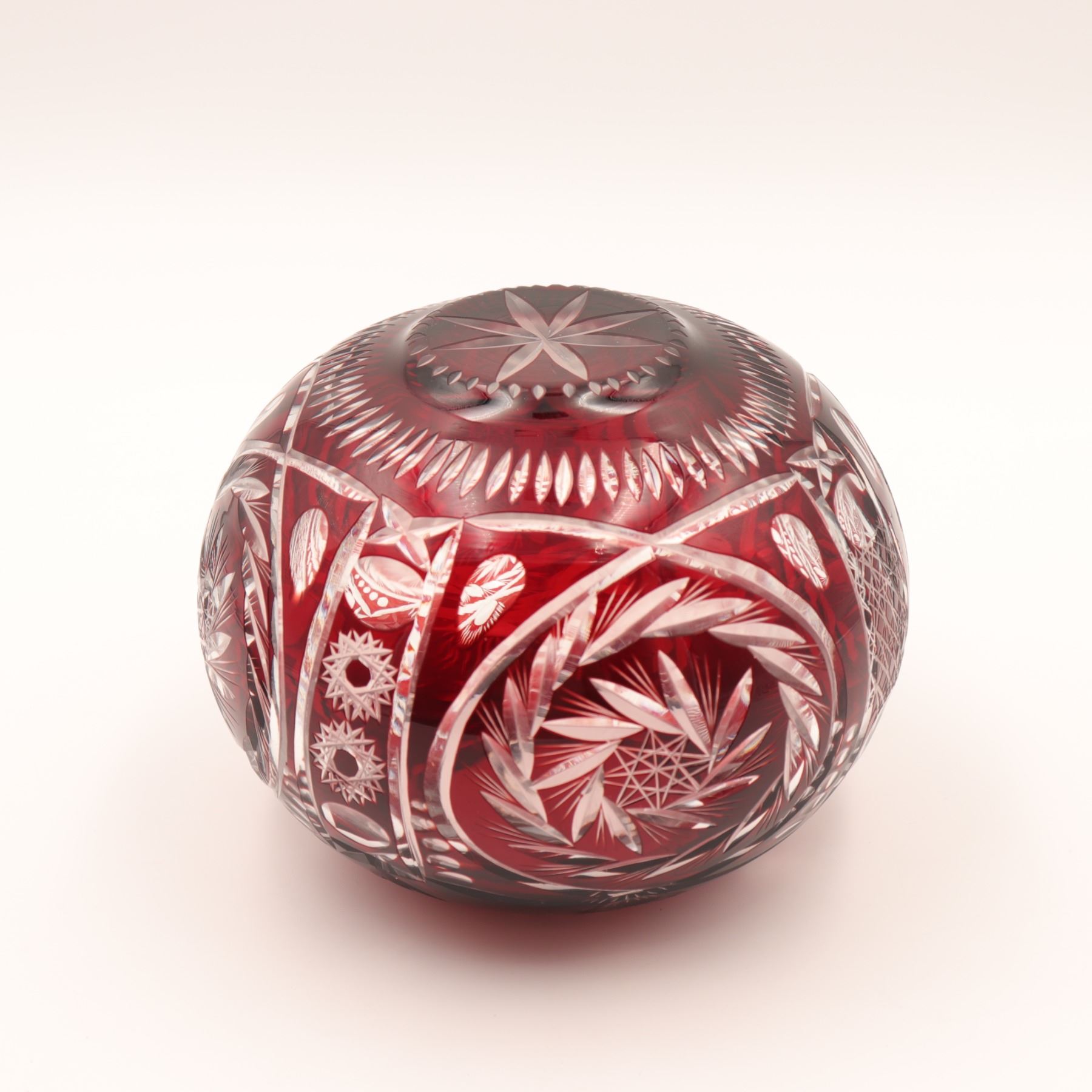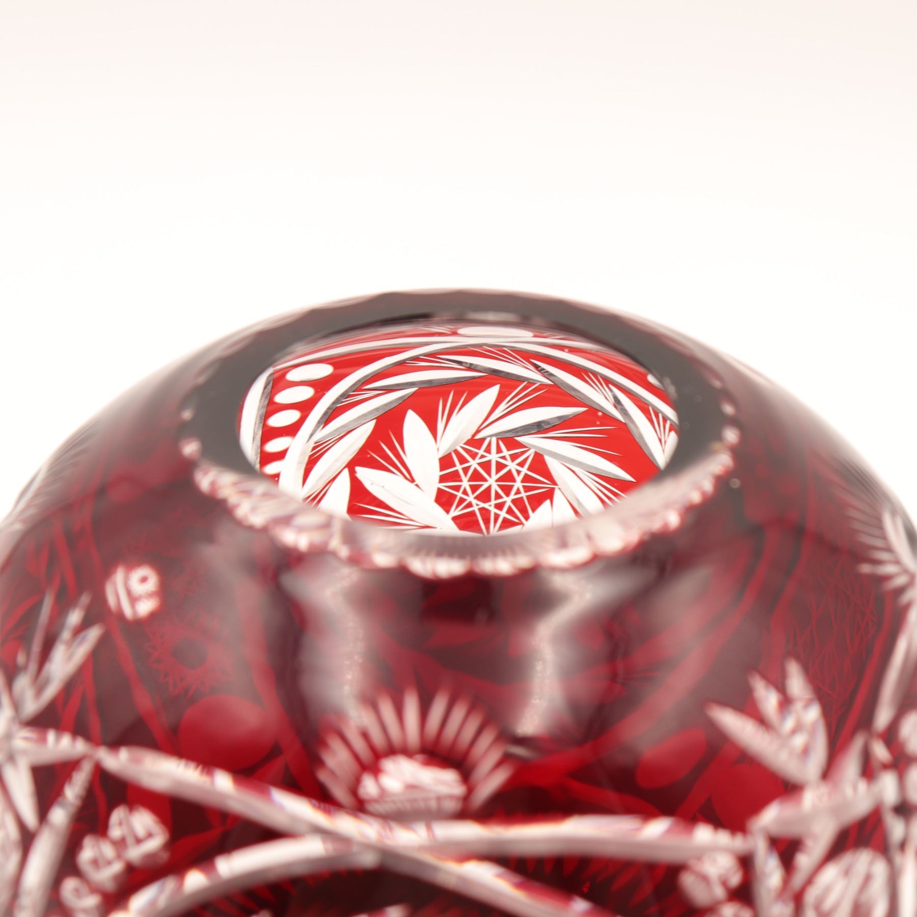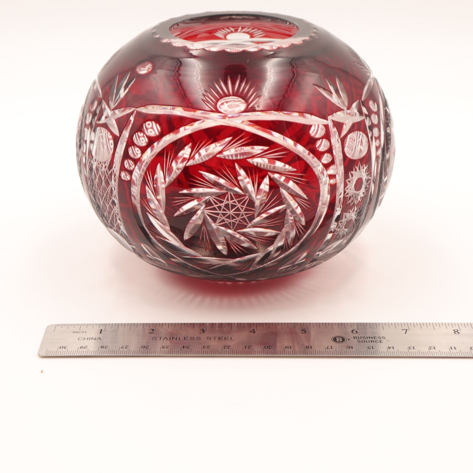 Bohemian ruby cut-to-clear crystal vase of spherical form, deeply wheel-cut with hobstars, pinwheels, sunbursts, lattice panels, and leaf swags, executed in thick ruby overlay and polished to brilliance. A finely made Central European example from the interwar to mid-century period, notable for its crisp cutting and rich coloration. Perfect condition, with no chips or cracks.