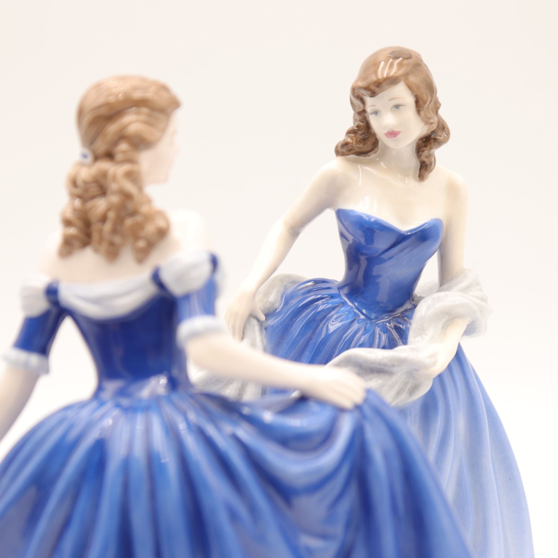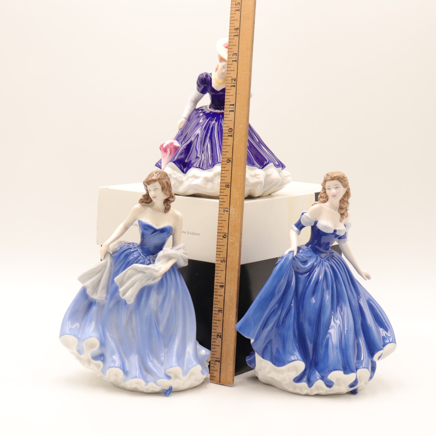 Group of three Royal Doulton "Pretty Ladies" bone china figurines with original boxes, late 20th-early 21st century, each modelled as an elegant lady in swirling blue or violet gowns, finely hand painted and titled to the undersides (titles not fully checked), together with three original Royal Doulton boxes. Figures generally in very good condition with no obvious chips or cracks noted; light shelf dust; boxes with tape residue, writing, creases and general storage wear.