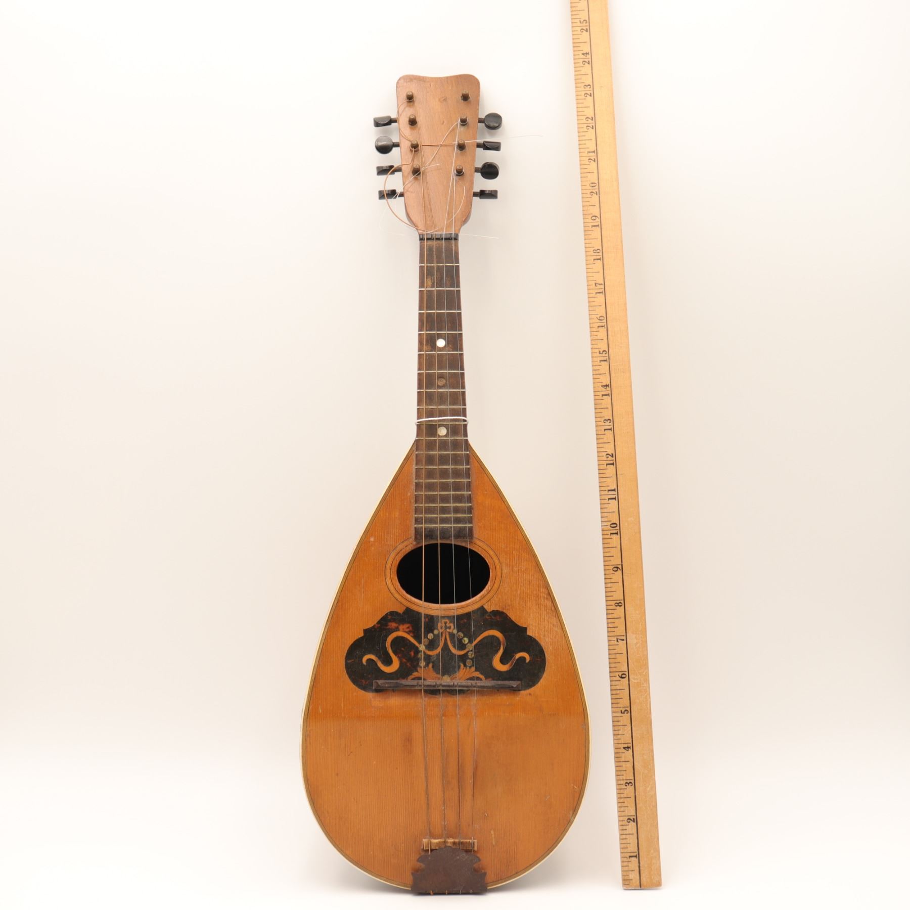 Unmarked bowl-back teardrop mandolin, probably European factory production, circa 1920-1940, with ribbed bowl back, spruce top and oval soundhole, fitted with a floating bridge above a painted tortoiseshell-effect pickguard decorated with scrollwork and small dot inlays, plain headstock with eight tuners for four string courses. Approx. 24 in. overall length. In fair, decorative condition with heavy surface wear, scratches and dirt to top and pickguard, wear and possible repair at the tailpiece area, oxidized hardware and worn fingerboard; strings old and instrument not guaranteed playable, sold as found for restoration or display.