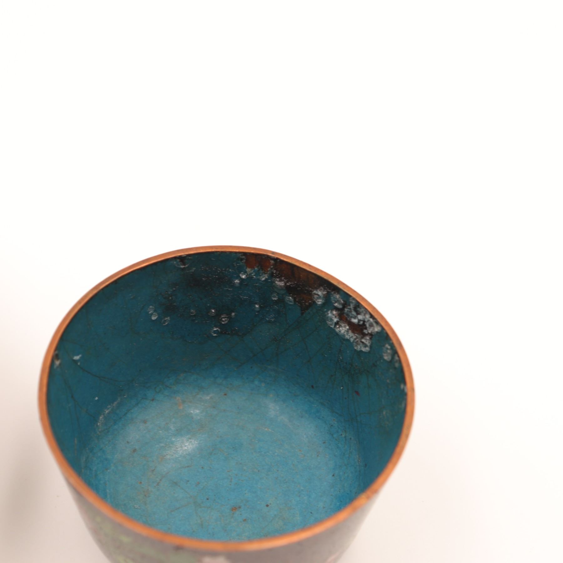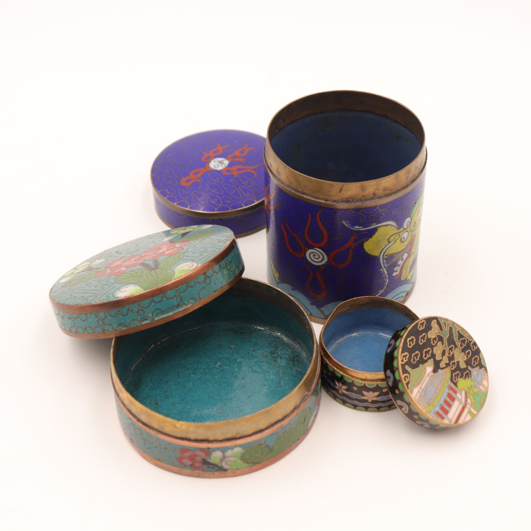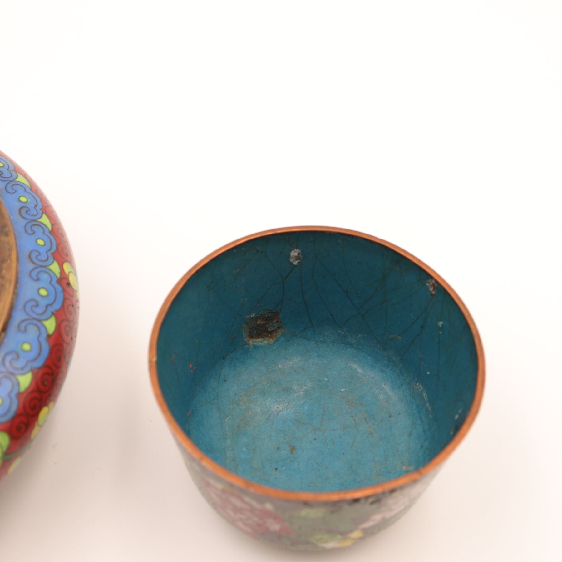 Decorative group of seven Chinese cloisonné enamel wares, early to mid-20th century, including a tall egg-form covered cup on pedestal stand, three circular covered boxes, two bowls, and a small covered salt or condiment with matching spoon. The tall egg-form example is decorated with lotus blossoms and scrolling foliage on an iron-red ground with key-fret pattern, with brass finial and mounts. The covered boxes include one cylindrical example with dragons and flaming pearls on a deep blue ground, together with two lower circular boxes with floral decoration on turquoise and black grounds. The bowls comprise a larger red-ground example with scrolling floral decoration and a smaller black-ground bowl with peony and foliate design. The covered salt is decorated with dragons on a black ground and raised on tripod feet. Turquoise and blue enamel interiors and bases throughout. A colourful and attractive assembled group of Chinese export cloisonné, well suited for display.