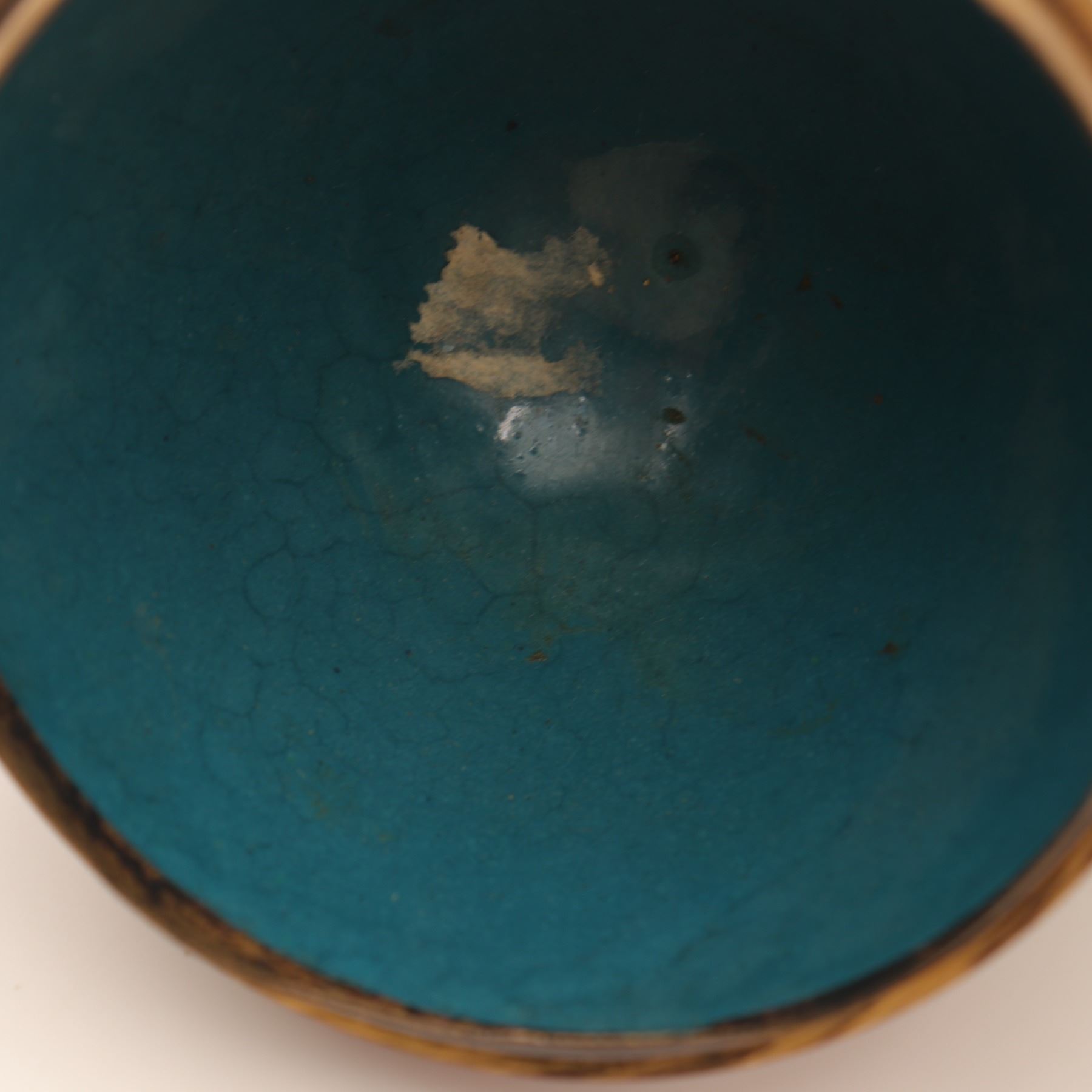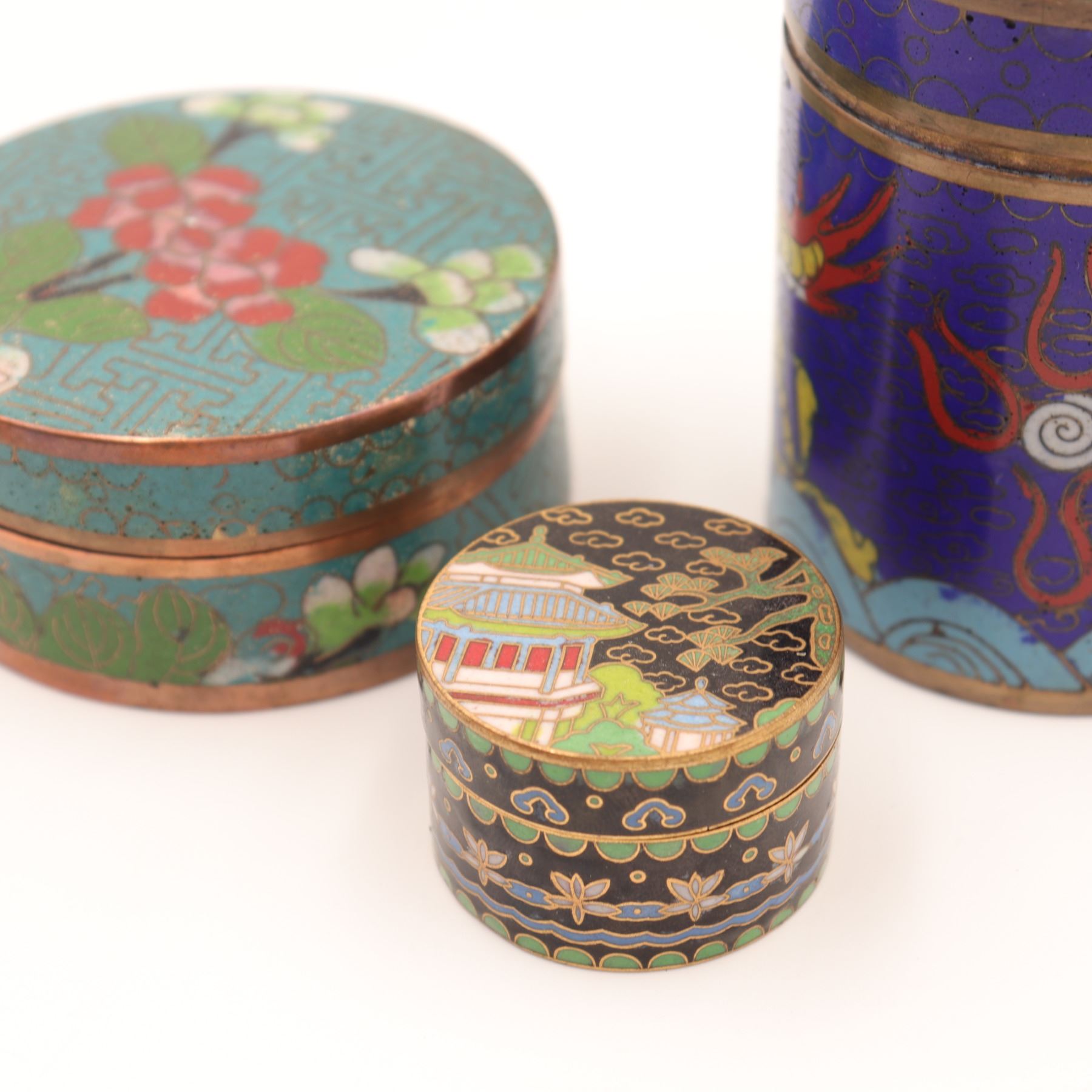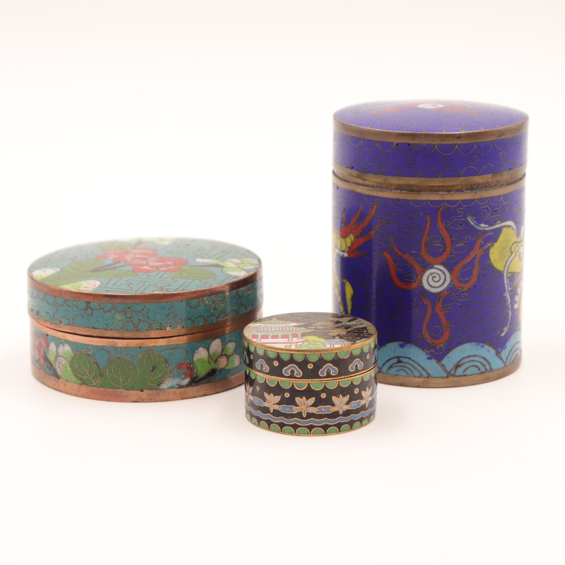 Decorative group of seven Chinese cloisonné enamel wares, early to mid-20th century, including a tall egg-form covered cup on pedestal stand, three circular covered boxes, two bowls, and a small covered salt or condiment with matching spoon. The tall egg-form example is decorated with lotus blossoms and scrolling foliage on an iron-red ground with key-fret pattern, with brass finial and mounts. The covered boxes include one cylindrical example with dragons and flaming pearls on a deep blue ground, together with two lower circular boxes with floral decoration on turquoise and black grounds. The bowls comprise a larger red-ground example with scrolling floral decoration and a smaller black-ground bowl with peony and foliate design. The covered salt is decorated with dragons on a black ground and raised on tripod feet. Turquoise and blue enamel interiors and bases throughout. A colourful and attractive assembled group of Chinese export cloisonné, well suited for display.