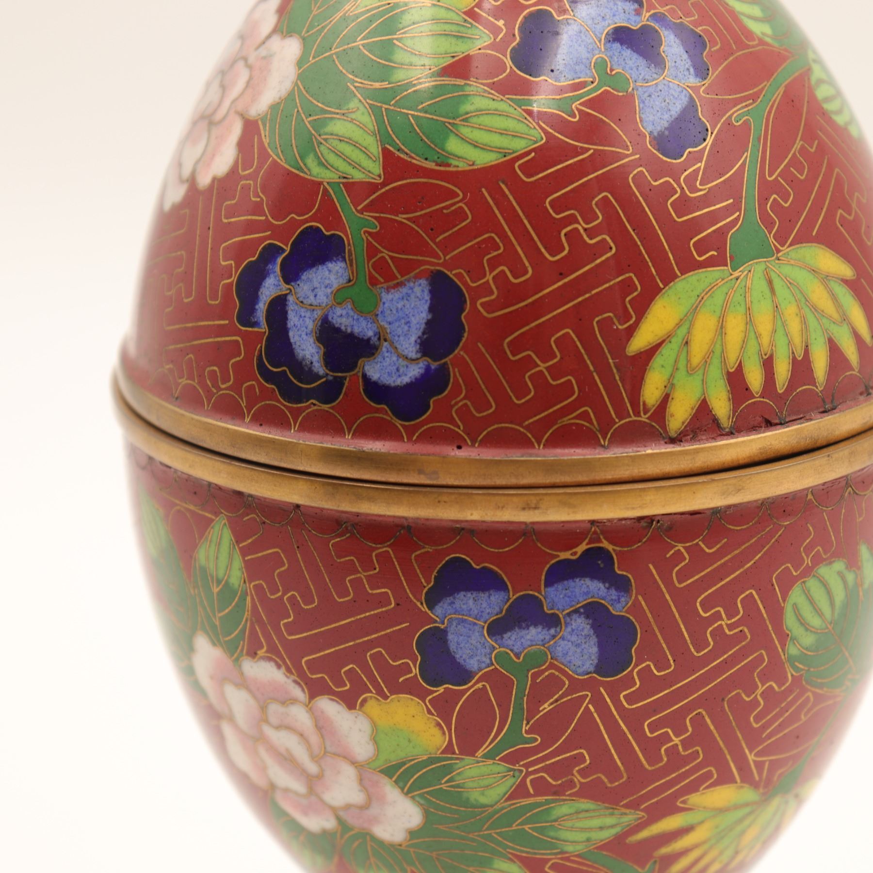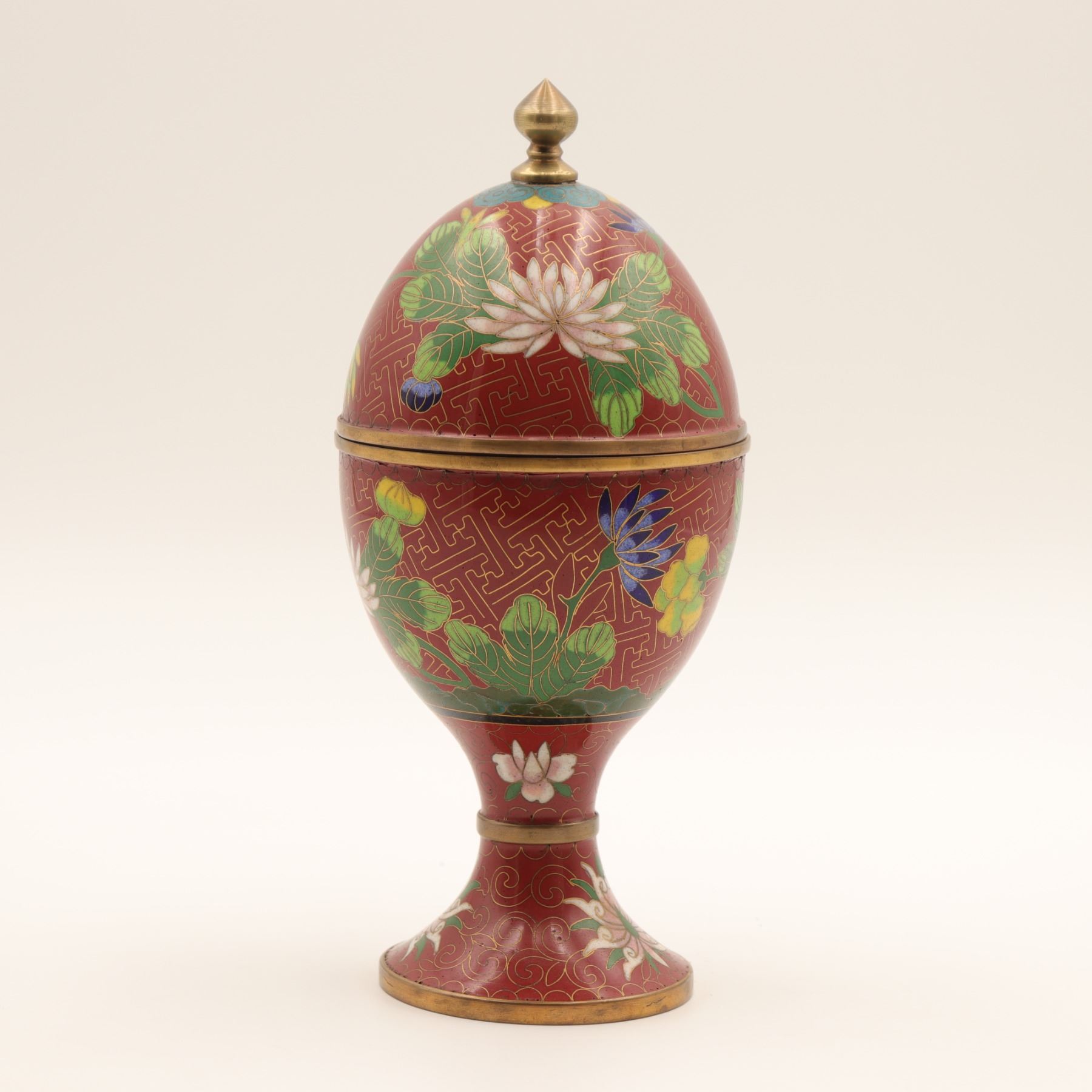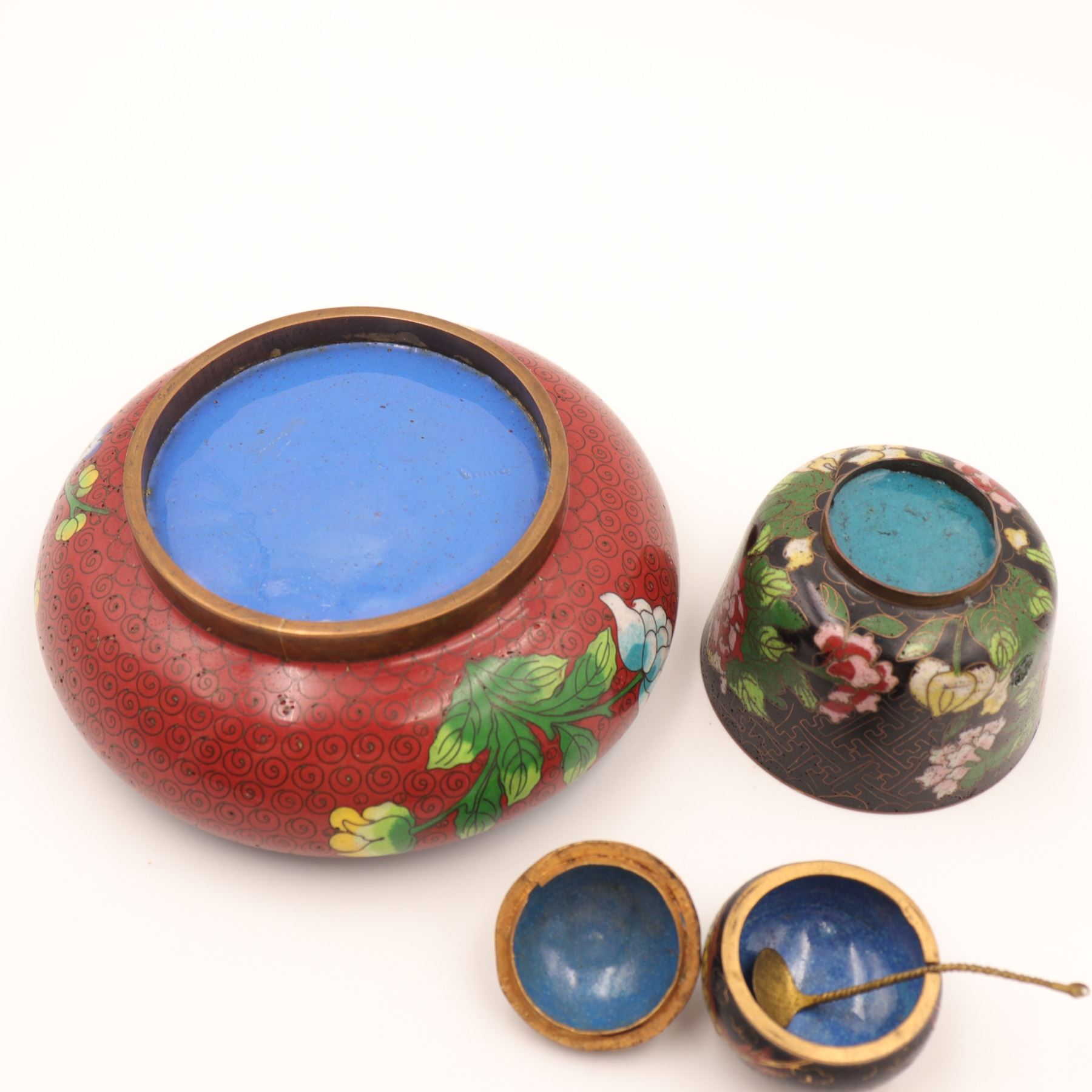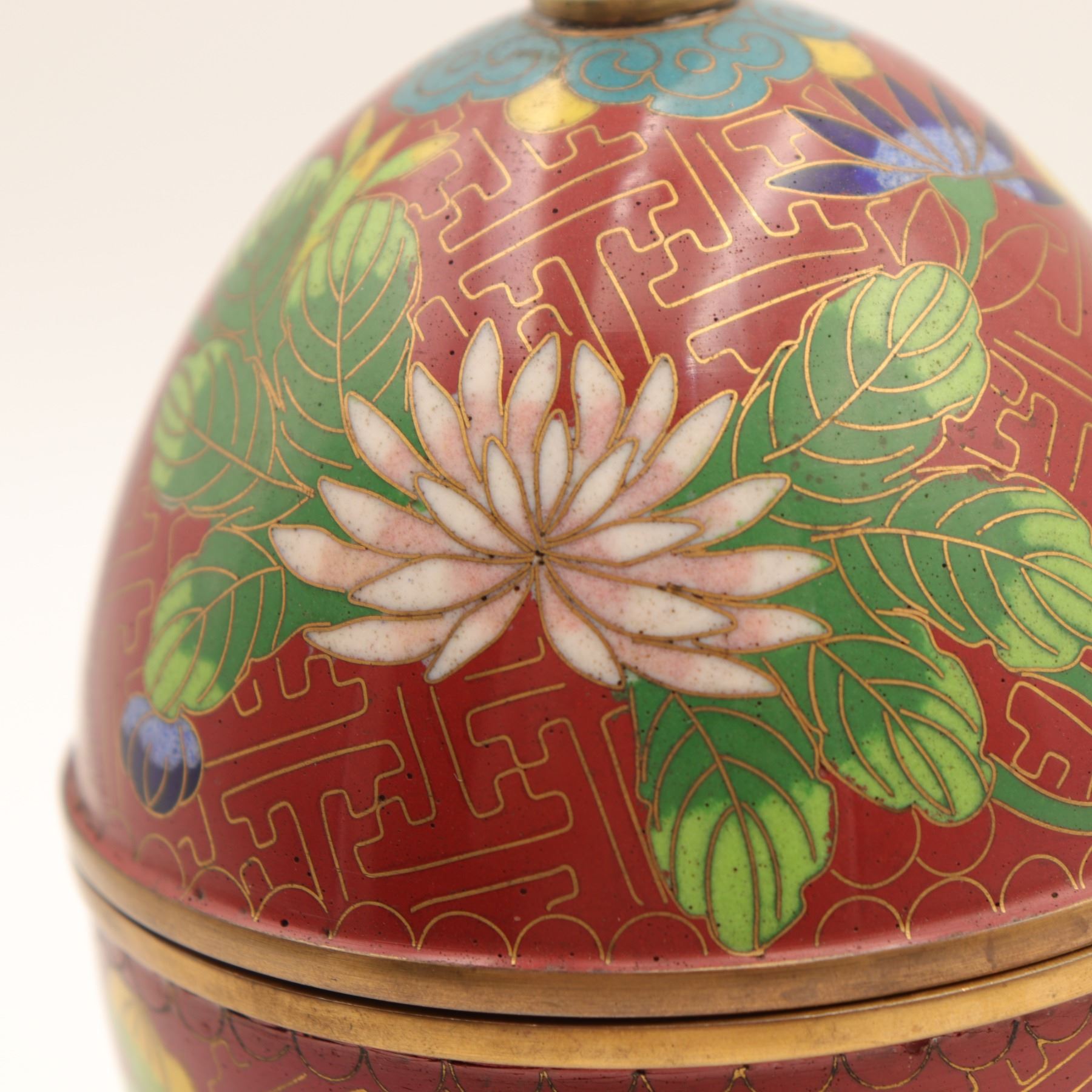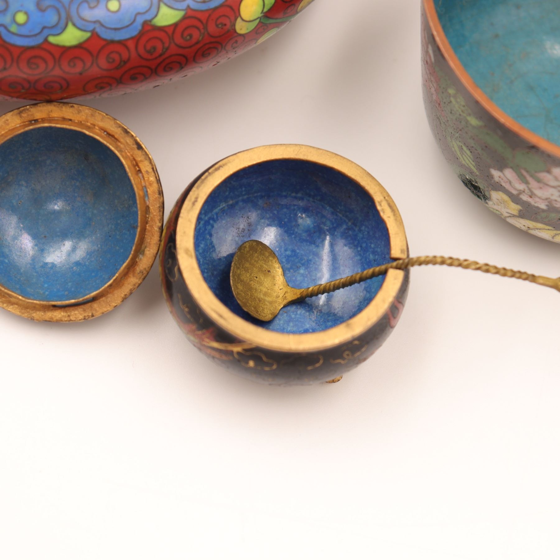 Lot 64 Chinese Cloisonné Group of 7, Egg on Stand, Covered Boxes, Bowls & Covered Salt