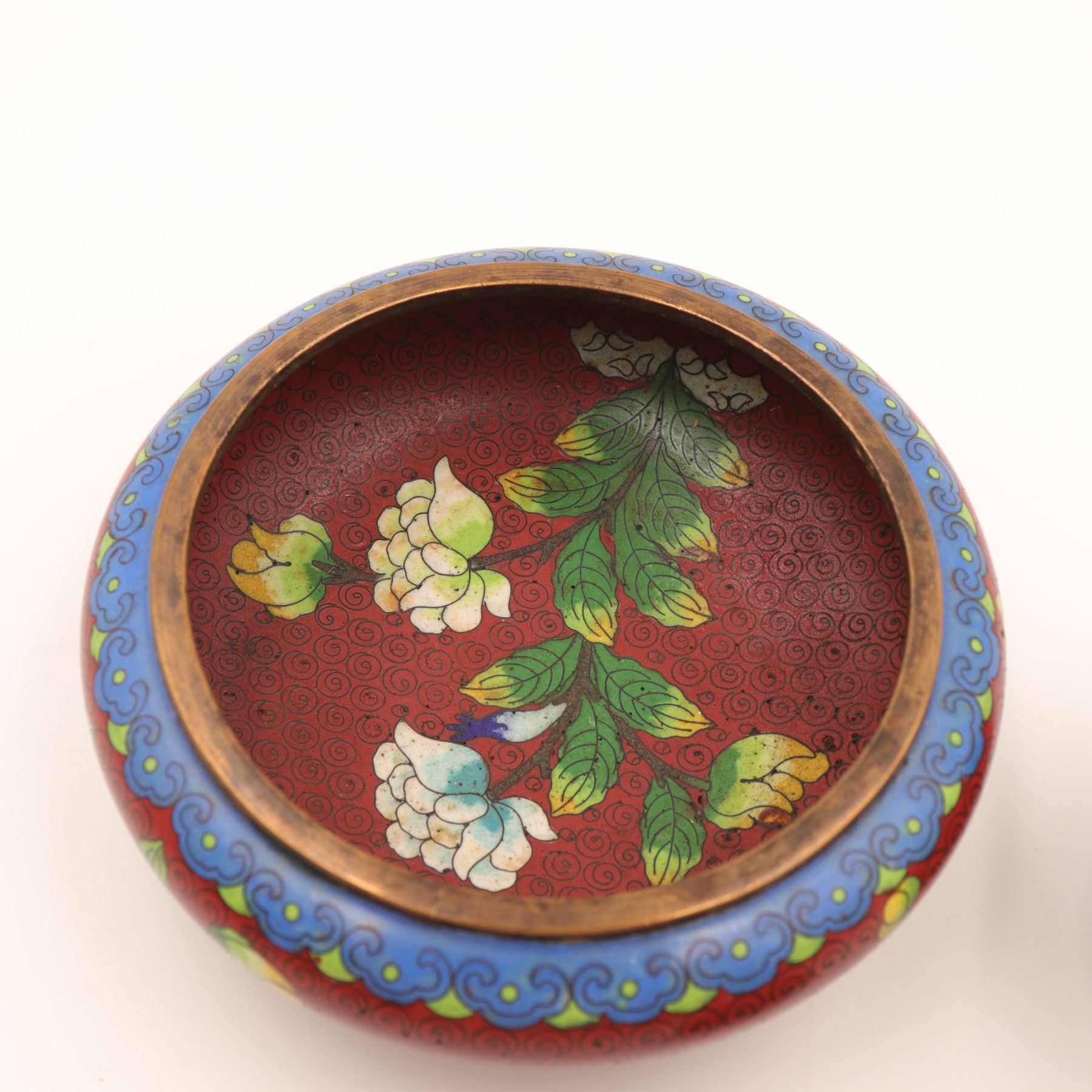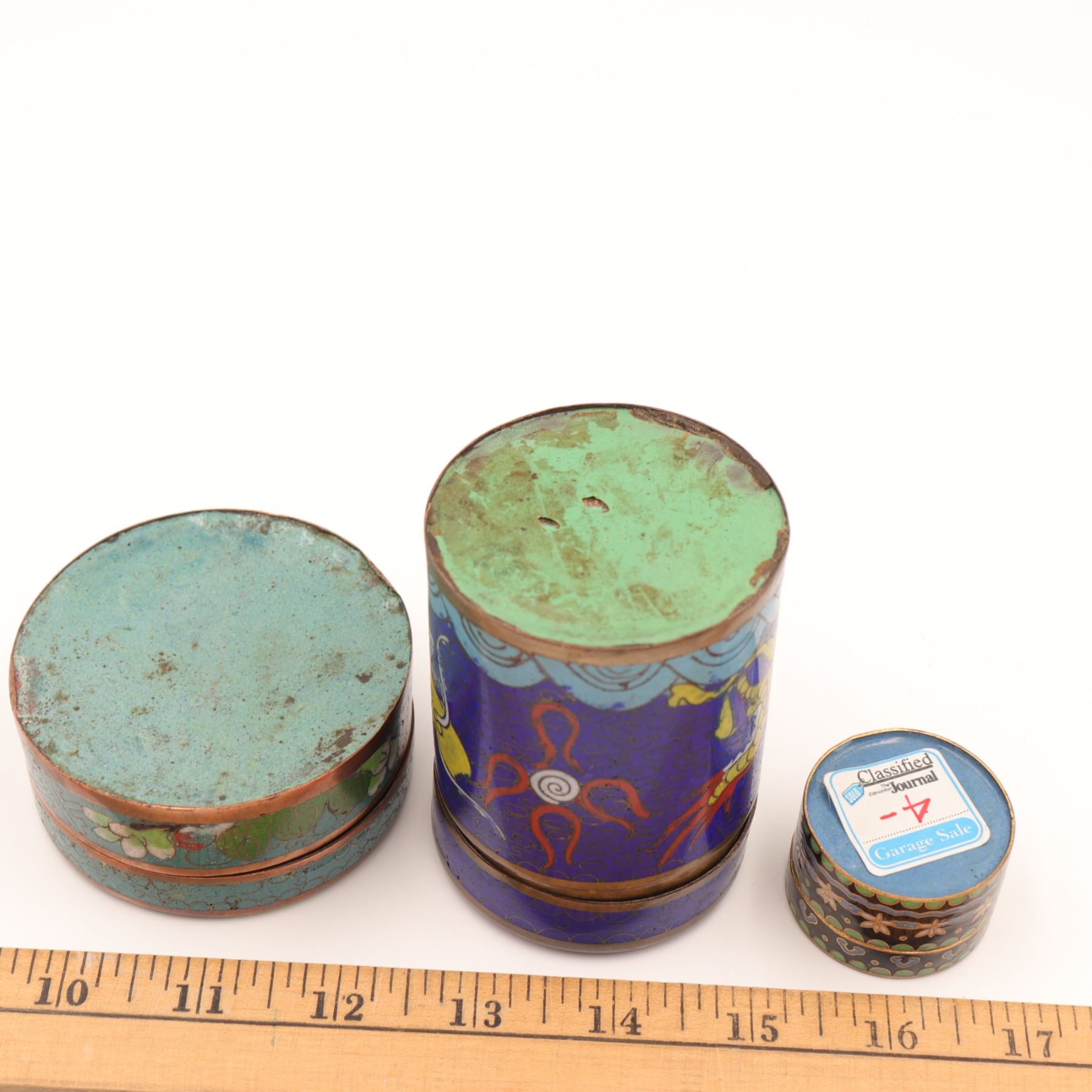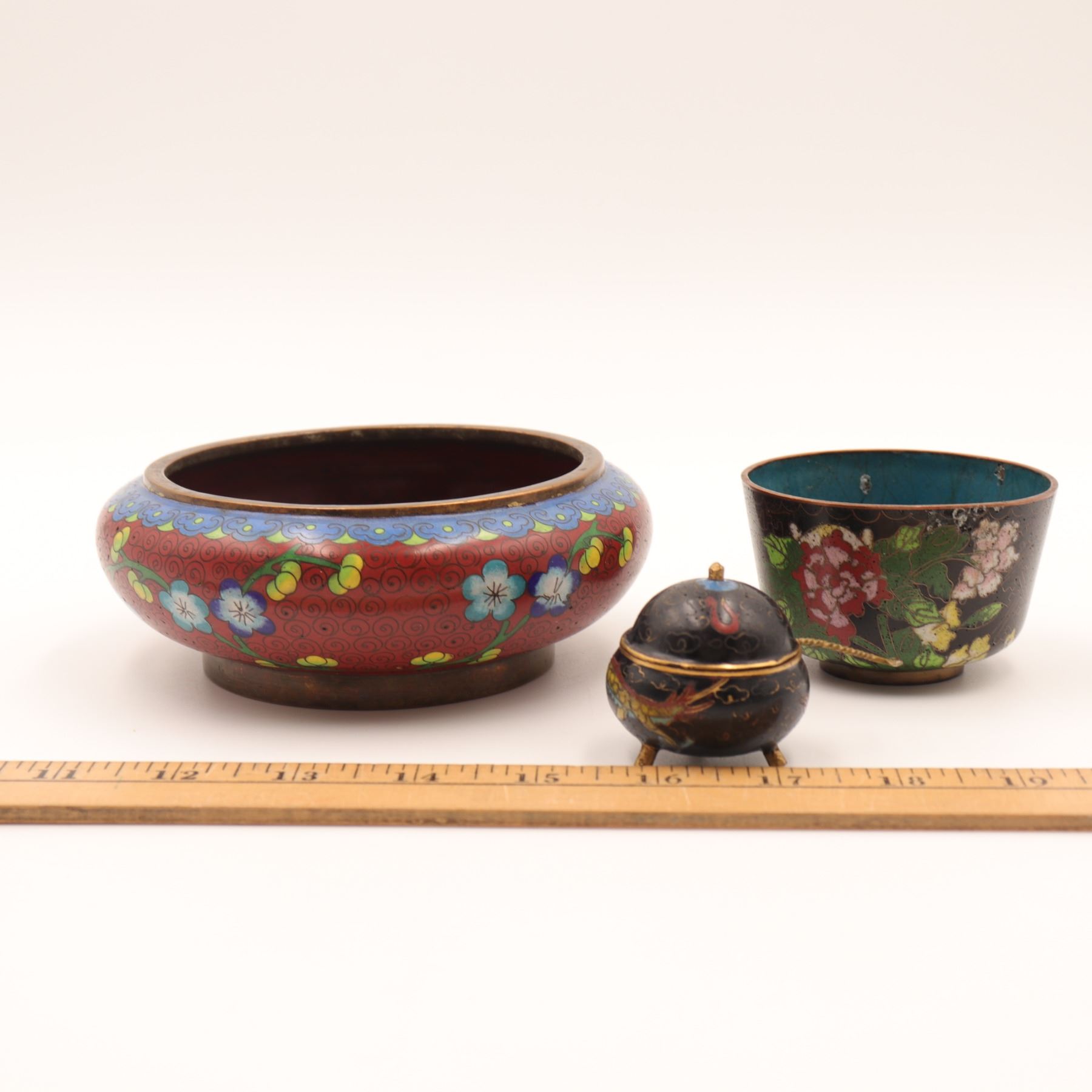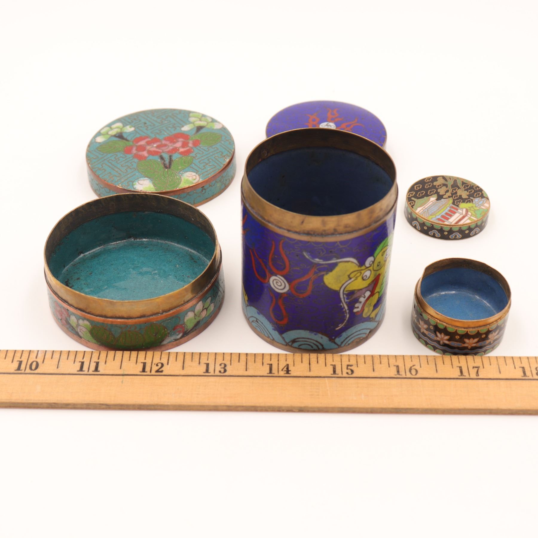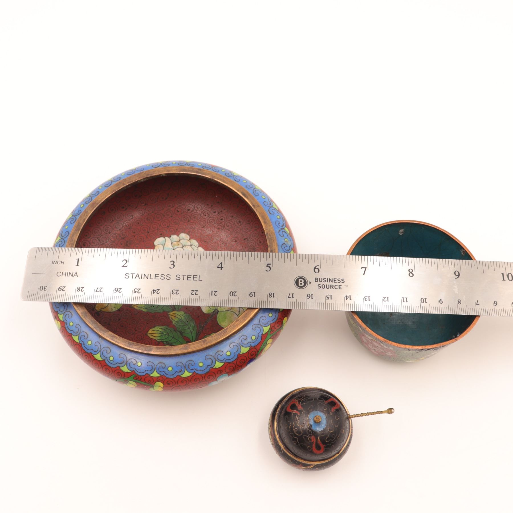 Lot 64 Chinese Cloisonné Group of 7, Egg on Stand, Covered Boxes, Bowls & Covered Salt
