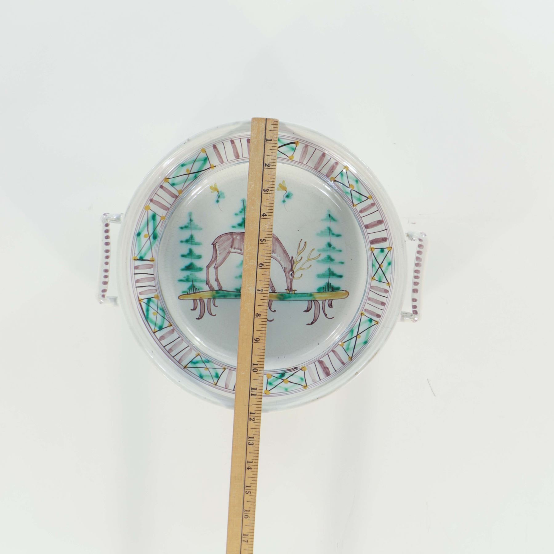 Group of three substantial Austrian or Central European glazed earthenware serving platters and dishes, each with opposed side handles and distinctive hand-painted decoration in a rustic country-house manner associated with the Gmunden tradition. The lot comprises a larger handled platter painted with a stag in a stylized landscape within a geometric border, a second platter with delicate floral sprays in a soft pastel palette, and a smaller handled serving dish centered with a bold blue and yellow flowerhead and green-banded rim. Though not a matching service, the three pieces work together as a highly decorative assembled group, unified by their strong hand-painted character, generous scale, and regional folk-ceramic appeal. A visually striking lot with excellent display presence. Condition consistent with age and use, including glaze crazing, underside wear, and minor edge fritting visible.
