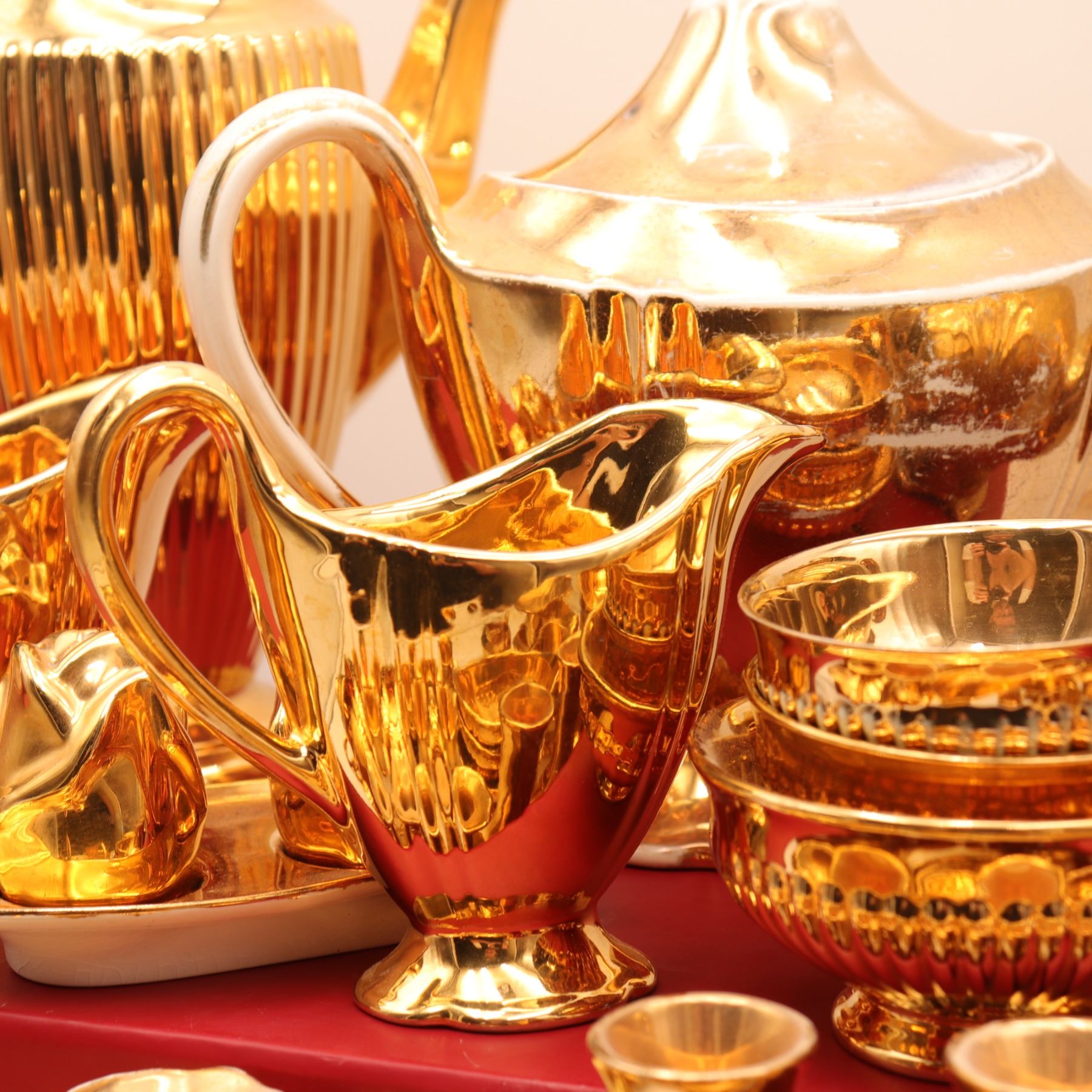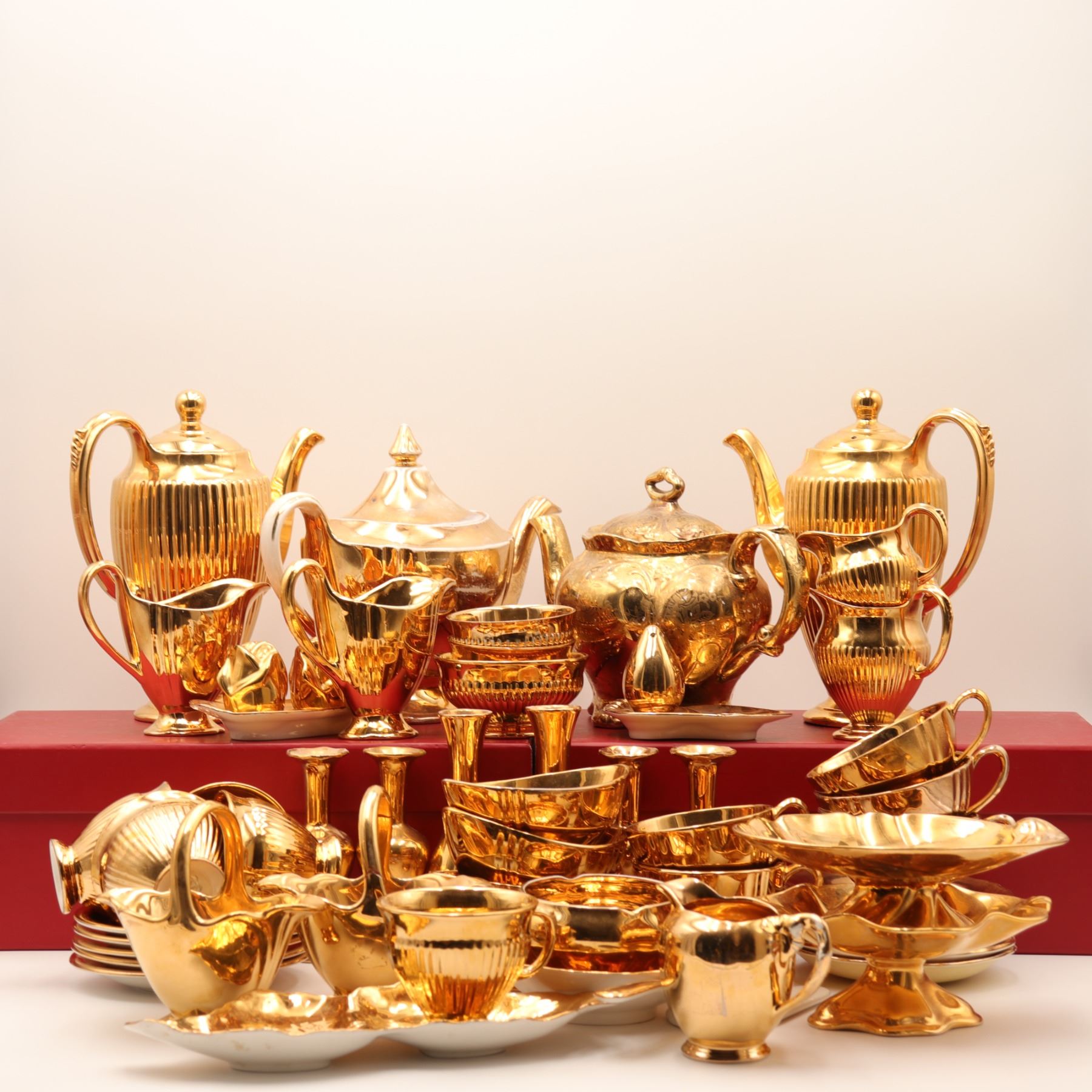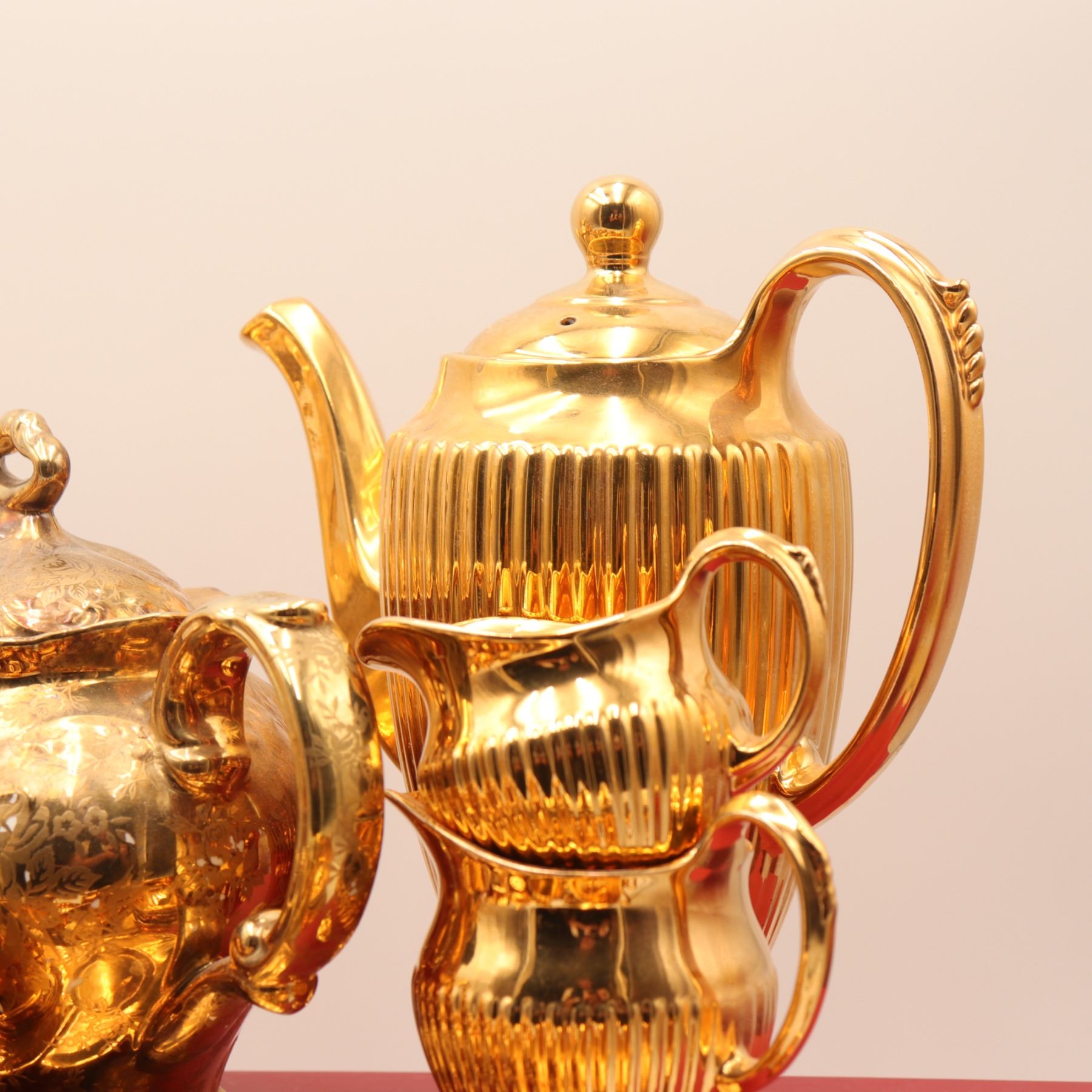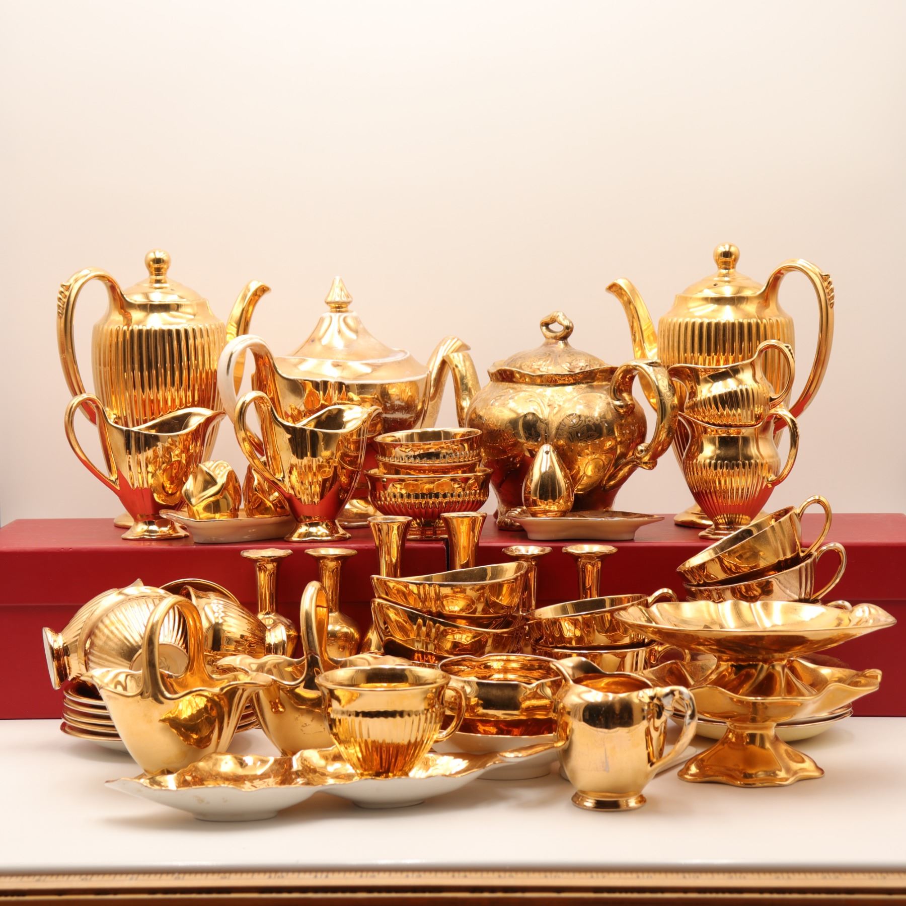 An extensive Royal Winton Grimwades 'Golden Age' gold lustre service, comprising a wide selection of mid-century tea and dessert wares, including multiple coffee and tea pots, creamers, sugars, teacups with matching saucers, molded dessert plates, pedestal dishes, and a tiered-cake stand with hardware. Each piece finished in the pattern's signature mirror-bright all-over gilt lustre over molded ceramic forms. A striking and desirable Royal Winton service ideal for display or special use. Overall light wear to gilding consistent with age and use.