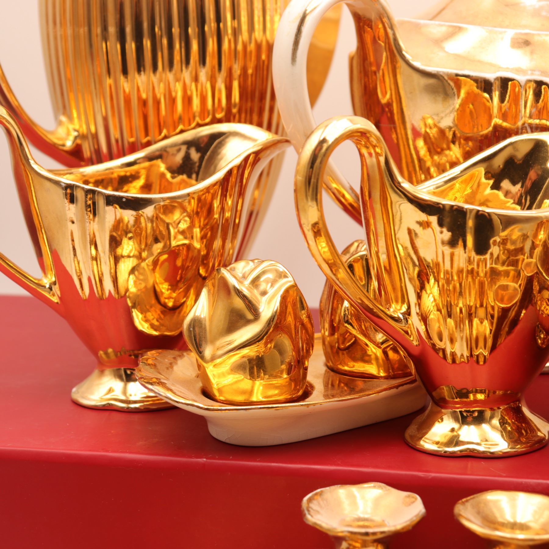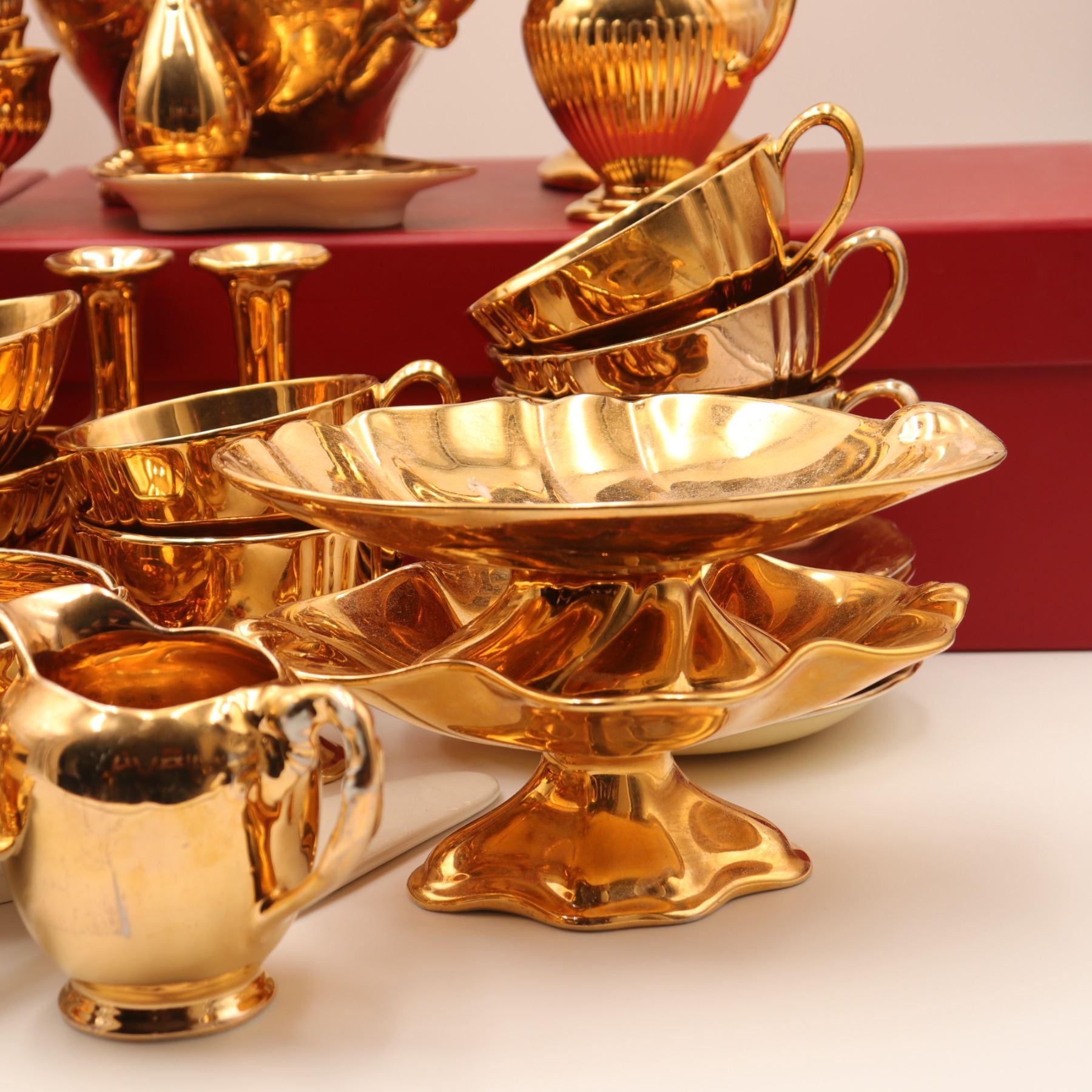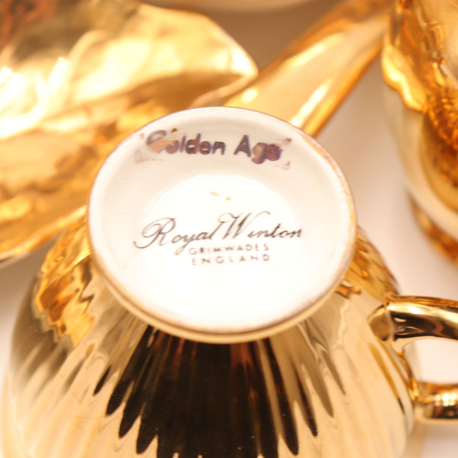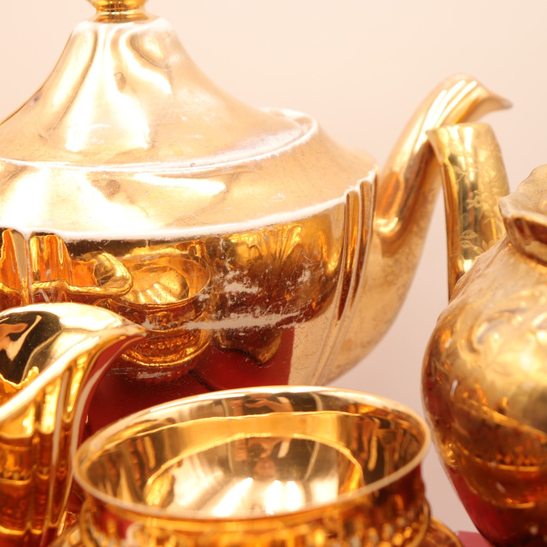 An extensive Royal Winton Grimwades 'Golden Age' gold lustre service, comprising a wide selection of mid-century tea and dessert wares, including multiple coffee and tea pots, creamers, sugars, teacups with matching saucers, molded dessert plates, pedestal dishes, and a tiered-cake stand with hardware. Each piece finished in the pattern's signature mirror-bright all-over gilt lustre over molded ceramic forms. A striking and desirable Royal Winton service ideal for display or special use. Overall light wear to gilding consistent with age and use.