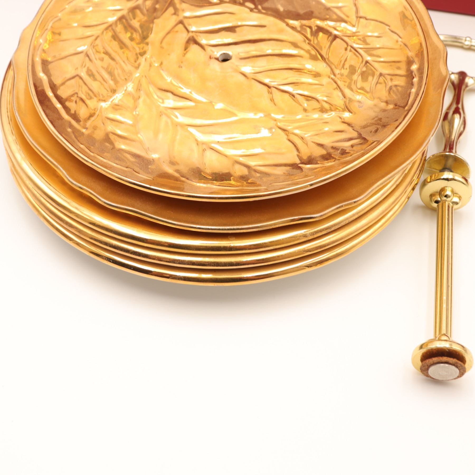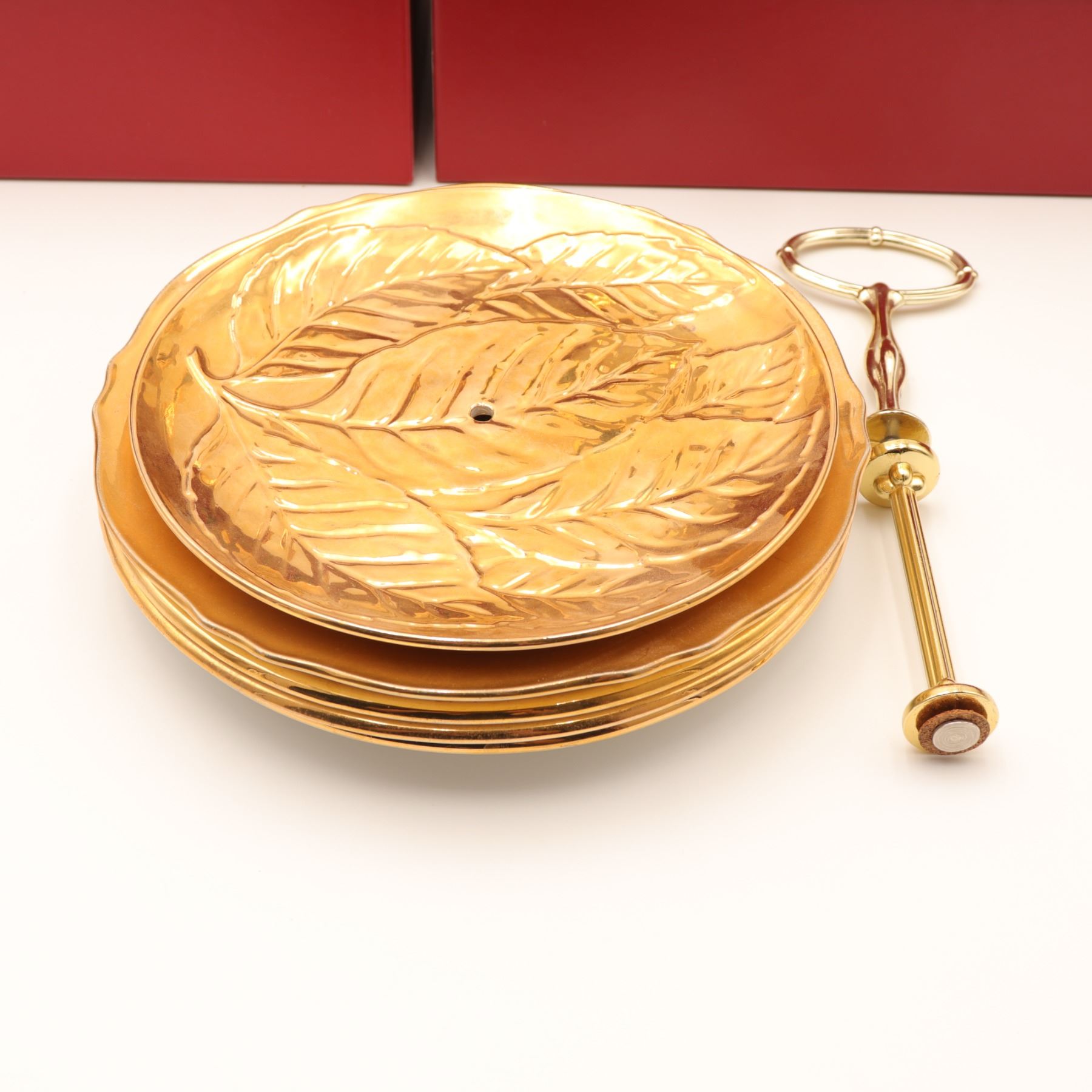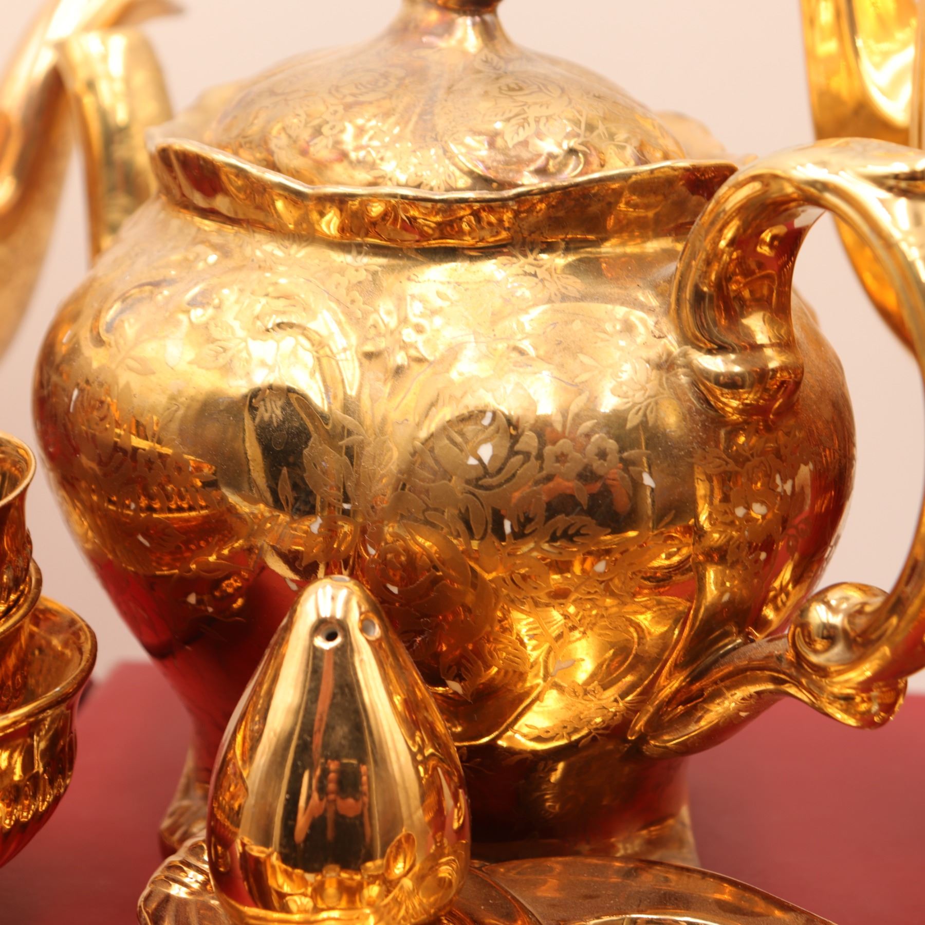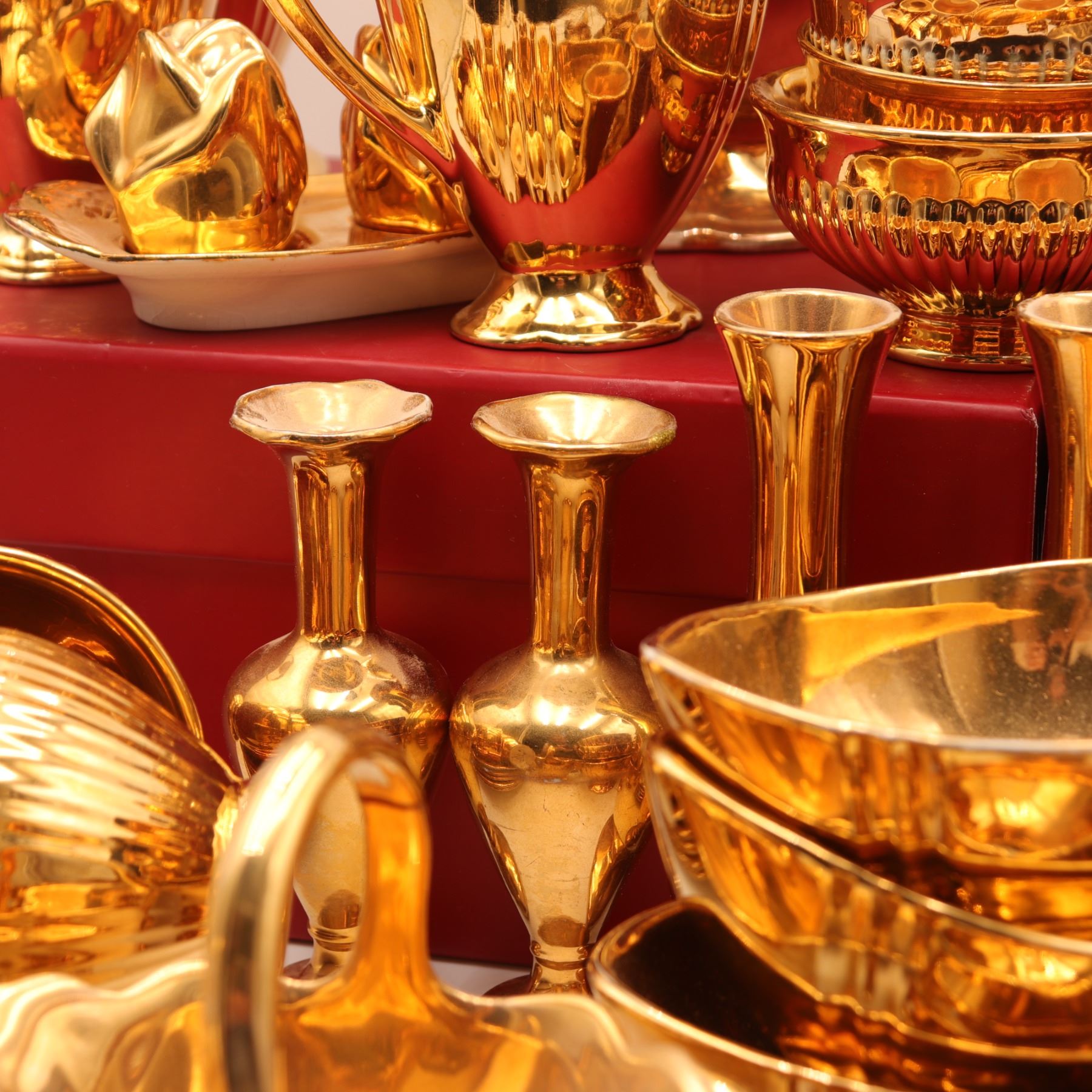 An extensive Royal Winton Grimwades 'Golden Age' gold lustre service, comprising a wide selection of mid-century tea and dessert wares, including multiple coffee and tea pots, creamers, sugars, teacups with matching saucers, molded dessert plates, pedestal dishes, and a tiered-cake stand with hardware. Each piece finished in the pattern's signature mirror-bright all-over gilt lustre over molded ceramic forms. A striking and desirable Royal Winton service ideal for display or special use. Overall light wear to gilding consistent with age and use.