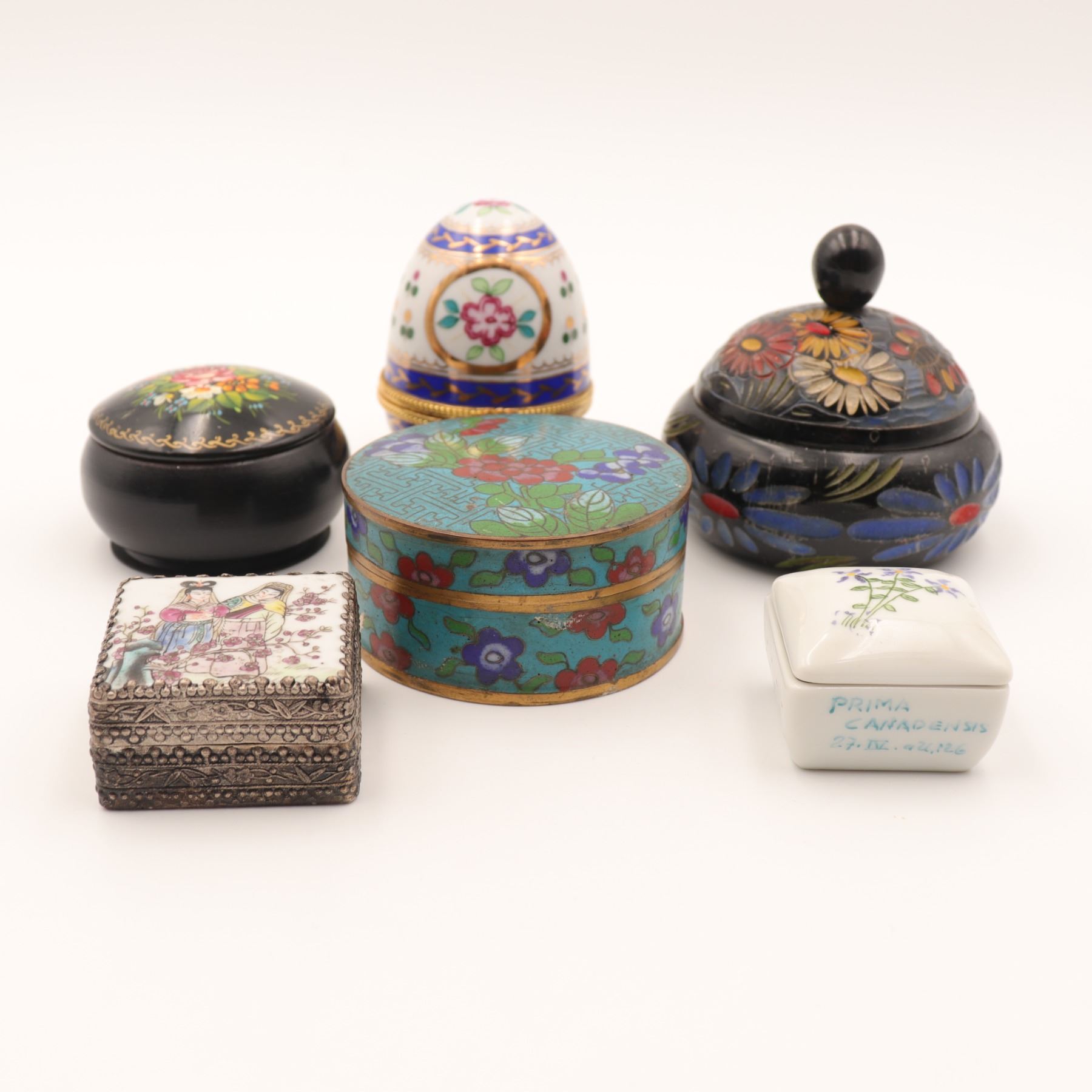 An assembled group of six small decorative trinket boxes in varied materials and styles, including two black floral-painted circular boxes, a mounted porcelain egg-form box, a turquoise-ground cloisonné enamel round box, a rectangular filigree-mounted figural box, and a small white porcelain floral pillbox inscribed “PRIMA CANADENSIS 27. IV. 92.126.” The lot combines painted, enameled, metal-mounted, and porcelain examples with good shelf and cabinet appeal. The cloisonné and filigree-mounted pieces add contrasting texture and color to the group, while the remaining boxes offer a range of decorative floral and figural motifs. General surface wear, rubbing, and minor scratches throughout; visible enamel wear and small losses to the cloisonné box; no major breaks noticed.