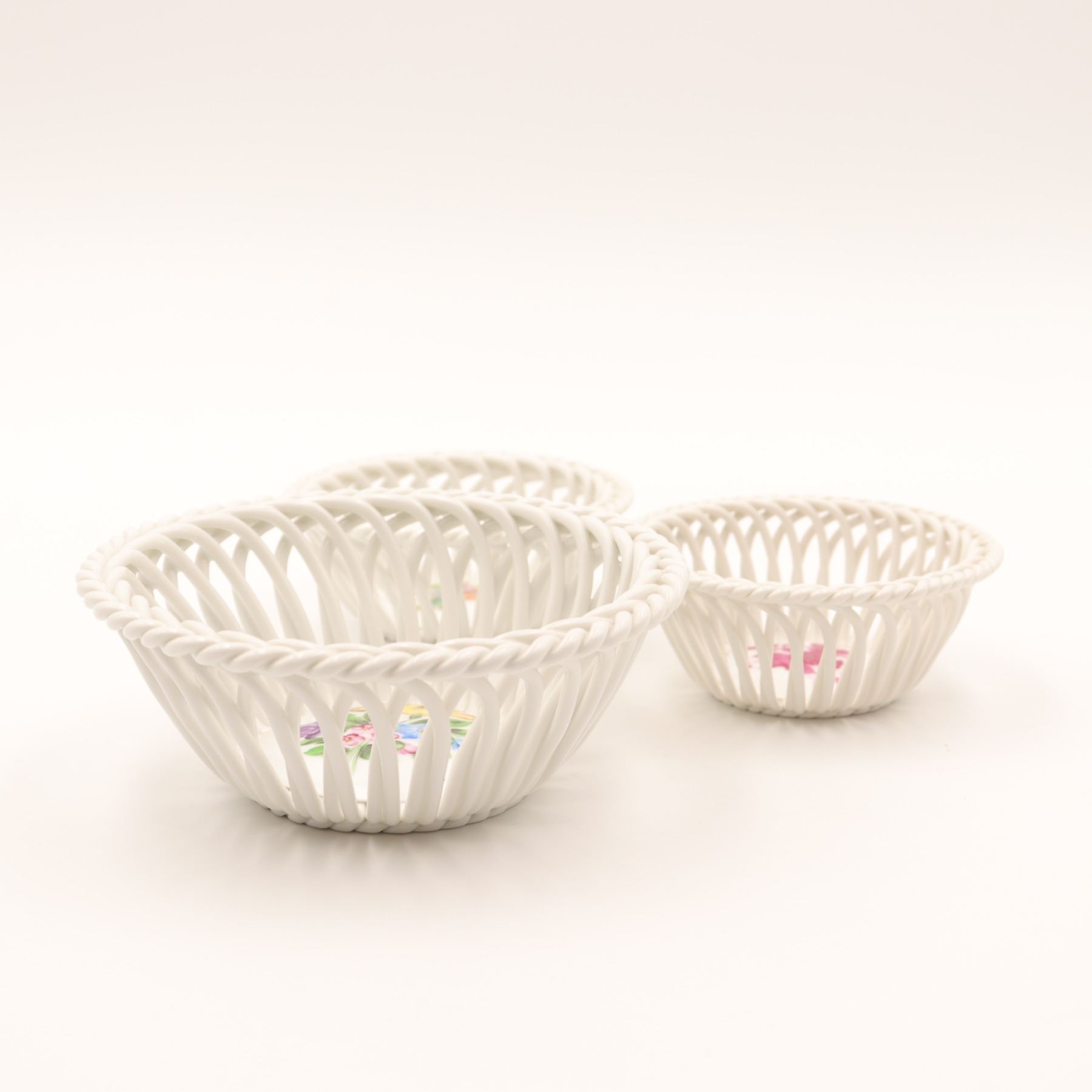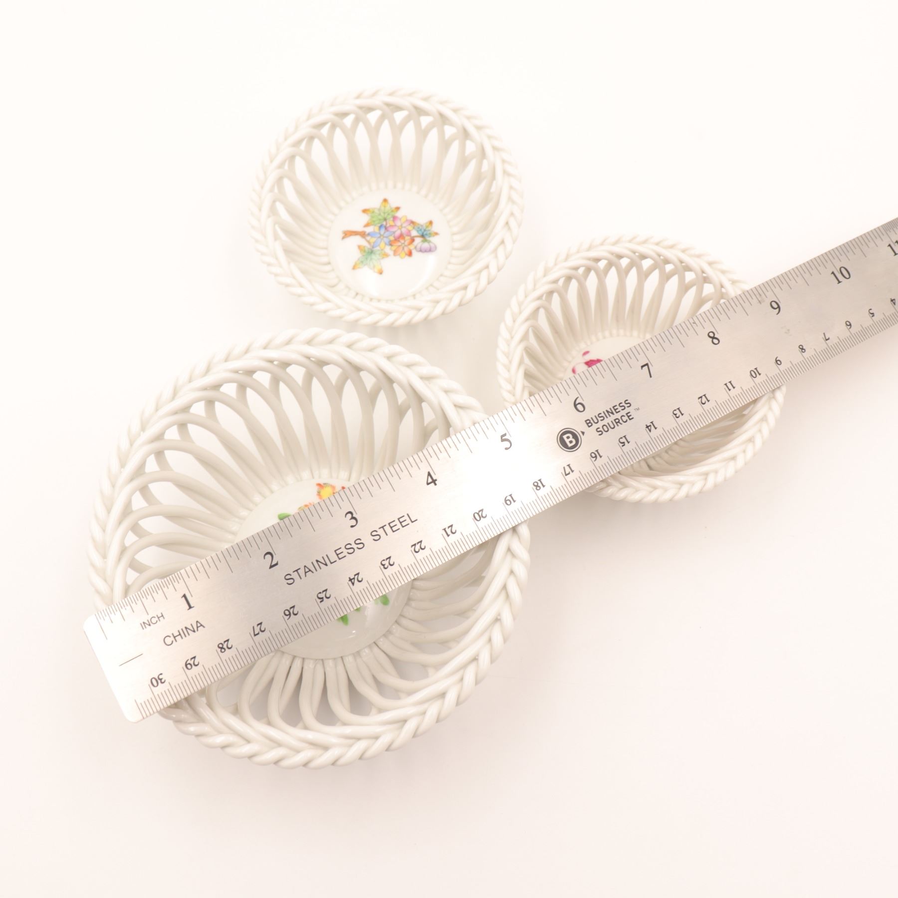 Group of three Herend porcelain pierced baskets in graduated sizes, each with molded openwork sides, braided rims, and hand-painted floral reserves to the centers. Blue Herend handpainted marks to the undersides. 20th century Hungarian porcelain, sold as a display set. Light shelf wear noted.