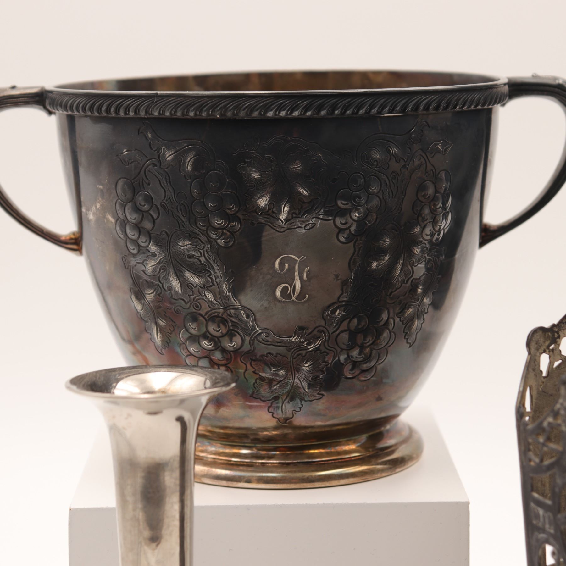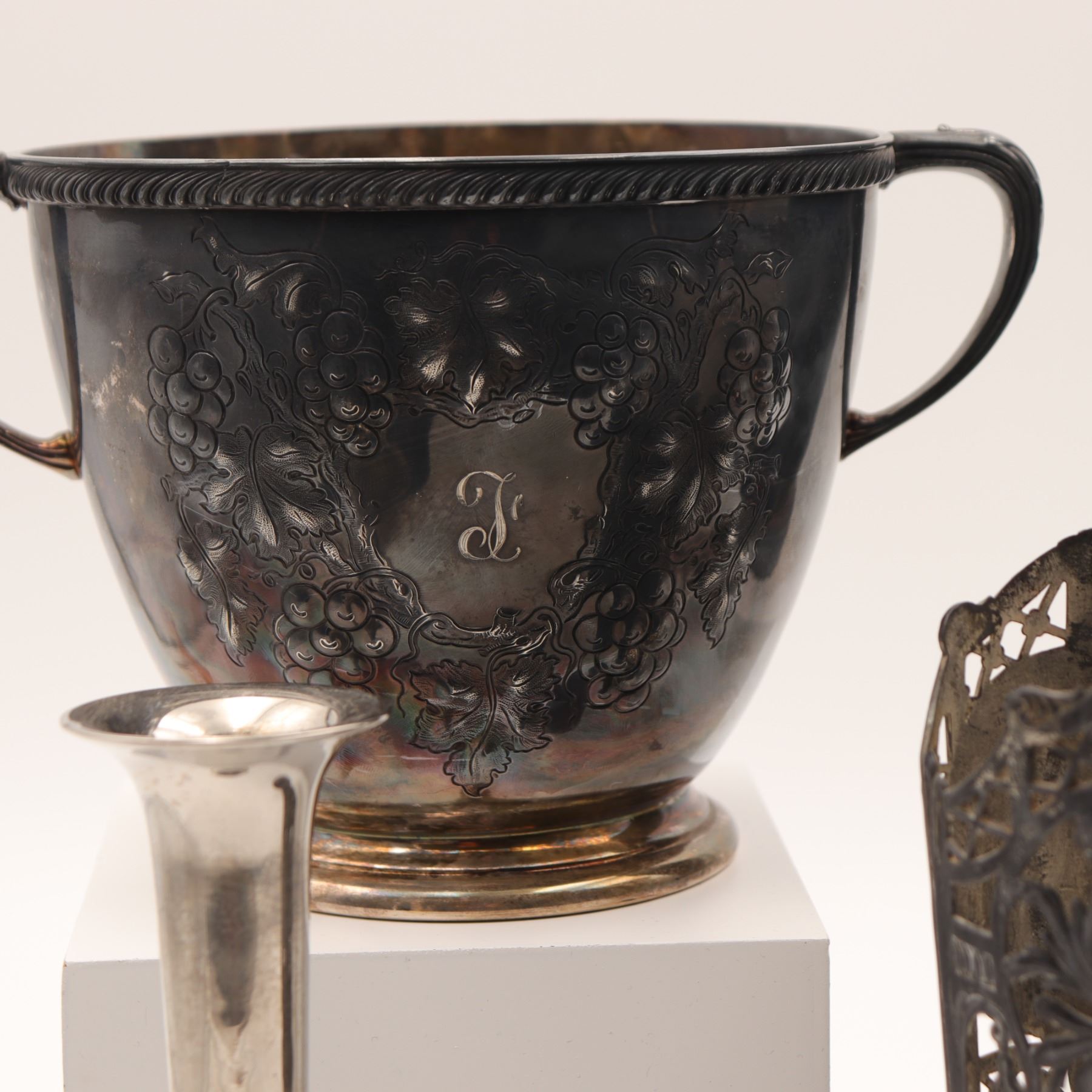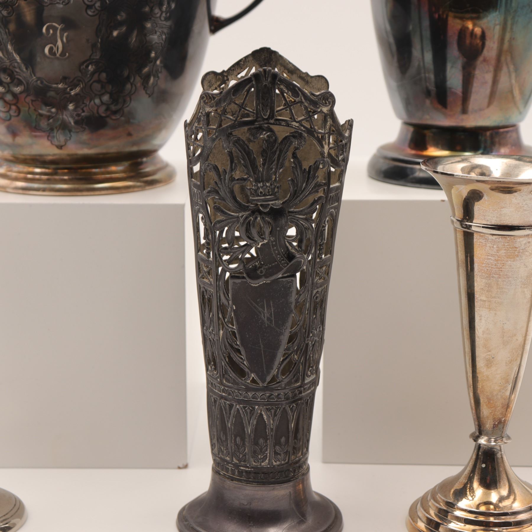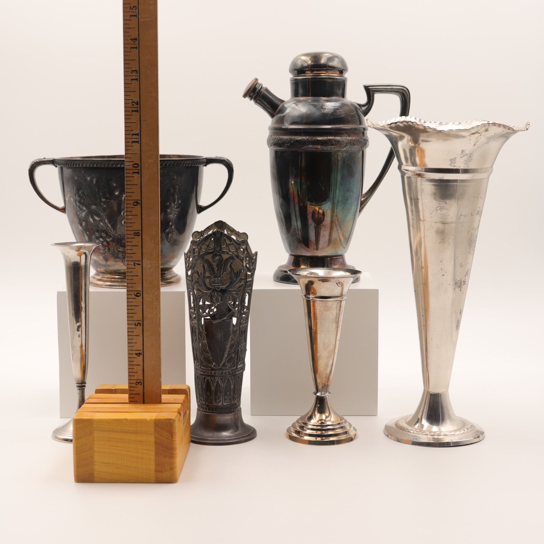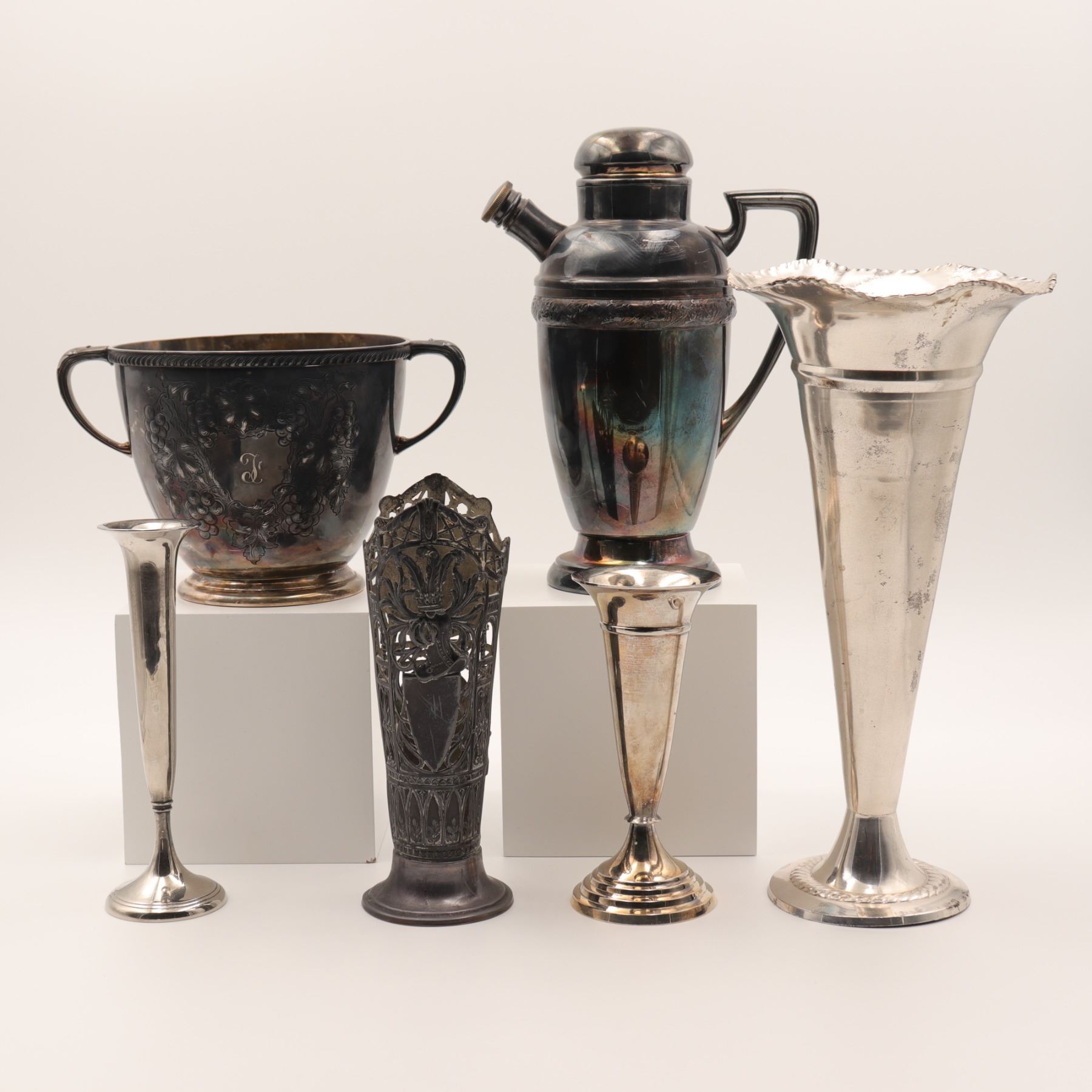 Assembled lot of silver-plated wares, including an engraved wine cooler or bowl with monogram, a cocktail shaker, two trumpet vases, an Art Nouveau style pierced spill vase with stylized fleur-de-lis motif, and a small bud vase. Mixed forms and dates, largely 20th century, offered as a decorative group. Tarnish, rubbing, and surface wear throughout.