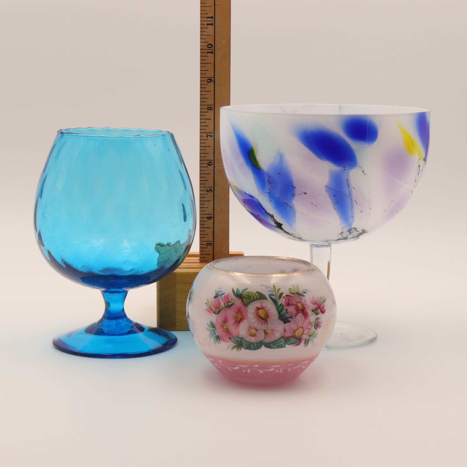 An assembled three-piece decorative glass lot comprising a transparent blue footed vase or goblet-form vessel, a modern frosted stemmed art glass bowl or compote with abstract blue, yellow, green, and violet color accents, and a small hand-painted floral rose bowl with pink ground and gilt rim. The group combines mid- to late 20th-century decorative glass in three distinct but complementary styles, offering strong shelf and tabletop appeal through color, contrast, and varied form. A useful interiors lot centered on the larger modern art glass bowl, with the blue vase and floral rose bowl adding secondary decorative interest. Light general surface wear consistent with handling; no chips or cracks observed.