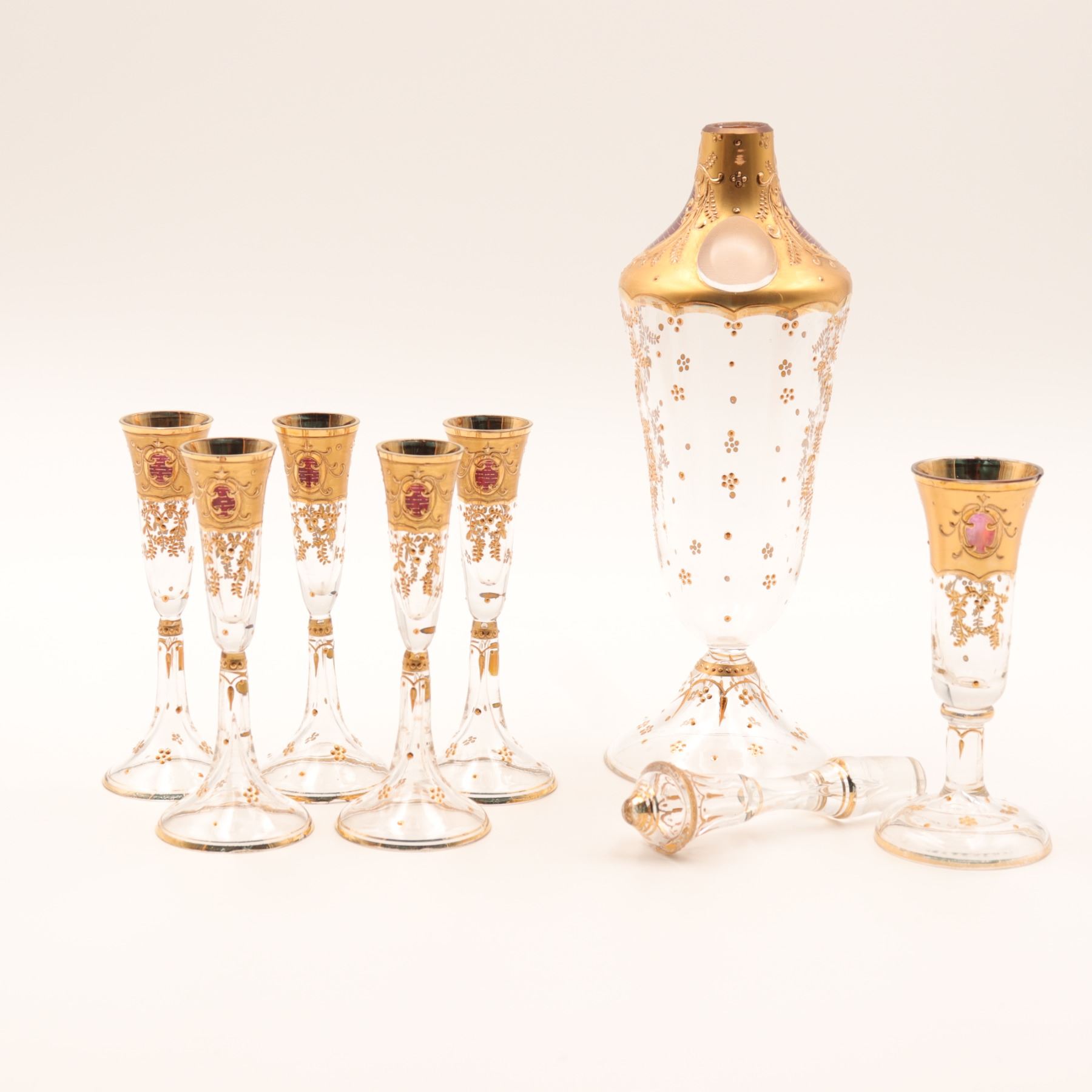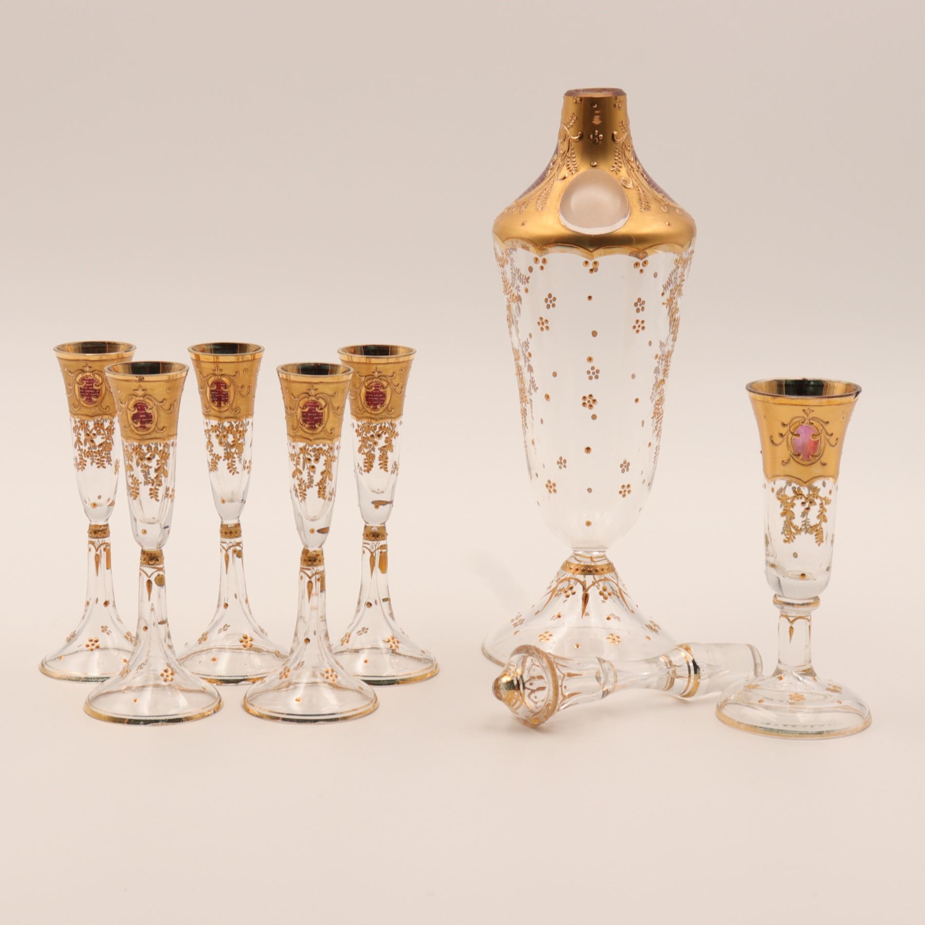 Decorative glass cordial service comprising a gilt-decorated decanter with associated stopper and six gilt and enamelled stemmed cordial glasses. The glasses have cranberry-tone oval cartouches and pendant gilt ornament; the decanter is similarly embellished with all-over gilded highlights. Likely late 19th to early 20th century Continental or Bohemian taste. Stopper does not fit the decanter, and one cordial has a minor chip.
