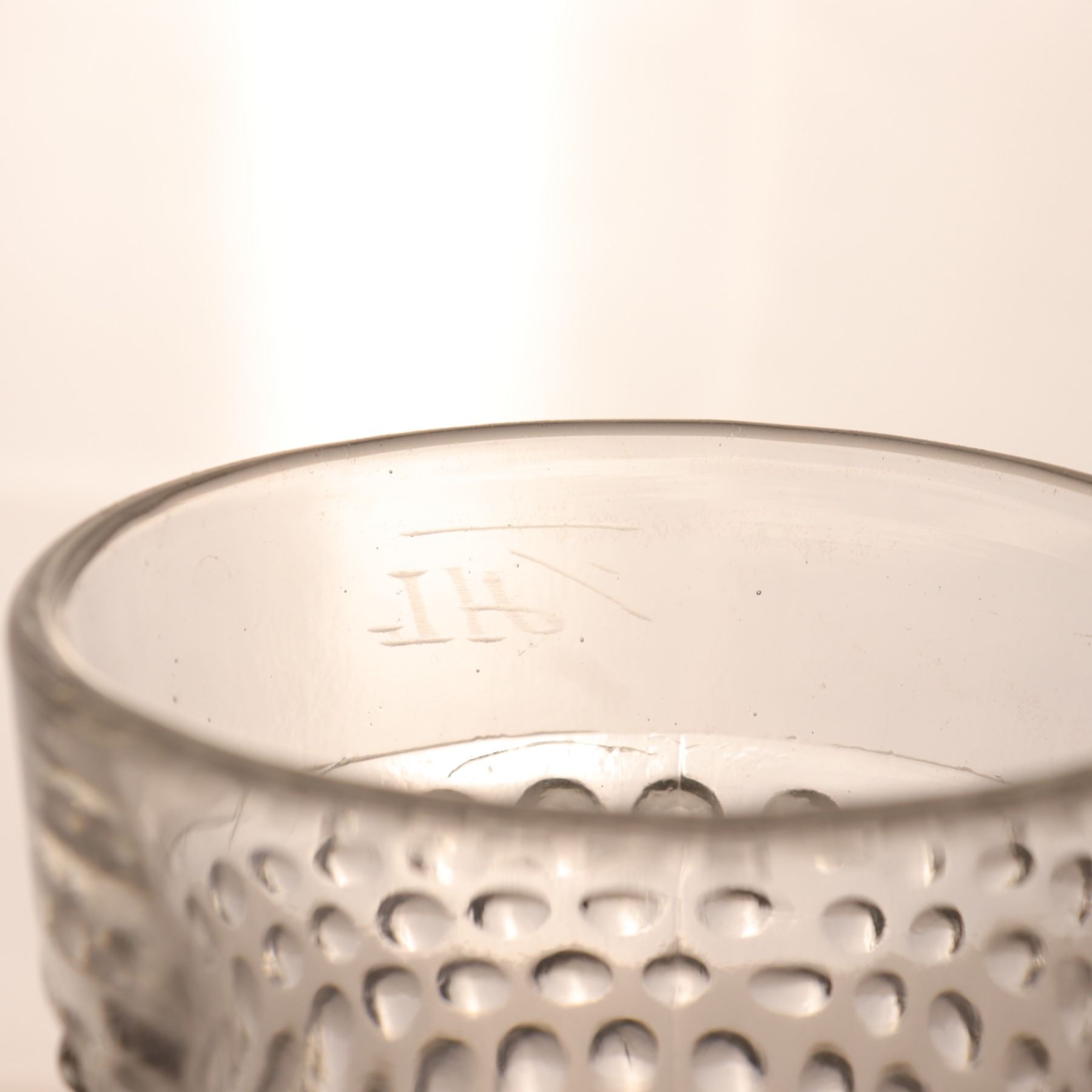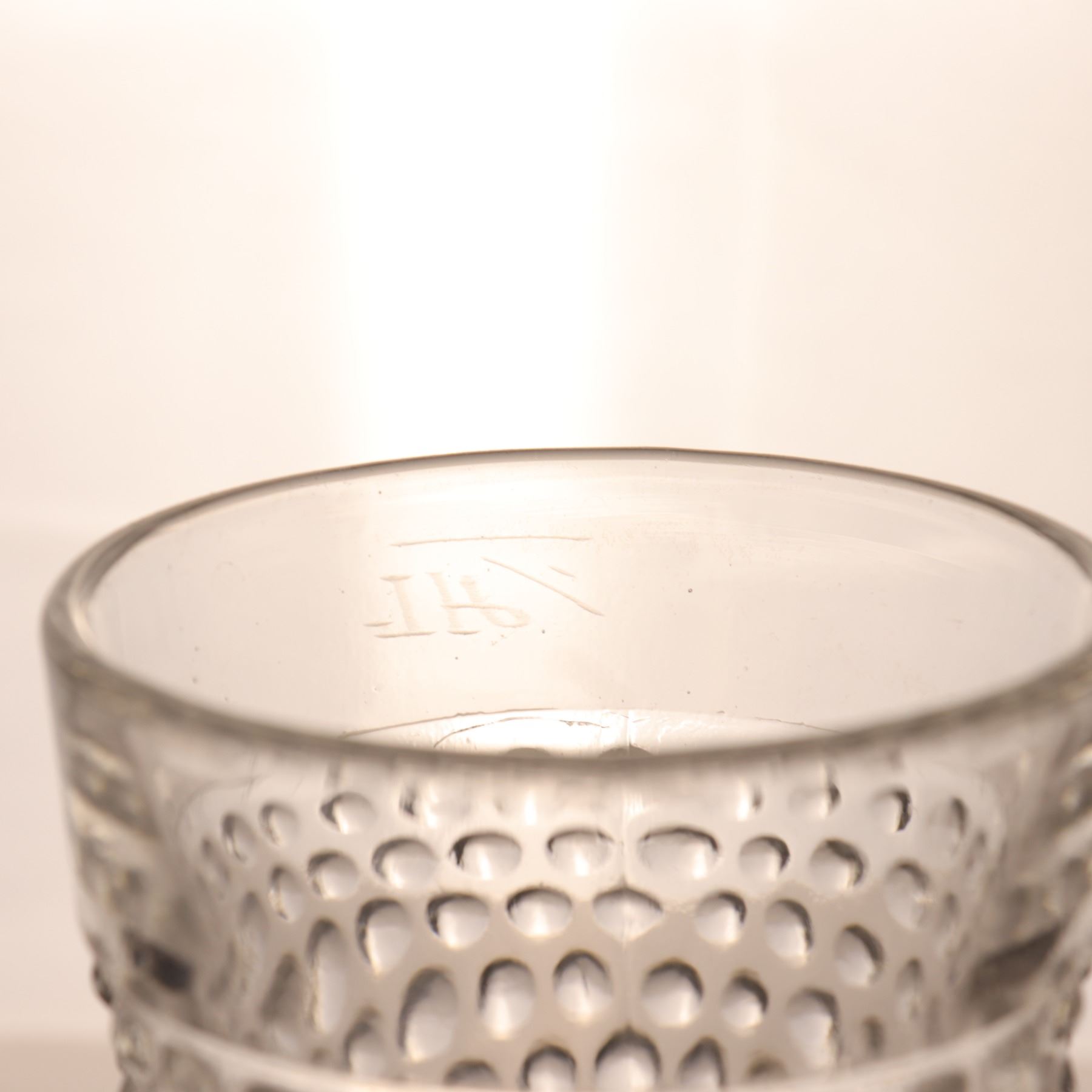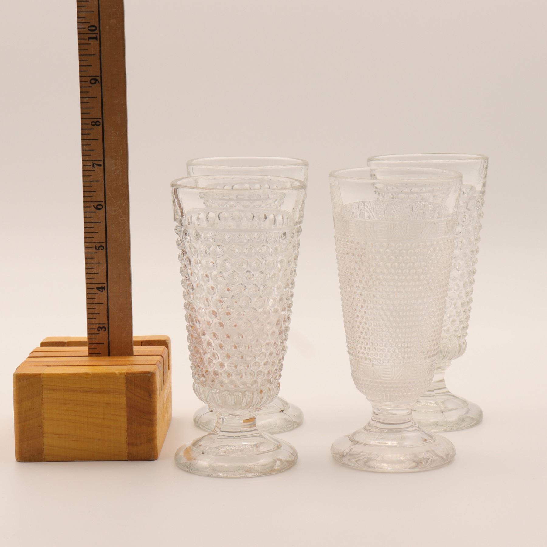 Group of four molded clear glass footed drinking mugs or beer glasses, three in a hobnail-style pattern and one with a differing geometric texture. Each bears a capacity mark reading "1.5 L." Though reminiscent of Fenton hobnail forms, the evidence does not support a firm attribution, and the lot is best catalogued as molded beverage glass. Light wear consistent with use.