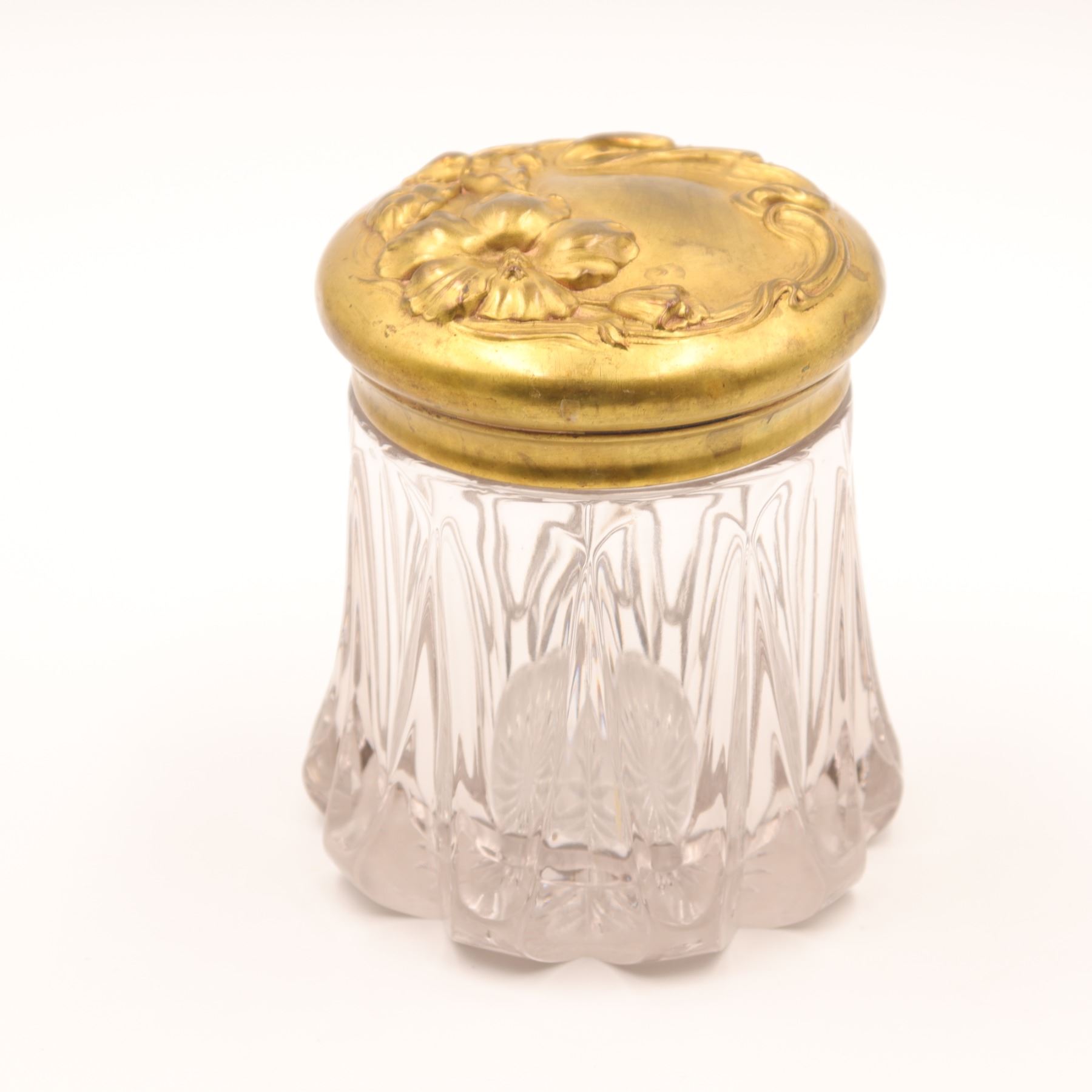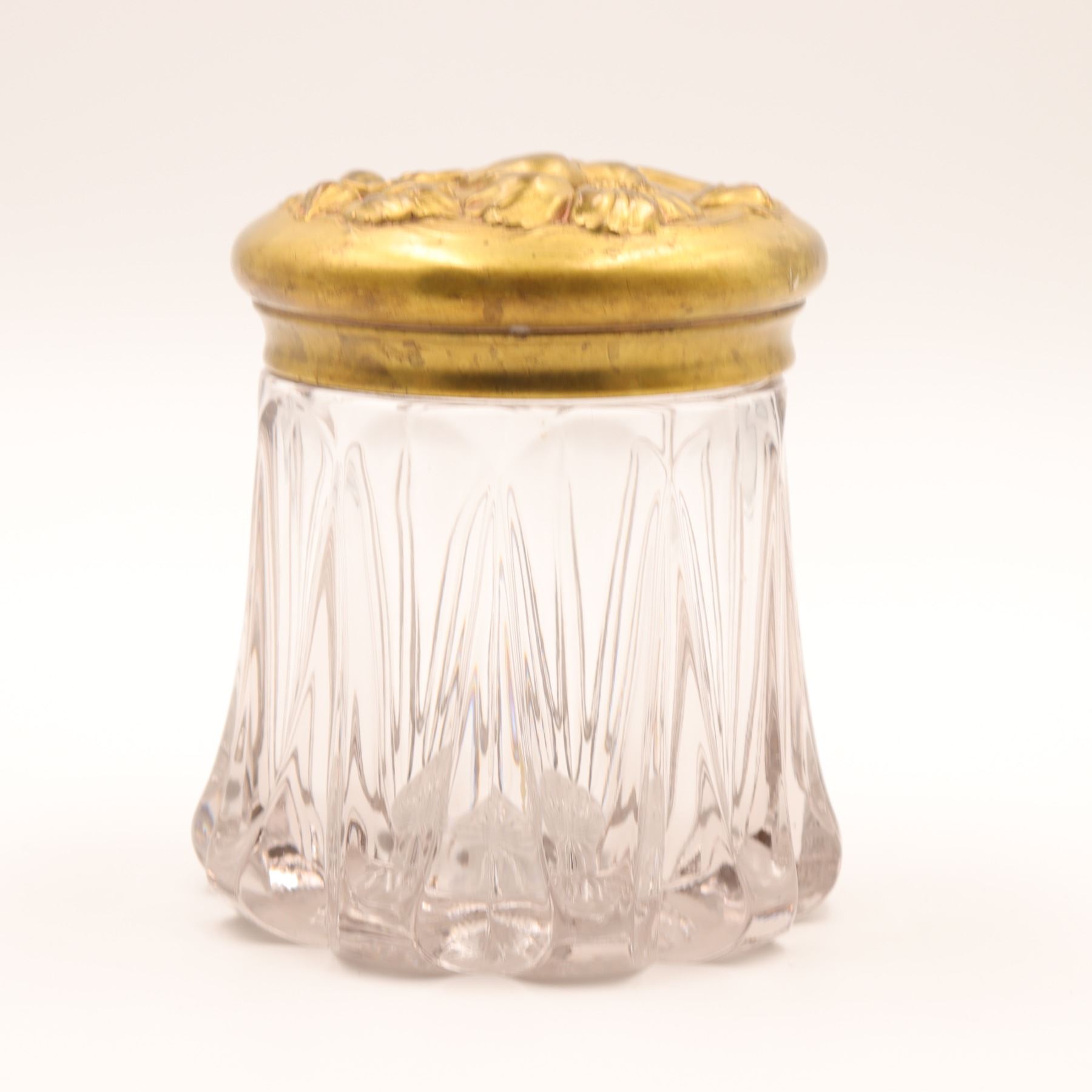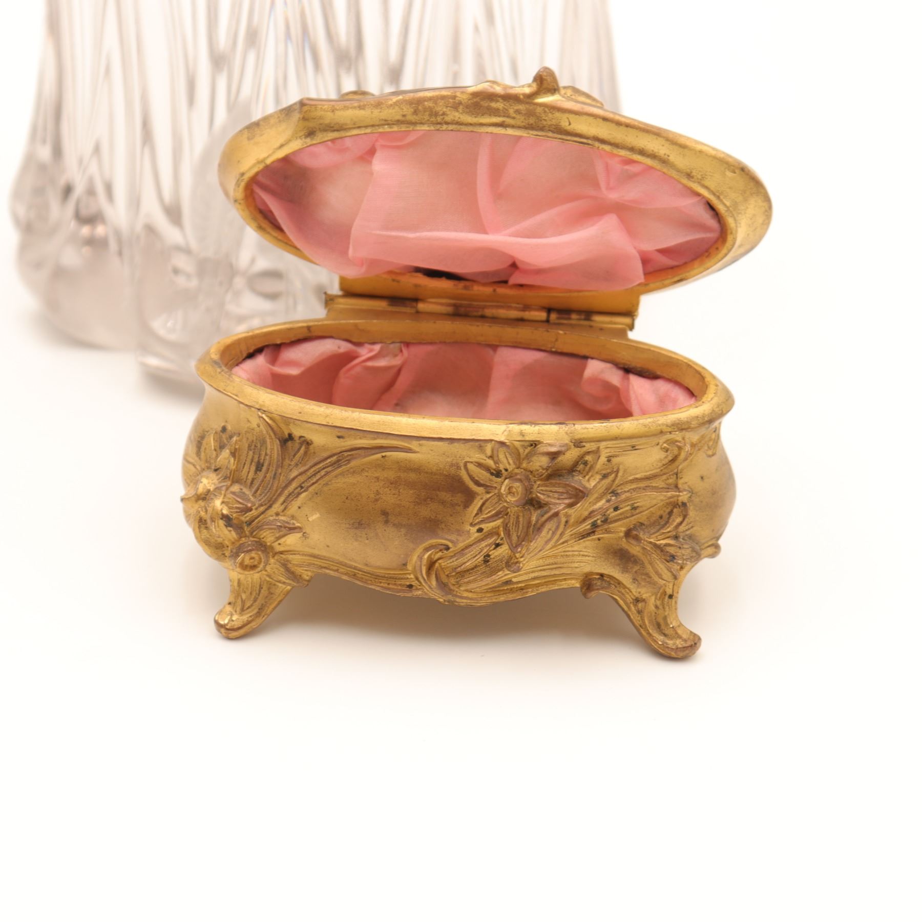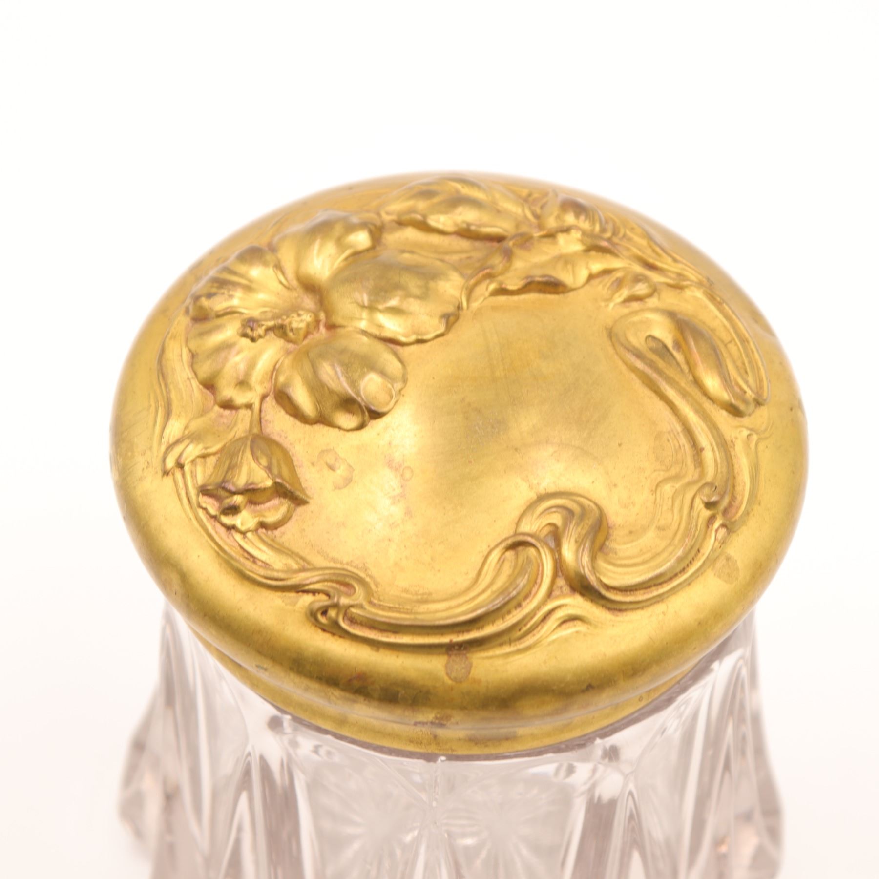 Charming mixed group of five early 20th-century vanity and decorative accessories, comprising an Art Nouveau clear pressed-glass dresser jar with repoussé floral gilt-metal lid, a small gilt-metal jewellery or trinket box with scrolling floral decoration and pink fabric lining, a Continental porcelain miniature vase painted with a Rococo-inspired pastoral courting scene, an opaline-blue milk glass powder shaker with hand-painted floral decoration and original pierced tinned-metal cap, and a small glass perfume bottle encased in fine petit point embroidery with gilt filigree shoulders and cap. A visually appealing assortment reflecting the romantic and decorative taste of the early 20th century, suitable for vanity display, collecting, or decorative interior use.