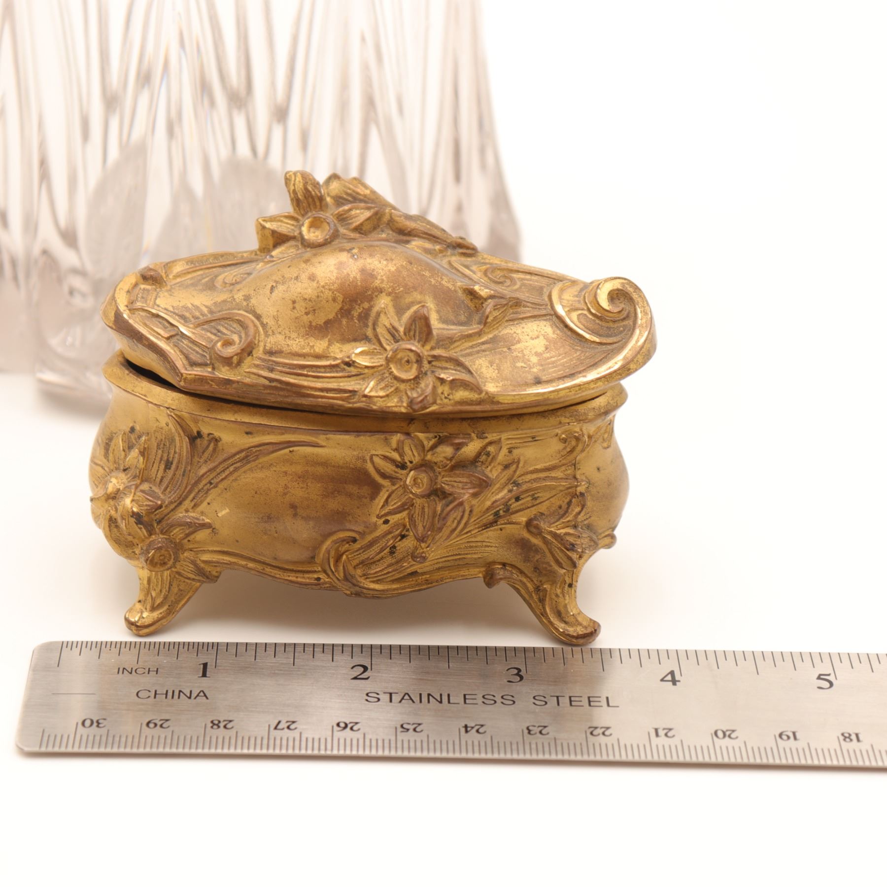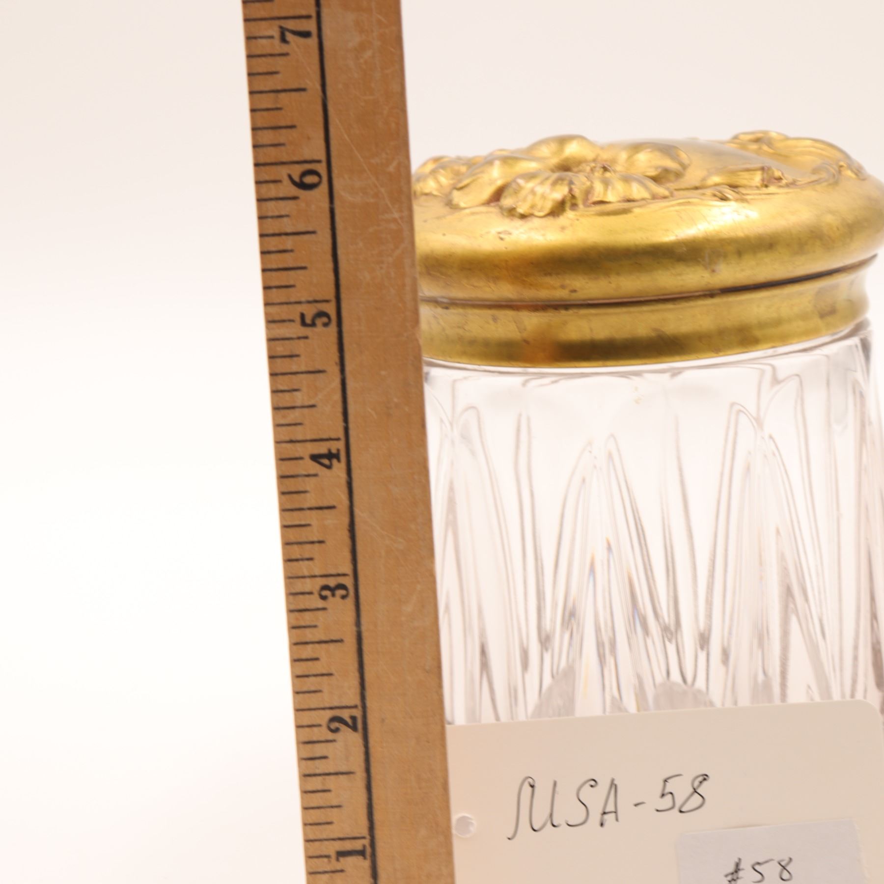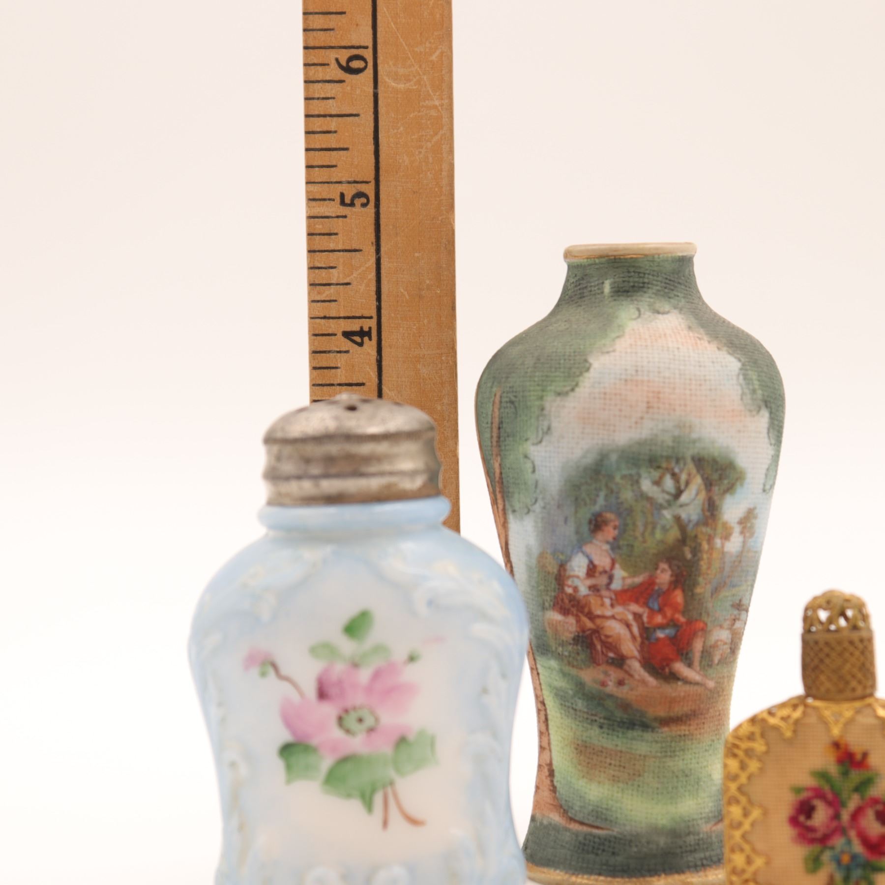 Charming mixed group of five early 20th-century vanity and decorative accessories, comprising an Art Nouveau clear pressed-glass dresser jar with repoussé floral gilt-metal lid, a small gilt-metal jewellery or trinket box with scrolling floral decoration and pink fabric lining, a Continental porcelain miniature vase painted with a Rococo-inspired pastoral courting scene, an opaline-blue milk glass powder shaker with hand-painted floral decoration and original pierced tinned-metal cap, and a small glass perfume bottle encased in fine petit point embroidery with gilt filigree shoulders and cap. A visually appealing assortment reflecting the romantic and decorative taste of the early 20th century, suitable for vanity display, collecting, or decorative interior use.