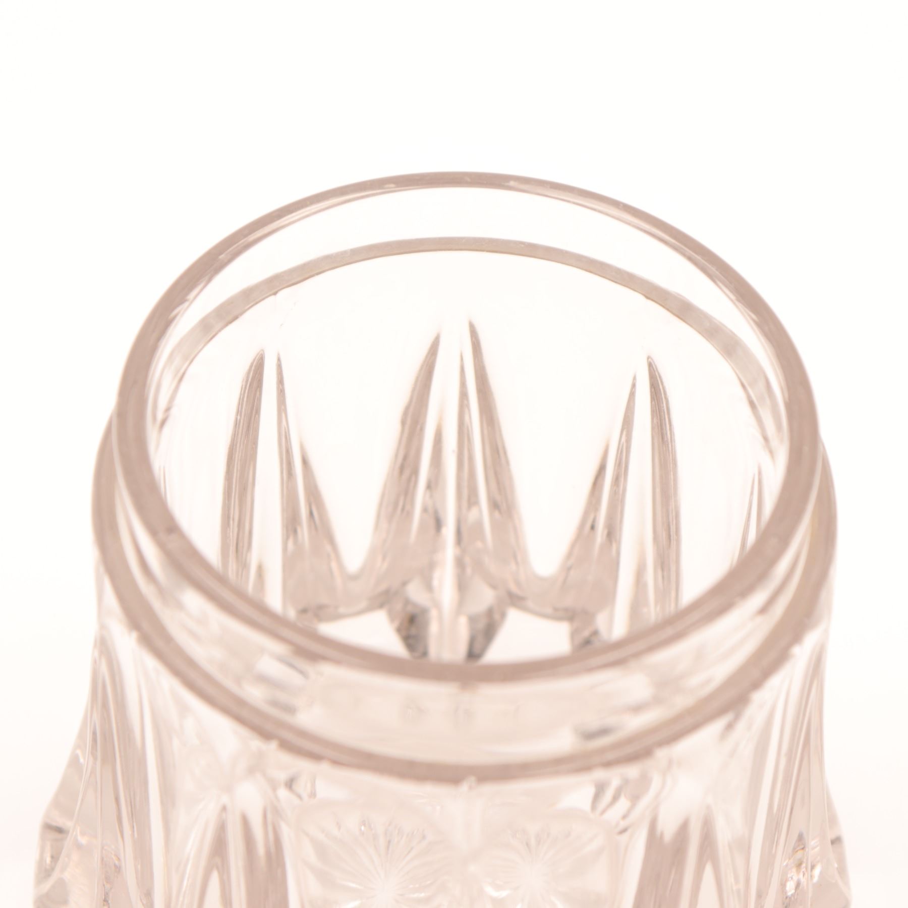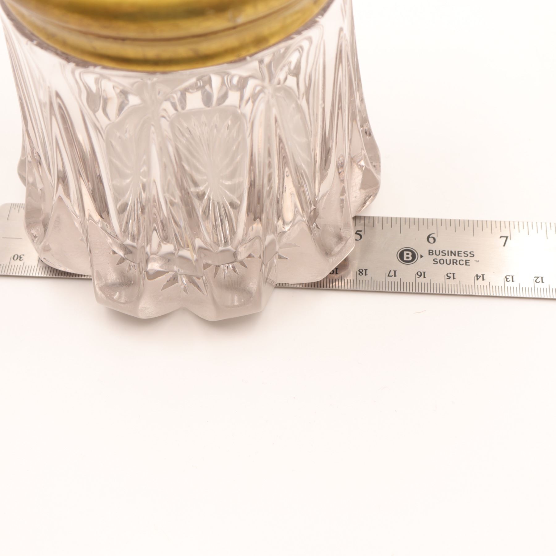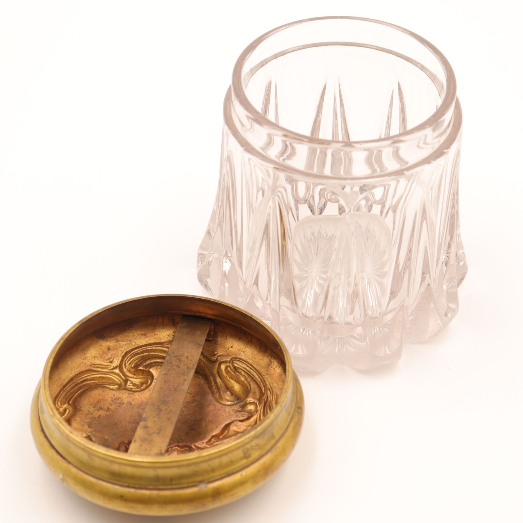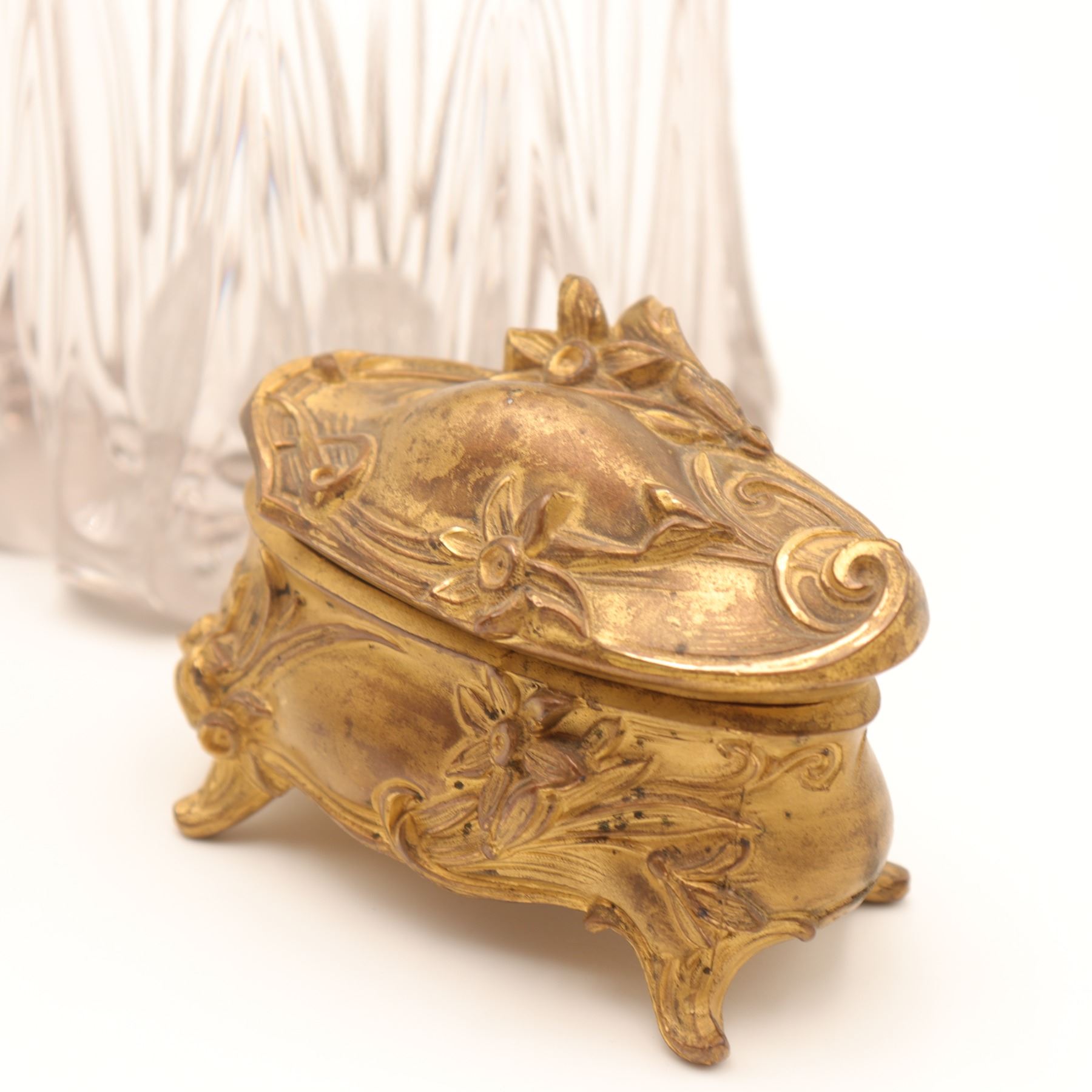 Charming mixed group of five early 20th-century vanity and decorative accessories, comprising an Art Nouveau clear pressed-glass dresser jar with repoussé floral gilt-metal lid, a small gilt-metal jewellery or trinket box with scrolling floral decoration and pink fabric lining, a Continental porcelain miniature vase painted with a Rococo-inspired pastoral courting scene, an opaline-blue milk glass powder shaker with hand-painted floral decoration and original pierced tinned-metal cap, and a small glass perfume bottle encased in fine petit point embroidery with gilt filigree shoulders and cap. A visually appealing assortment reflecting the romantic and decorative taste of the early 20th century, suitable for vanity display, collecting, or decorative interior use.