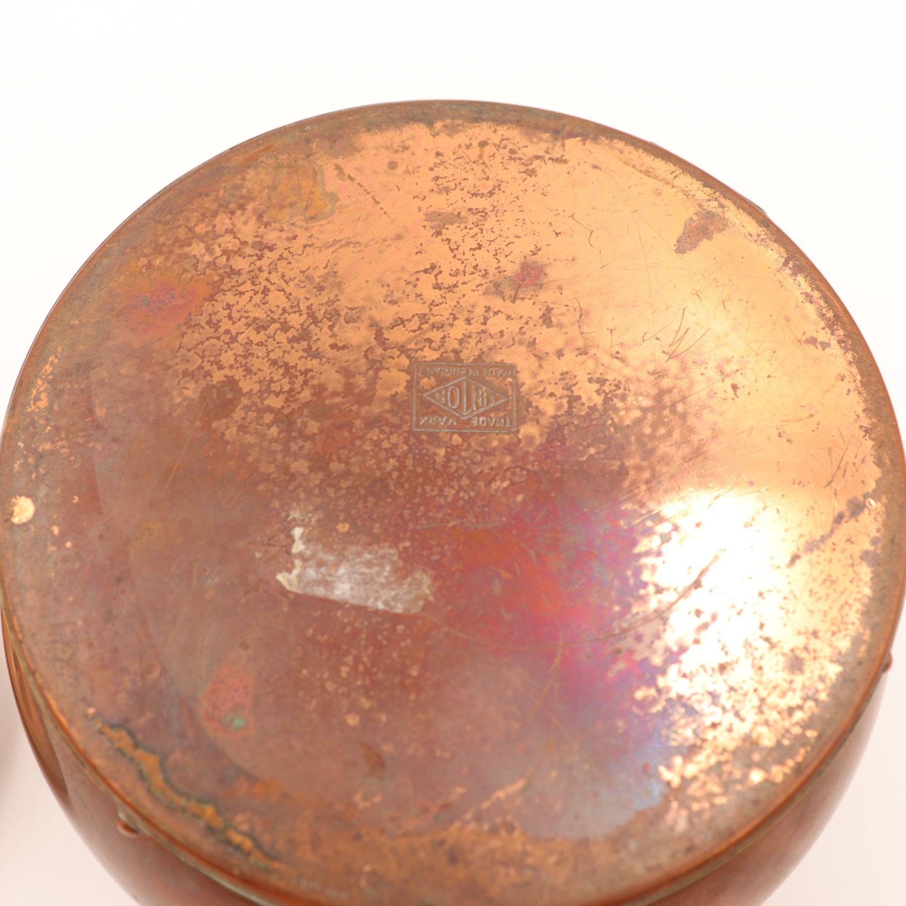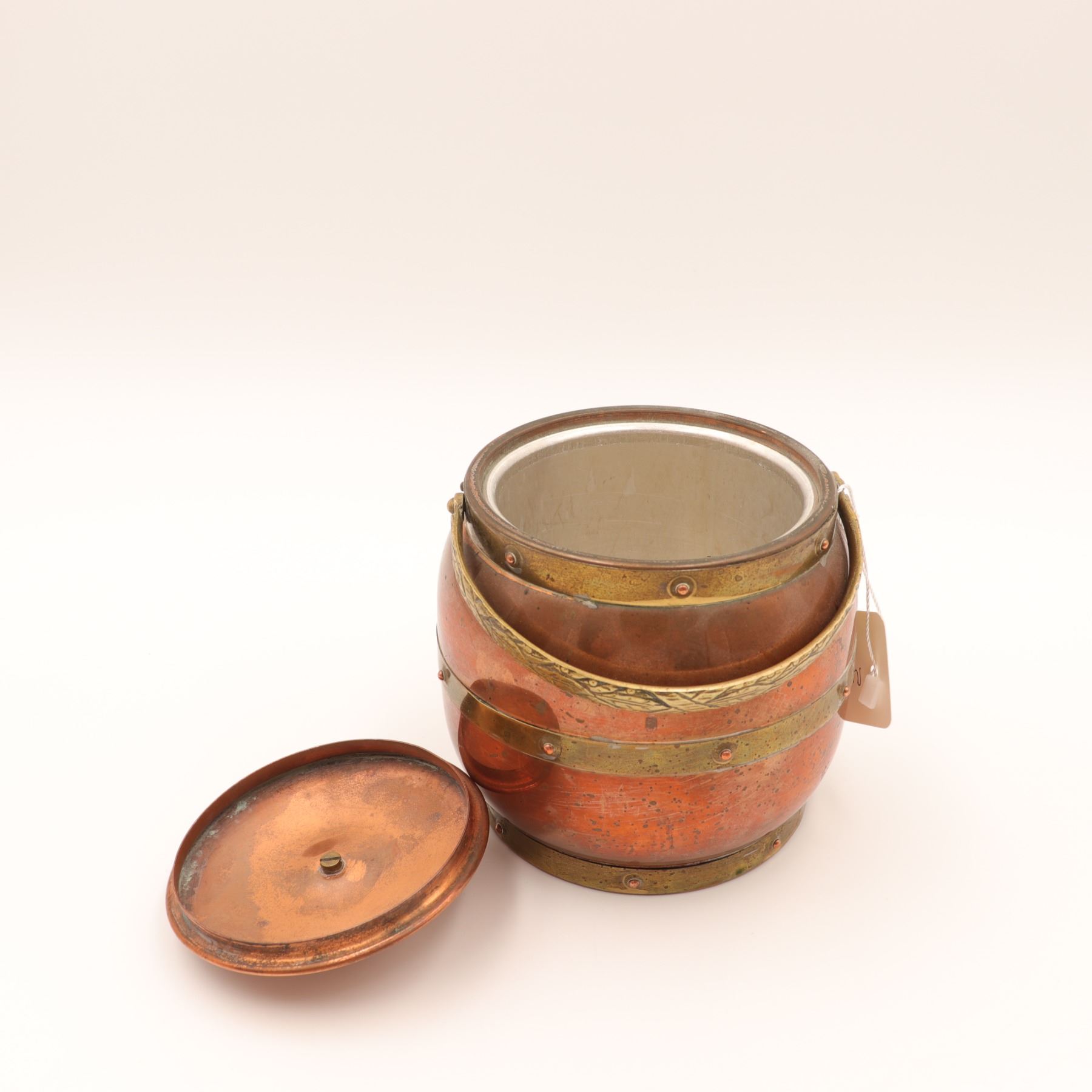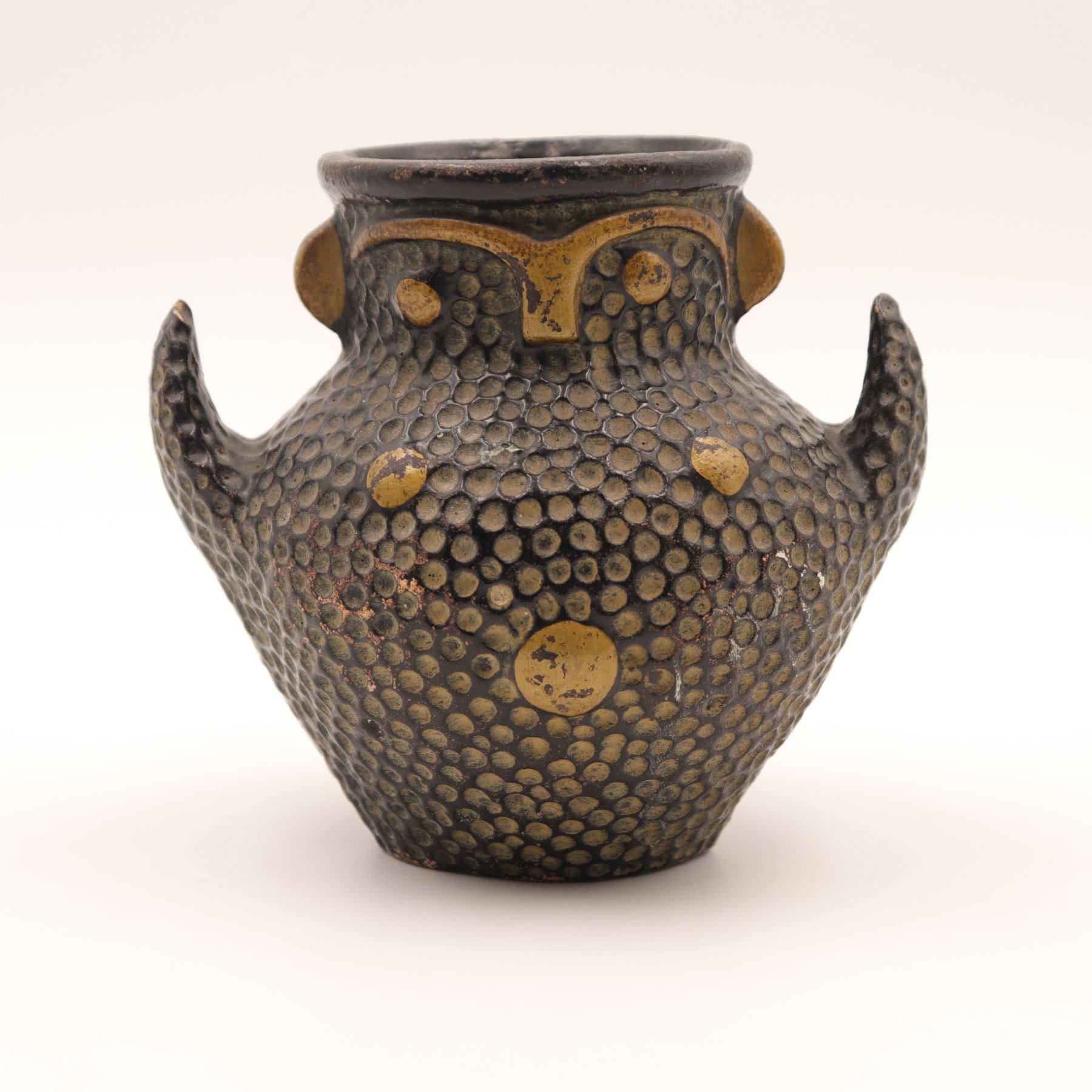 Overall good vintage condition with expected age and handling wear. The owl-form pottery vase shows scattered small rubs and minor glaze losses to high points and base edge, with no visible chips, cracks, or repairs noted. The Linton ice bucket has surface wear, small dents, scratches, spotting, tarnish, oxidation and patina to the metalwork, with minor verdigris near some rivets; lid fits well and the glass liner is present, with light scratching and clouding from use but no cracks or chips observed. The Aynsley vase is in very good condition with no chips or cracks seen, and only minor light surface wear and slight rubbing to the gilding.